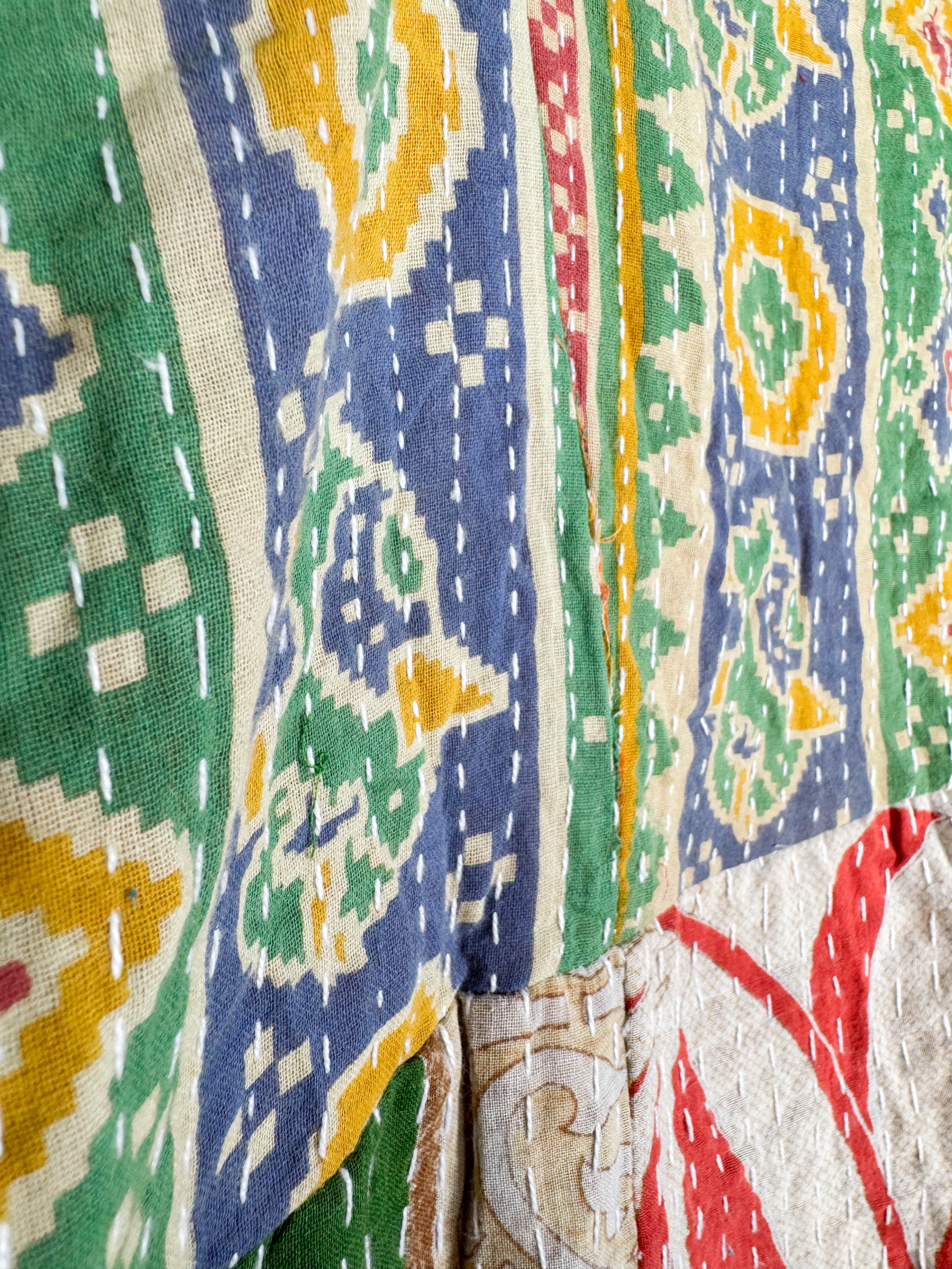 Envelop yourself in the artistry of this vintage Kantha dress. Each running stitch tells a story across the lightweight fabric, creating a unique texture and a beautifully airy feel. A long slit graces the left side, adding a touch of distinctive charm. Experience the seamless harmony of traditional hand craftsmanship and everyday ease to enhance your Playful feminine essence every day!