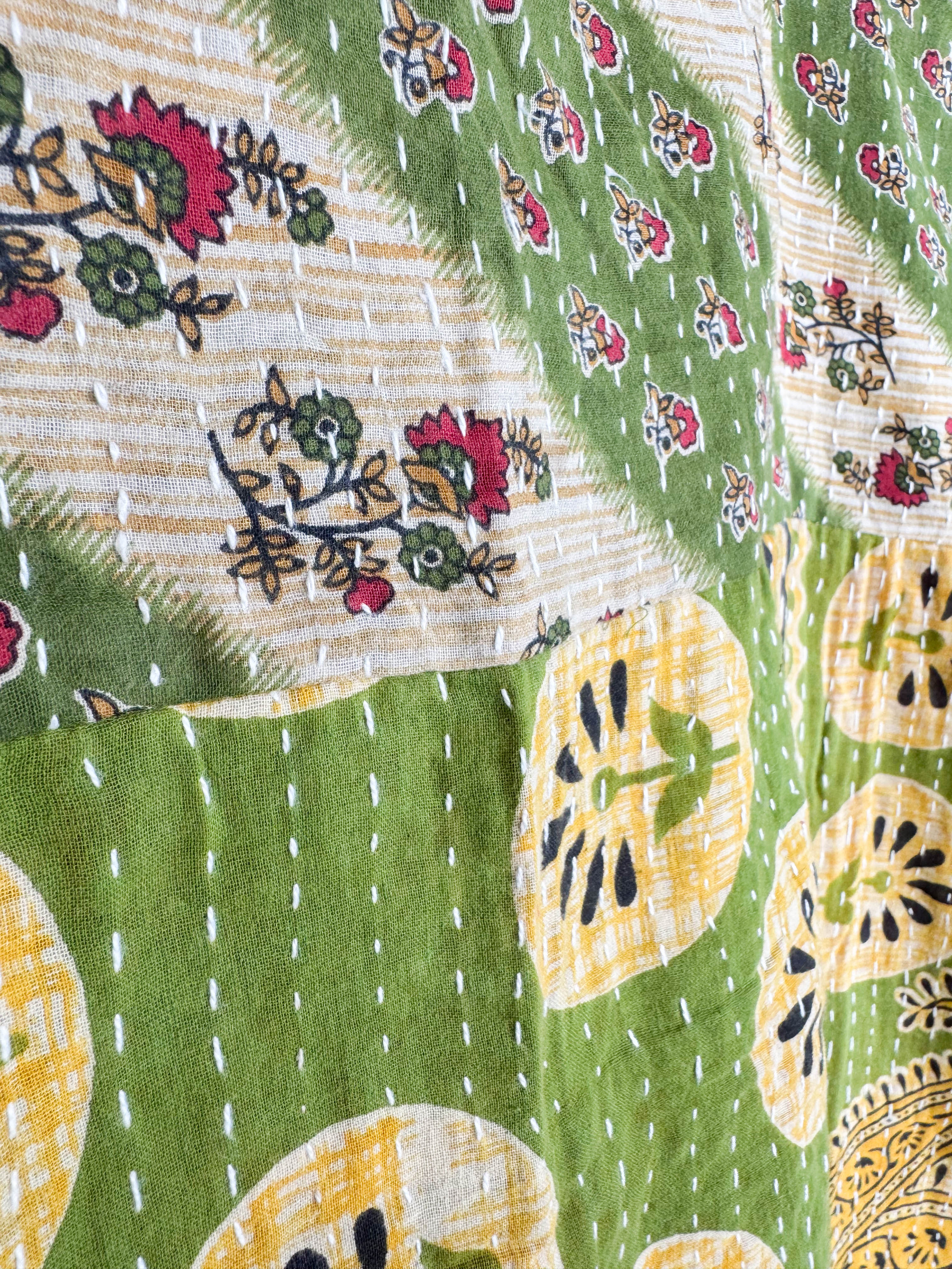 Envelop yourself in the artistry of this vintage Kantha dress. Each running stitch tells a story across the lightweight fabric, creating a unique texture and a beautifully airy feel. A long slit graces the left side, adding a touch of distinctive charm. Experience the seamless harmony of traditional hand craftsmanship and everyday ease to enhance your Playful feminine essence every day!