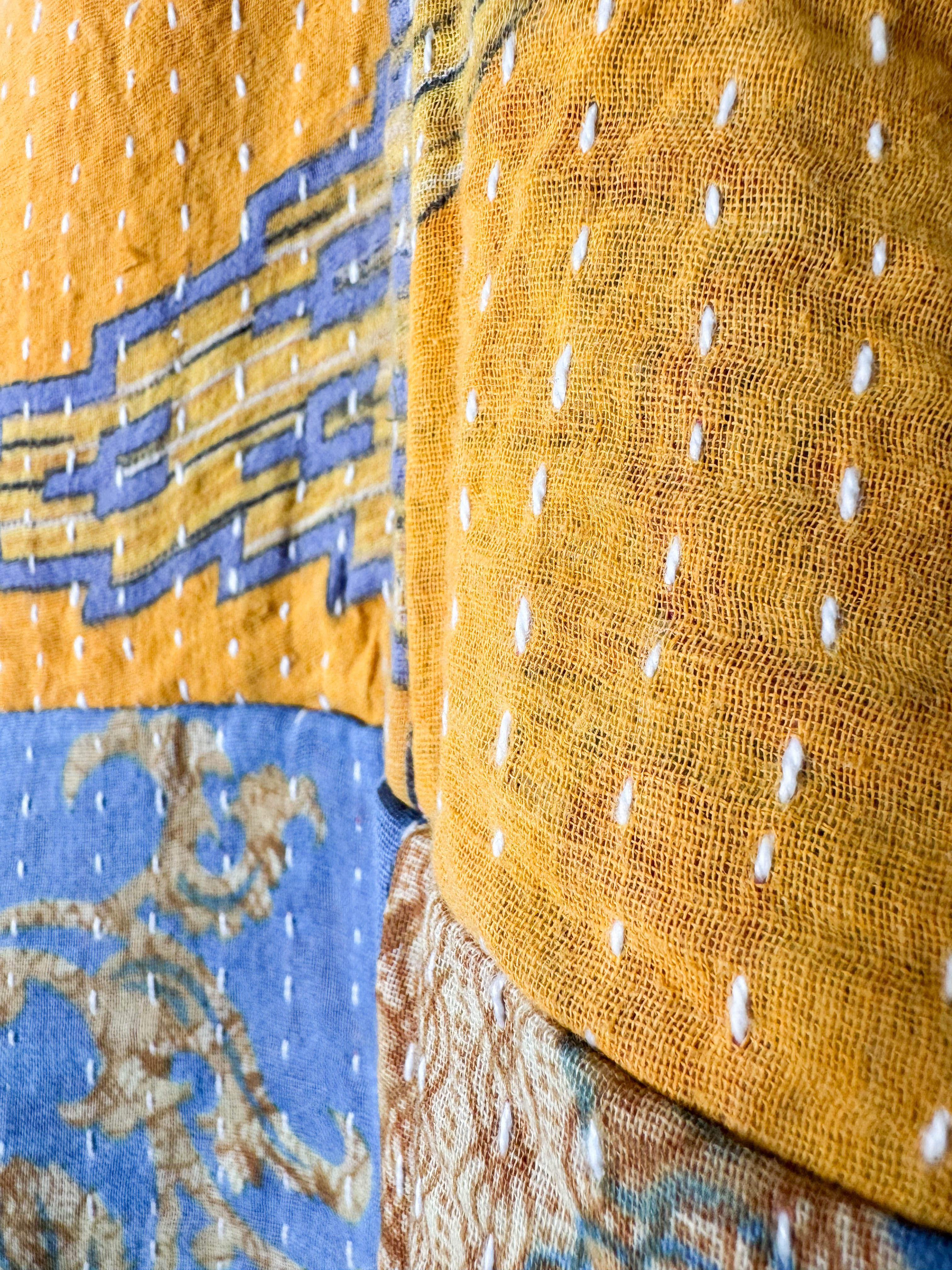 Envelop yourself in the artistry of this vintage Kantha dress. Each running stitch tells a story across the lightweight fabric, creating a unique texture and a beautifully airy feel. A long slit graces the left side, adding a touch of distinctive charm. Experience the seamless harmony of traditional hand craftsmanship and everyday ease to enhance your Playful feminine essence every day!
