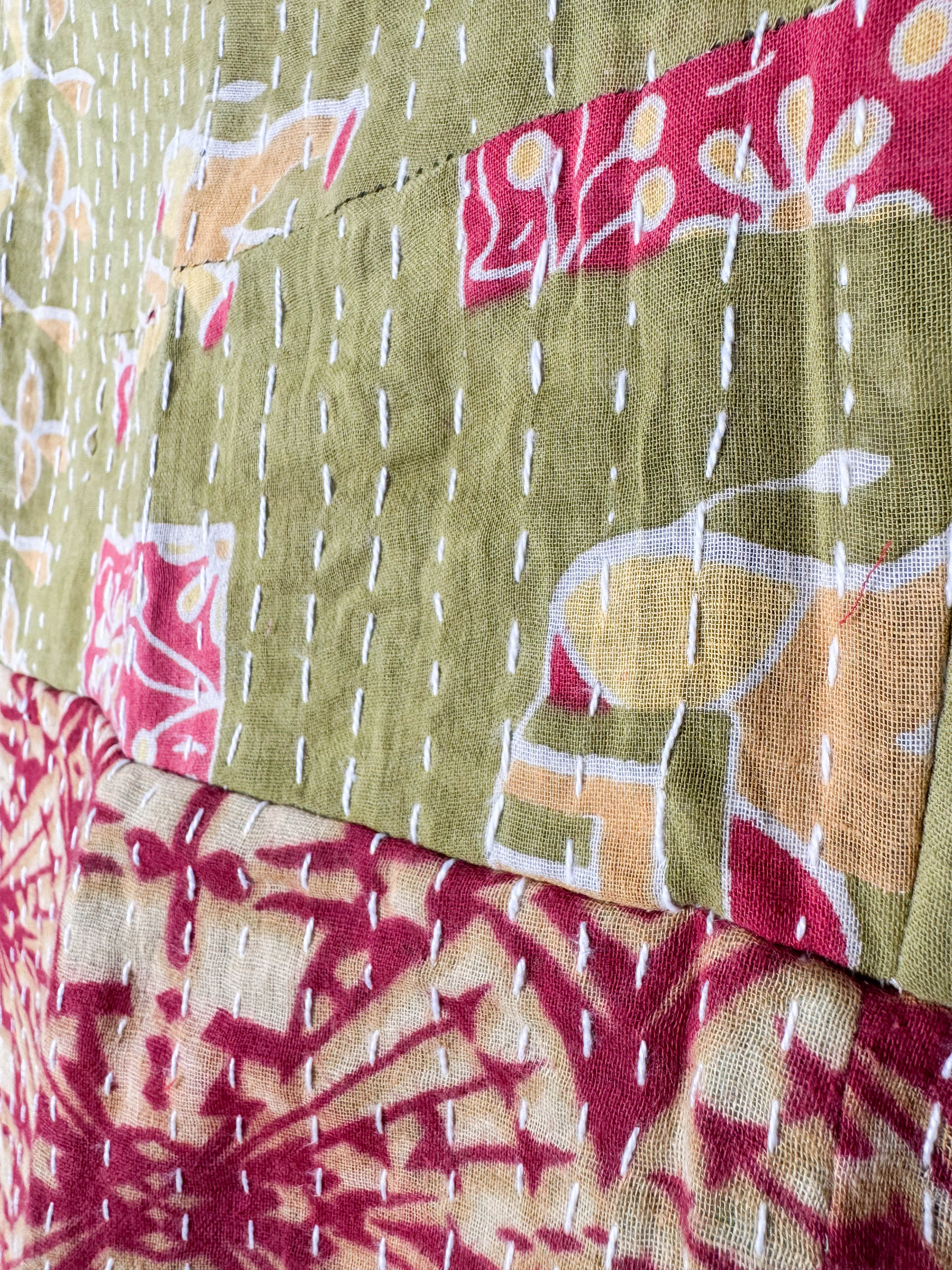Envelop yourself in the artistry of this vintage Kantha dress. Each running stitch tells a story across the lightweight fabric, creating a unique texture and a beautifully airy feel. A long slit graces the left side, adding a touch of distinctive charm. Experience the seamless harmony of traditional hand craftsmanship and everyday ease to enhance your Playful feminine essence every day!