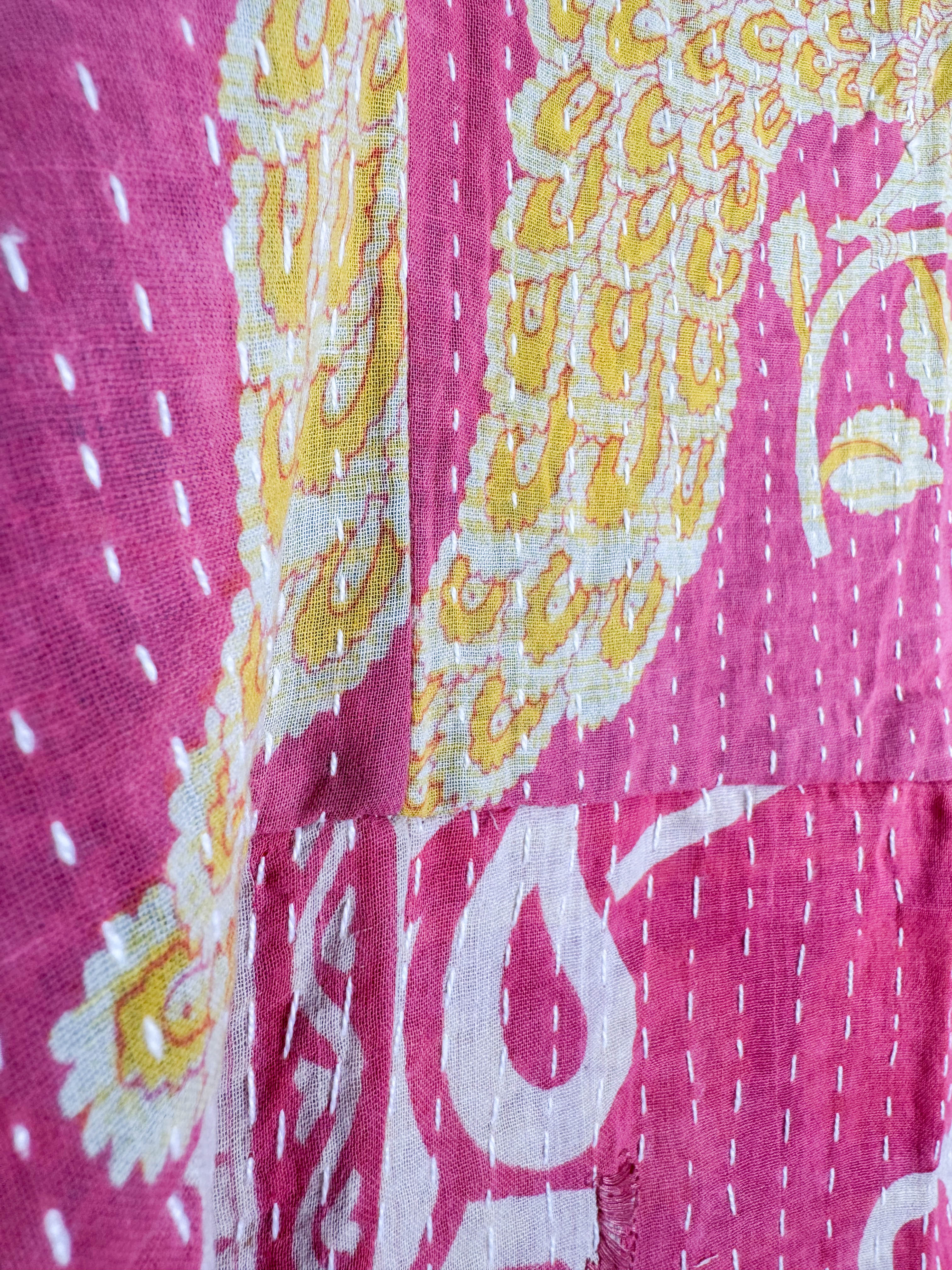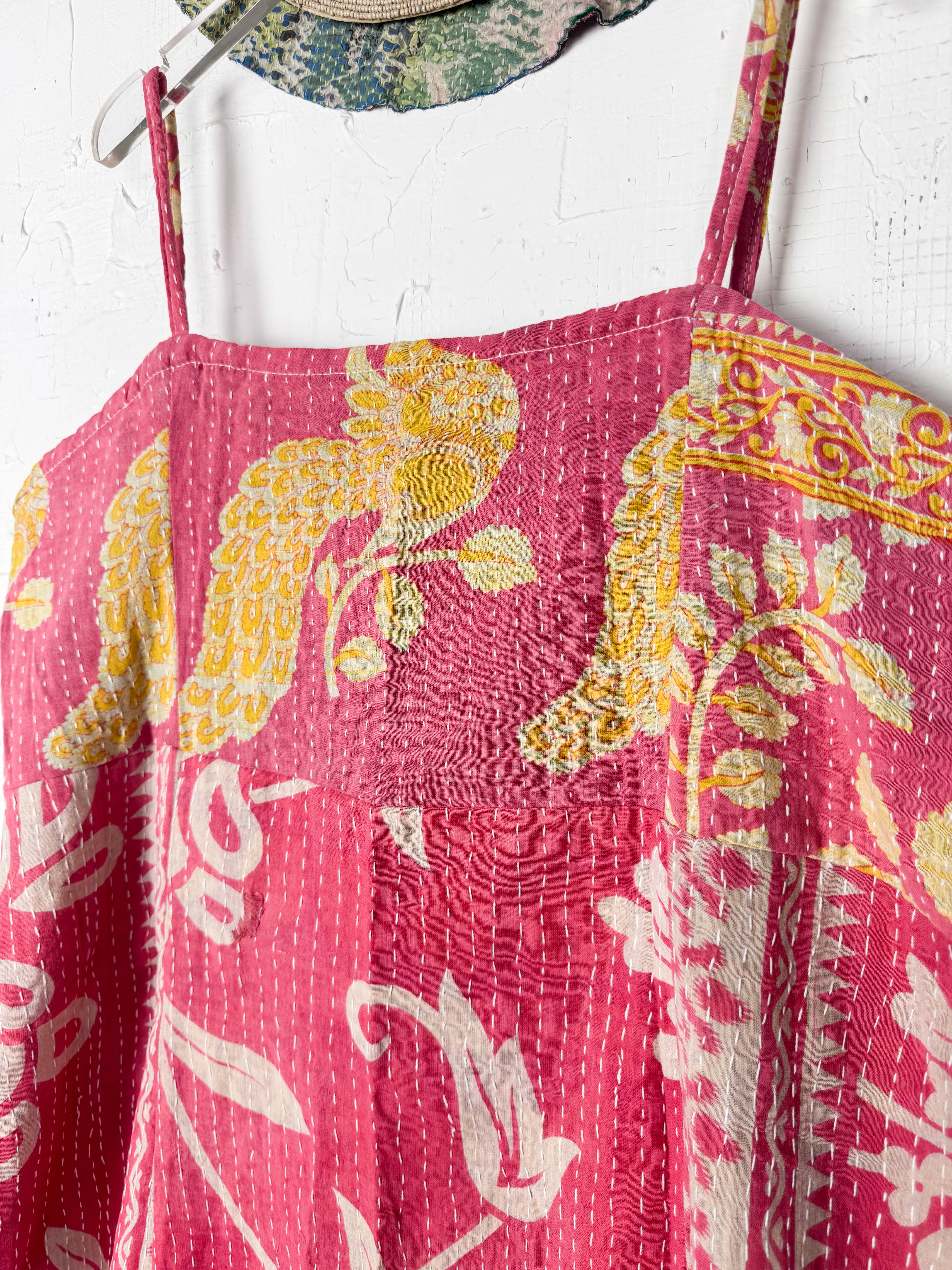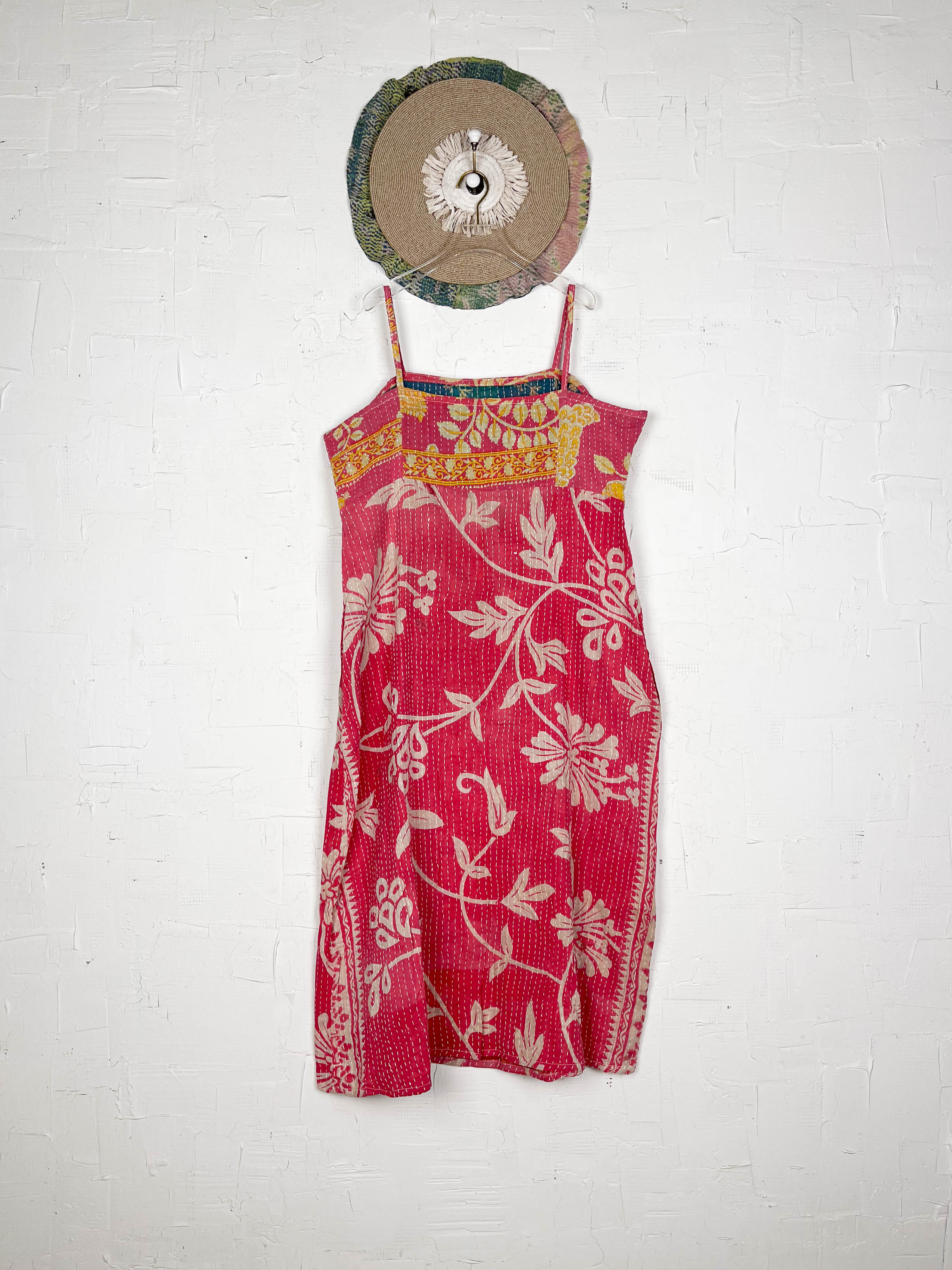 Envelop yourself in the artistry of this vintage Kantha dress. Each running stitch tells a story across the lightweight fabric, creating a unique texture and a beautifully airy feel. A long slit graces the left side, adding a touch of distinctive charm. Experience the seamless harmony of traditional hand craftsmanship and everyday ease to enhance your Playful feminine essence every day!