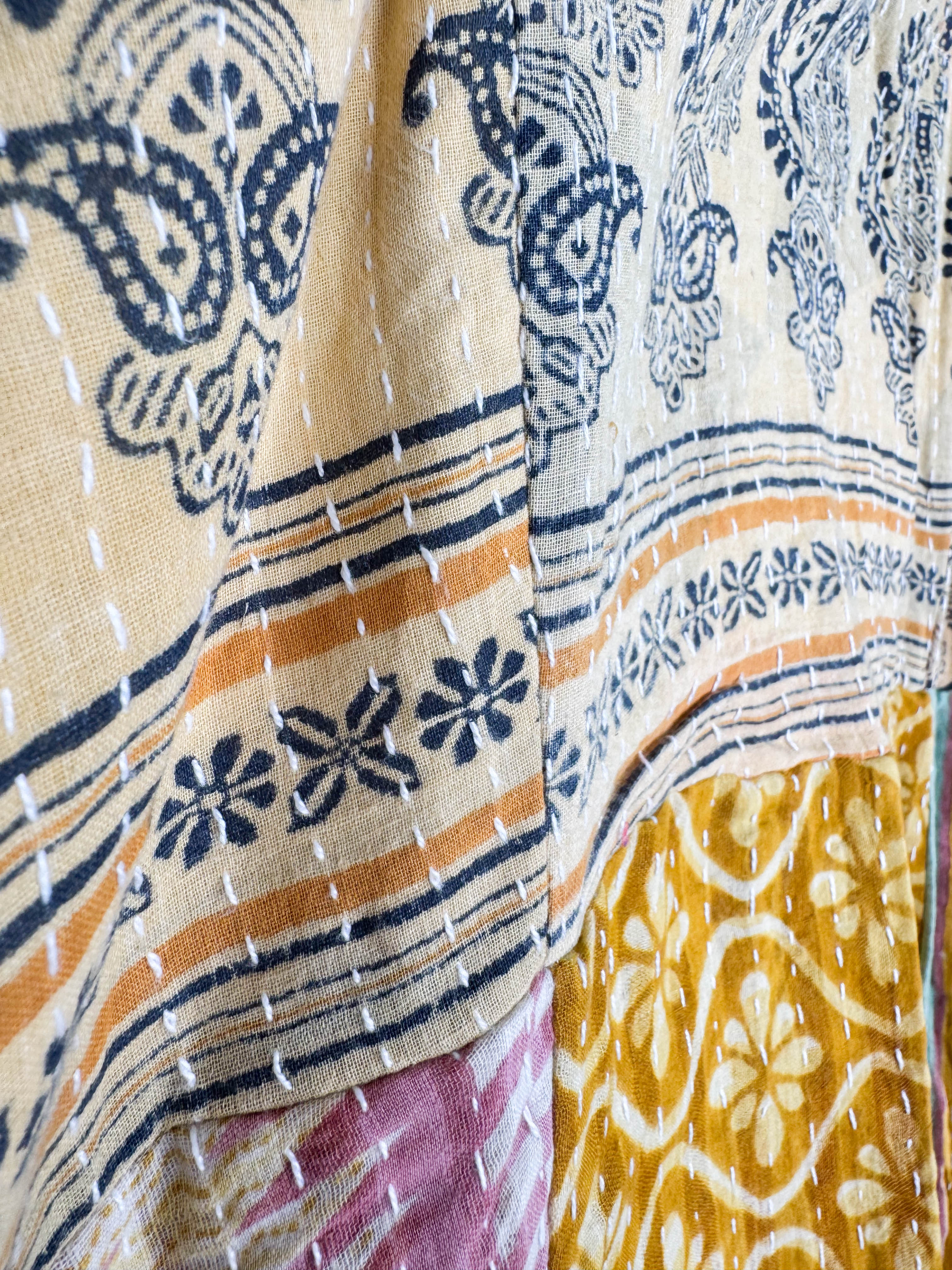 Envelop yourself in the artistry of this vintage Kantha dress. Each running stitch tells a story across the lightweight fabric, creating a unique texture and a beautifully airy feel. A long slit graces the left side, adding a touch of distinctive charm. Experience the seamless harmony of traditional hand craftsmanship and everyday ease to enhance your Playful feminine essence every day!
