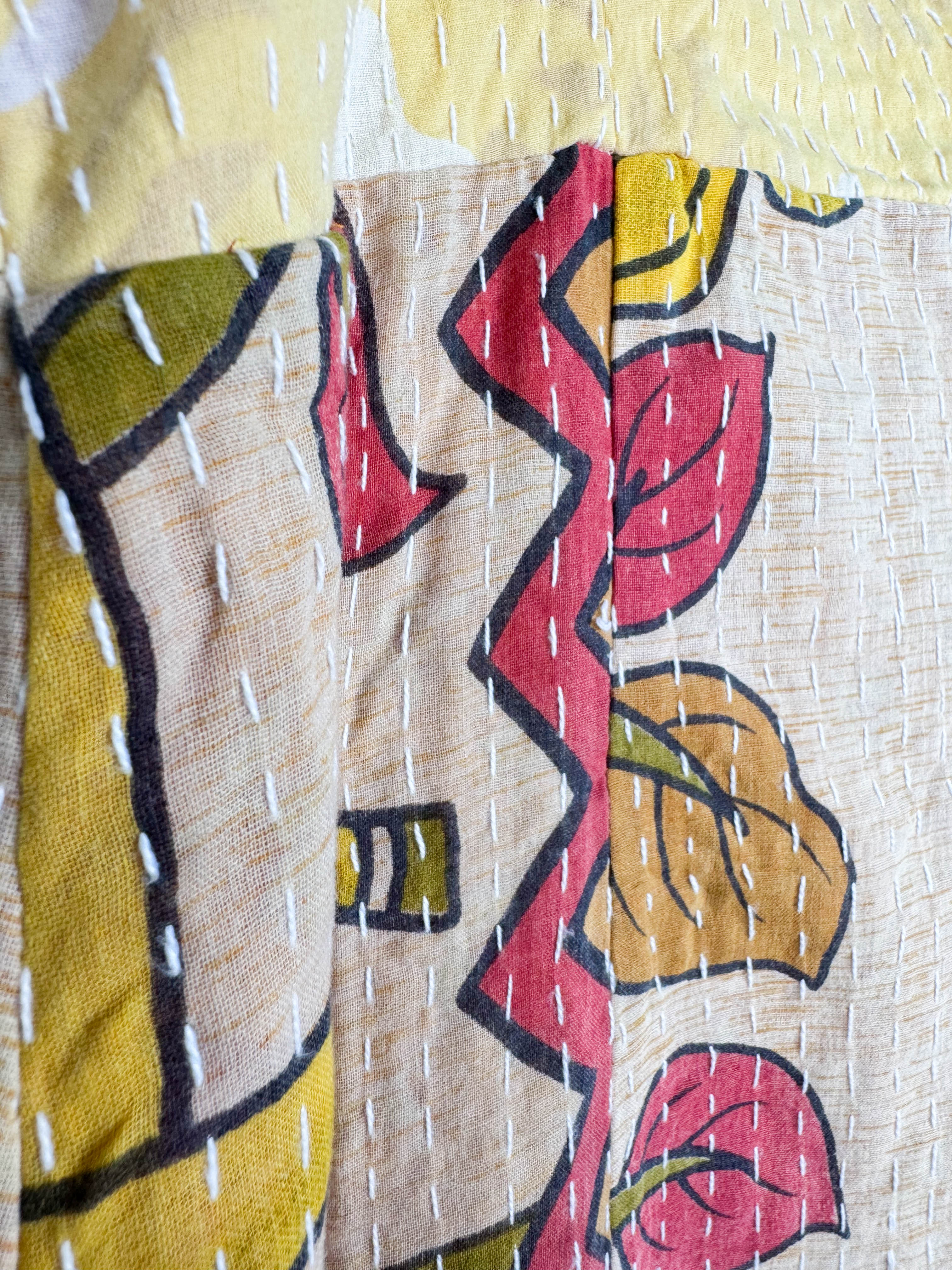 Envelop yourself in the artistry of this vintage Kantha dress. Each running stitch tells a story across the lightweight fabric, creating a unique texture and a beautifully airy feel. A long slit graces the left side, adding a touch of distinctive charm. Experience the seamless harmony of traditional hand craftsmanship and everyday ease to enhance your Playful feminine essence every day!