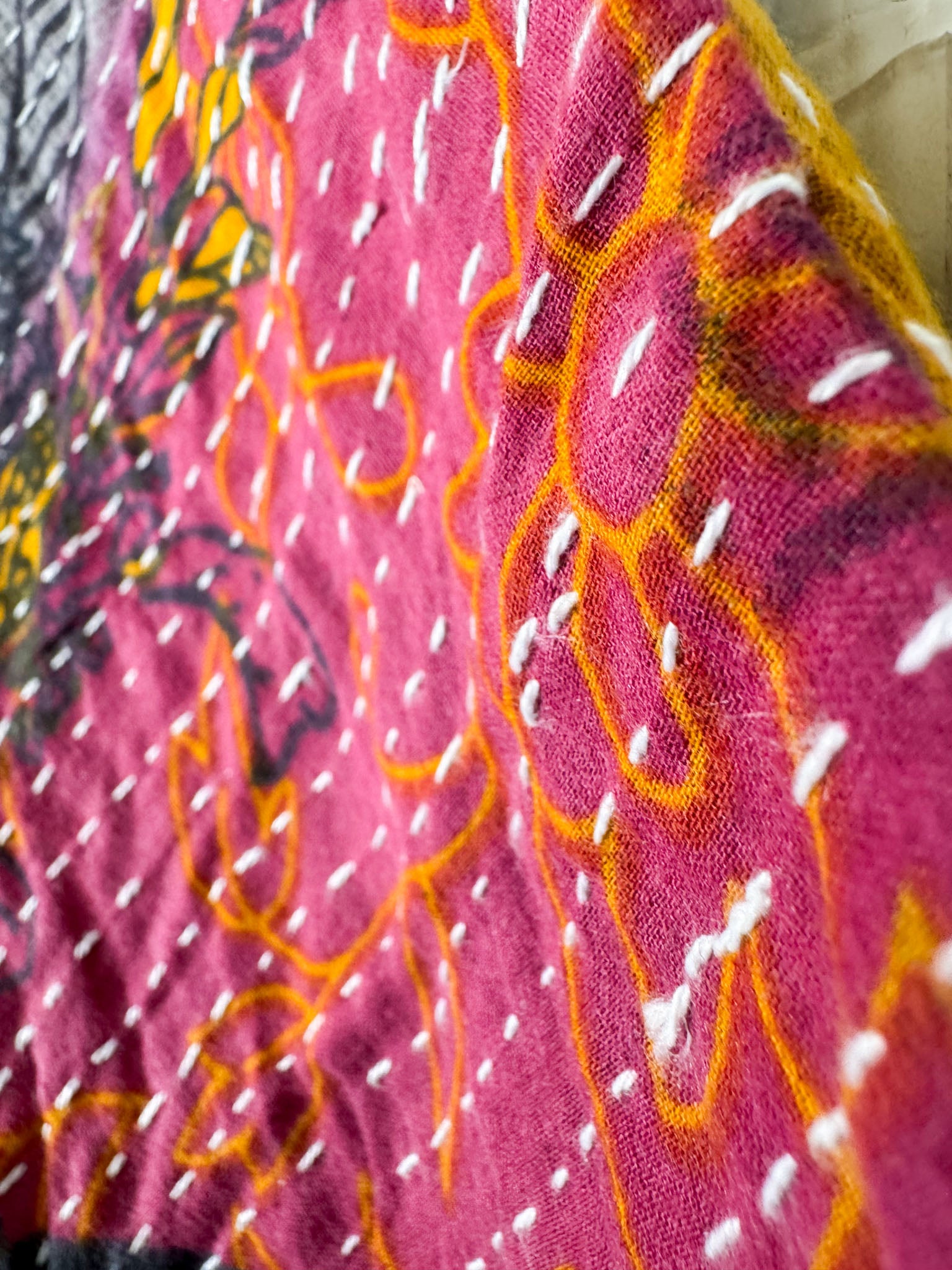 Khanta: this is Kantha stitches all over the fabric. this kantha work is done by layering 2 or more cotton sarees over each other and stitched them all over the span to get the desired thickness depending upon the number of sarees put in layers, the texture of the stitch all over and the floral prints of cotton make it unique