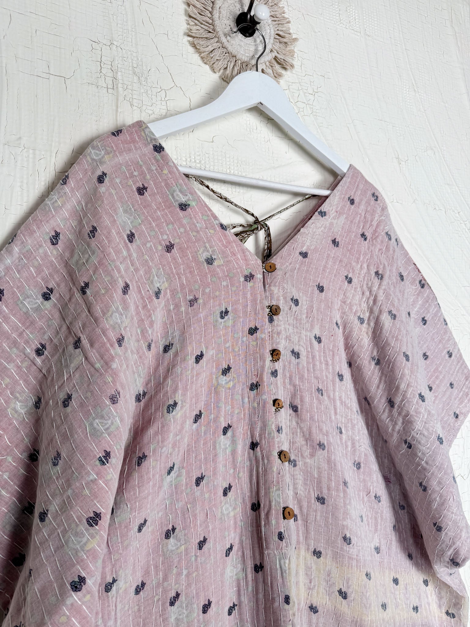 Khanta: this is Kantha stitches all over the fabric. this kantha work is done by layering 2 or more cotton sarees over each other and stitched them all over the span to get the desired thickness depending upon the number of sarees put in layers, the texture of the stitch all over and the floral prints of cotton make it unique