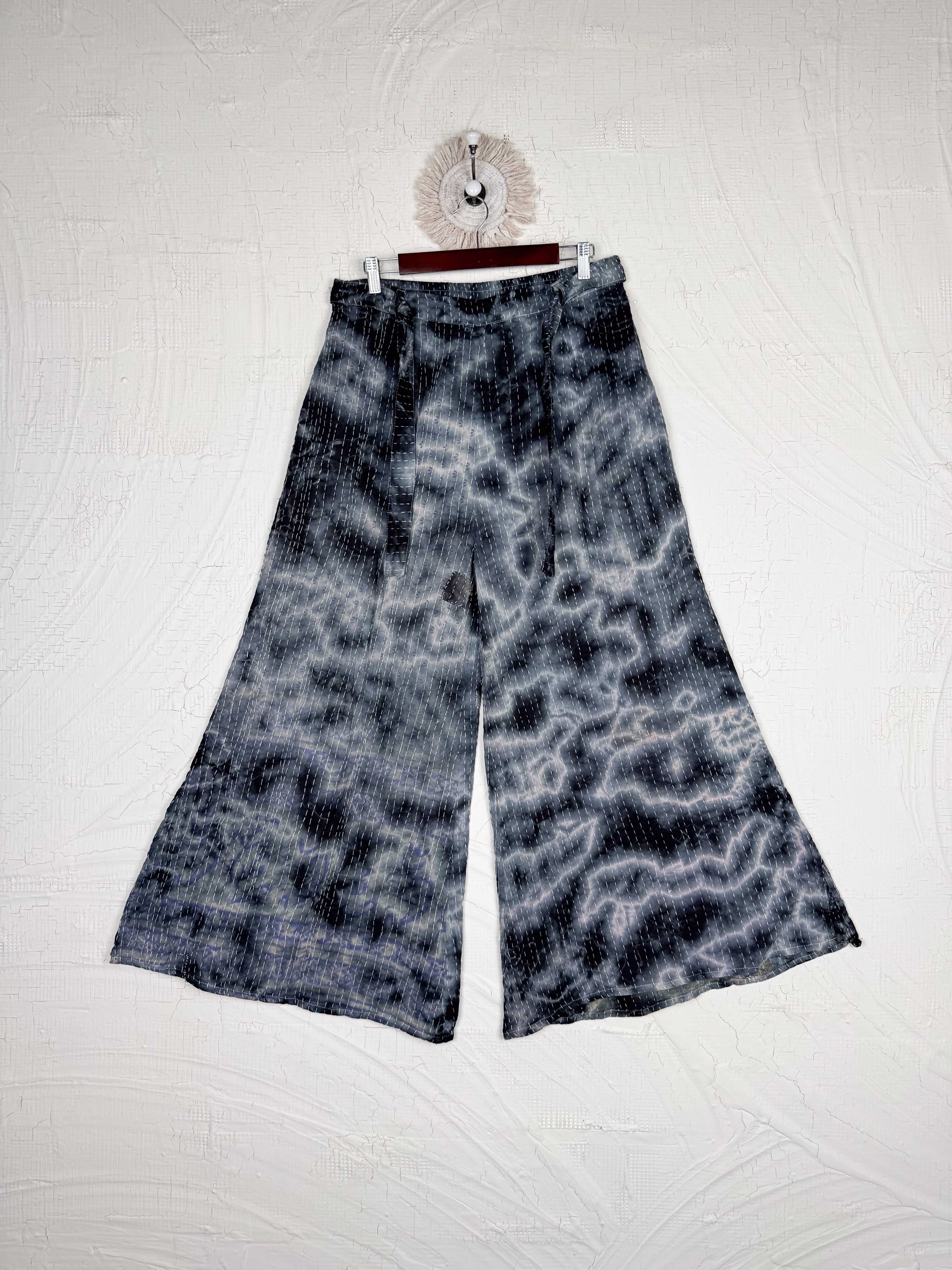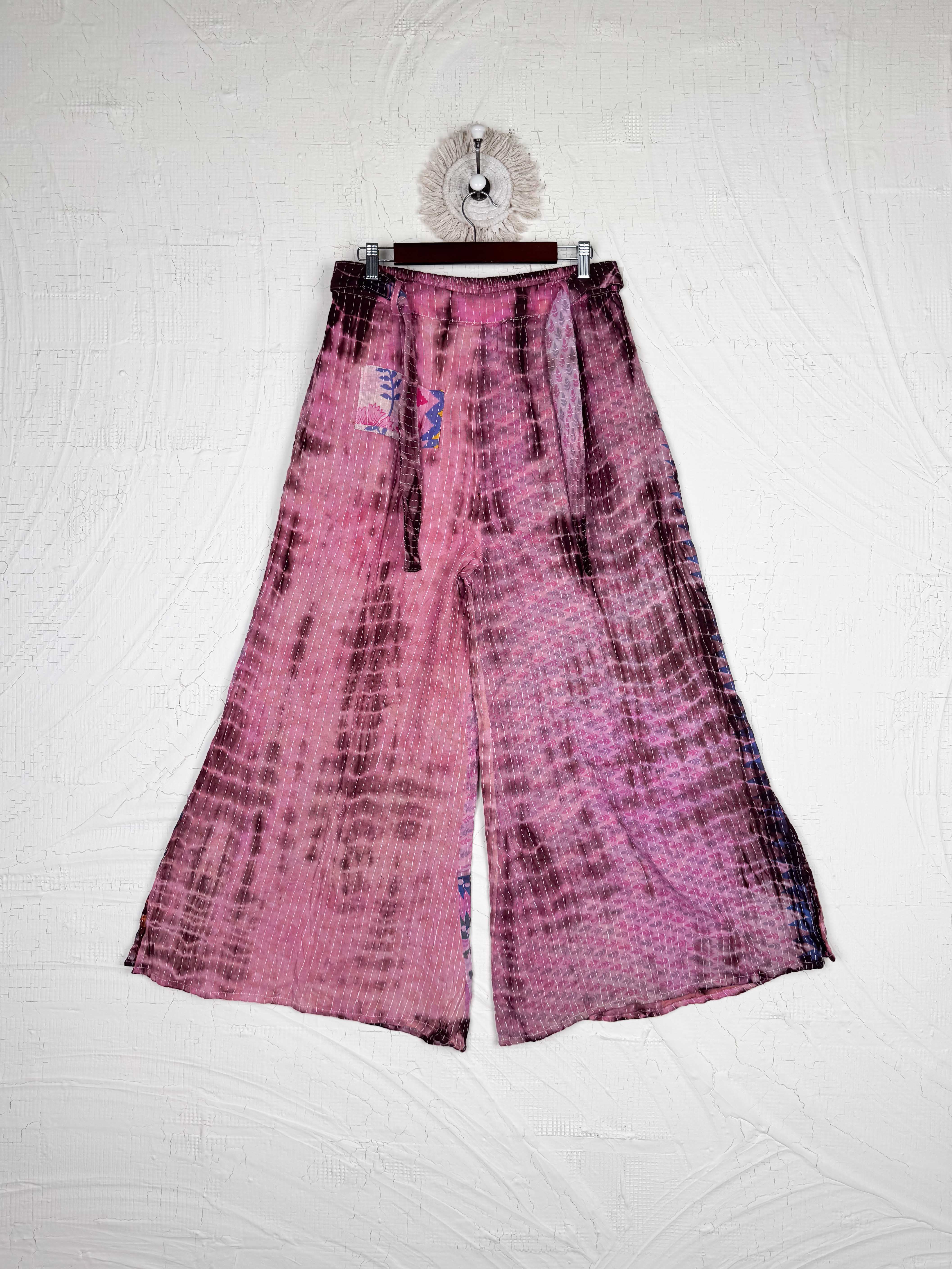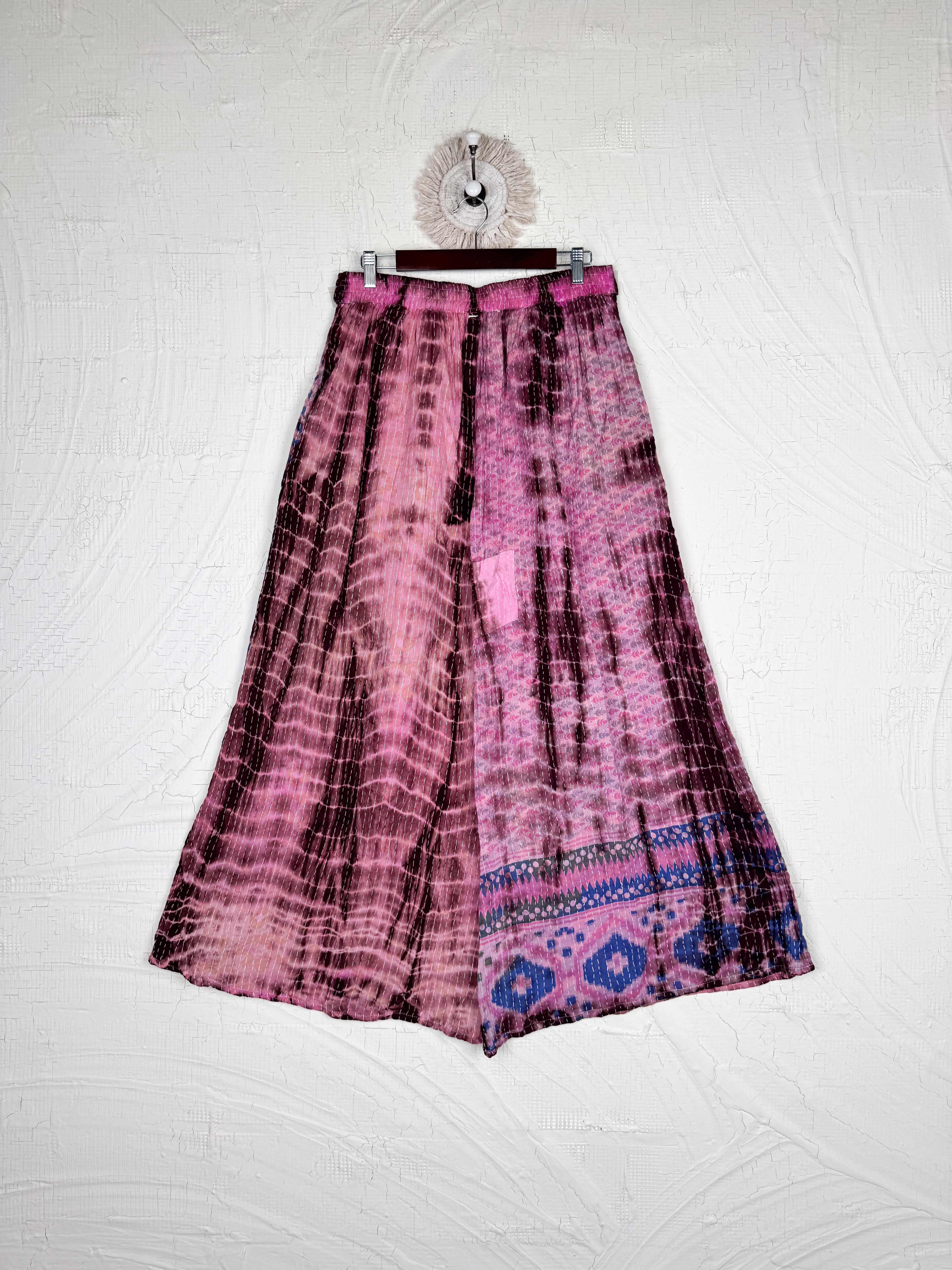 Imagine having pants that whisper tales of the past. Crafted from vintage Kantha, each pair tells its own story through a rich tapestry of repurposed cotton sarees. Feel the unique texture and beautiful flow created by layers of fabric lovingly stitched together with traditional running stitches.