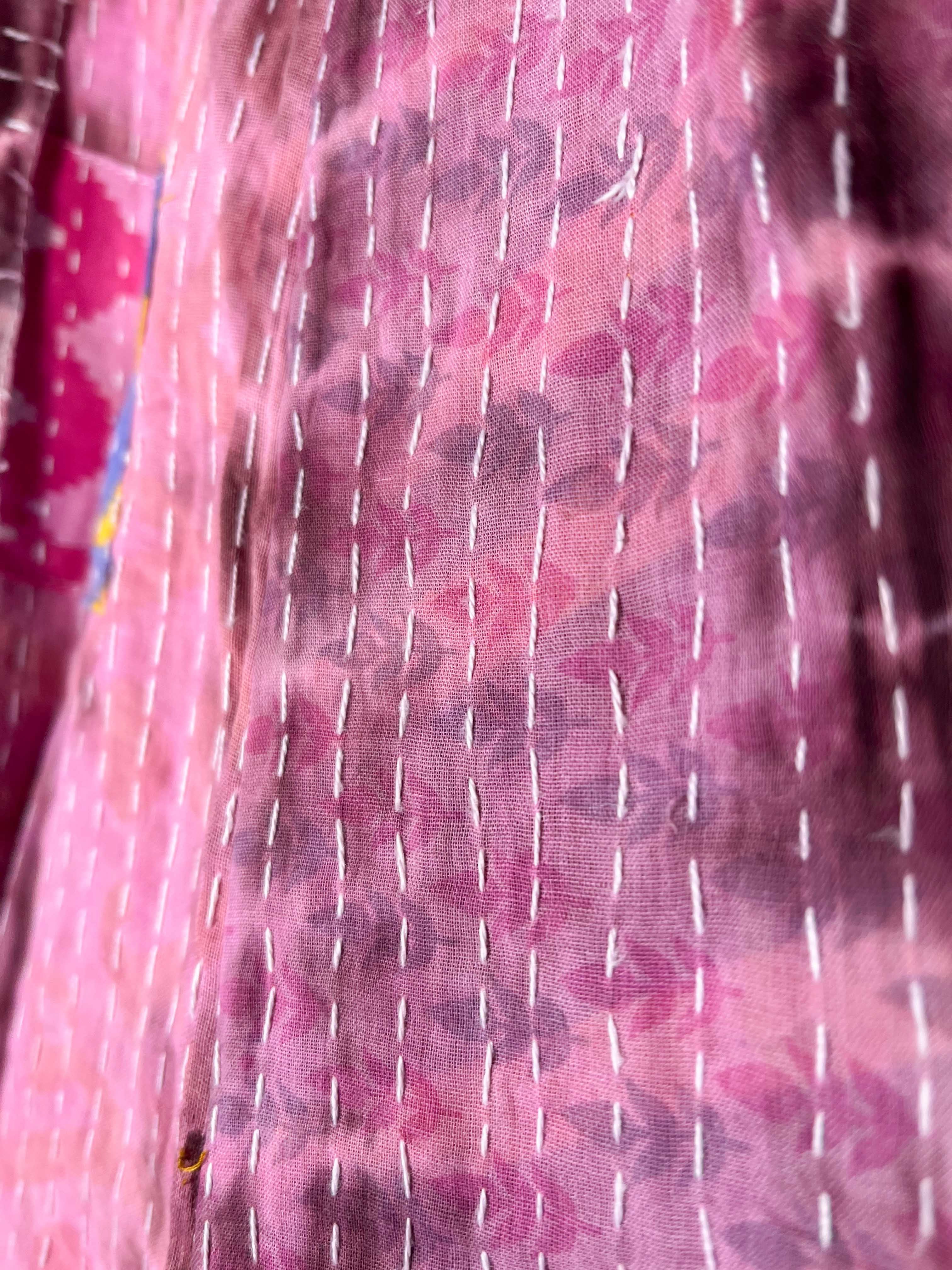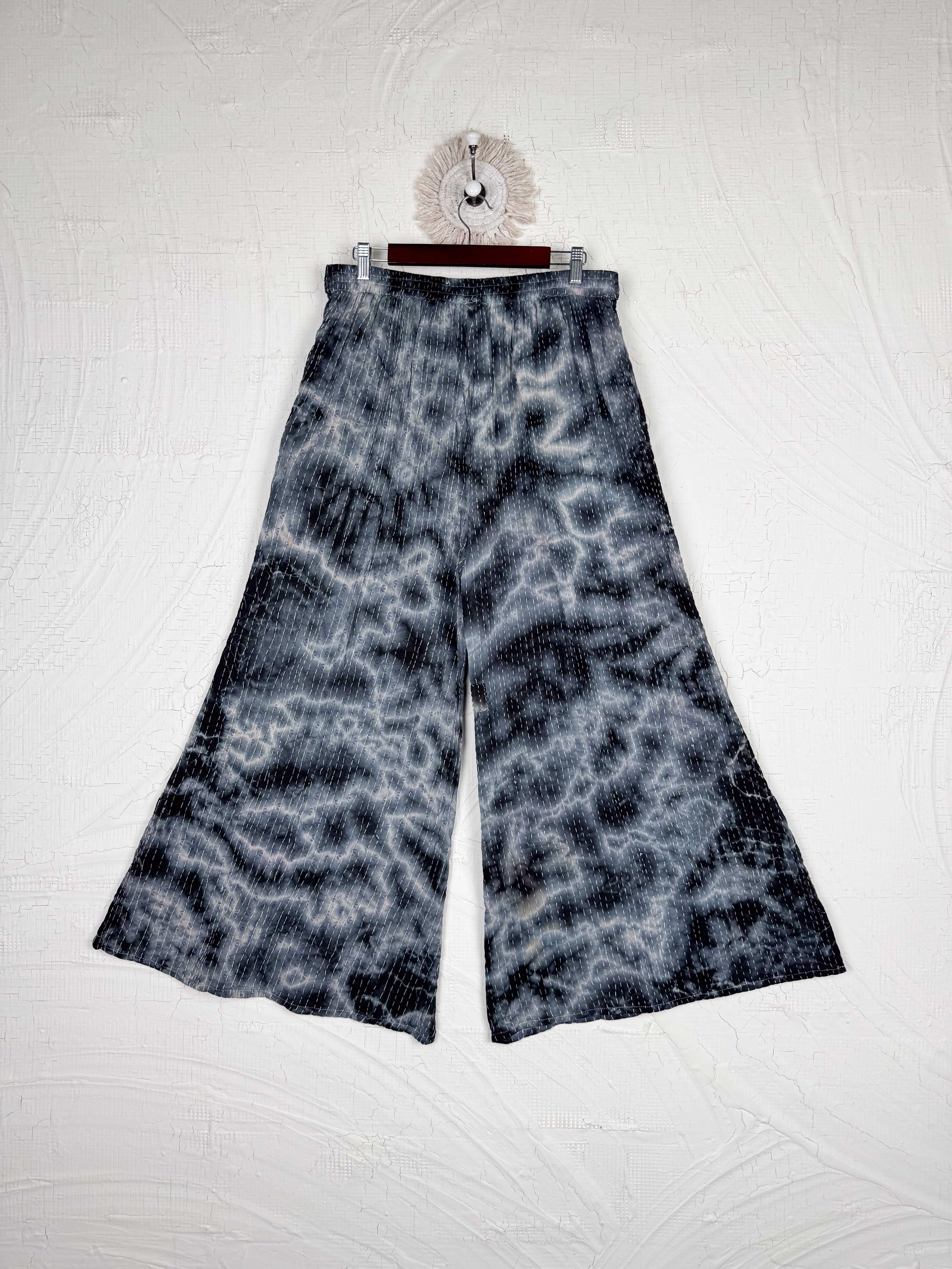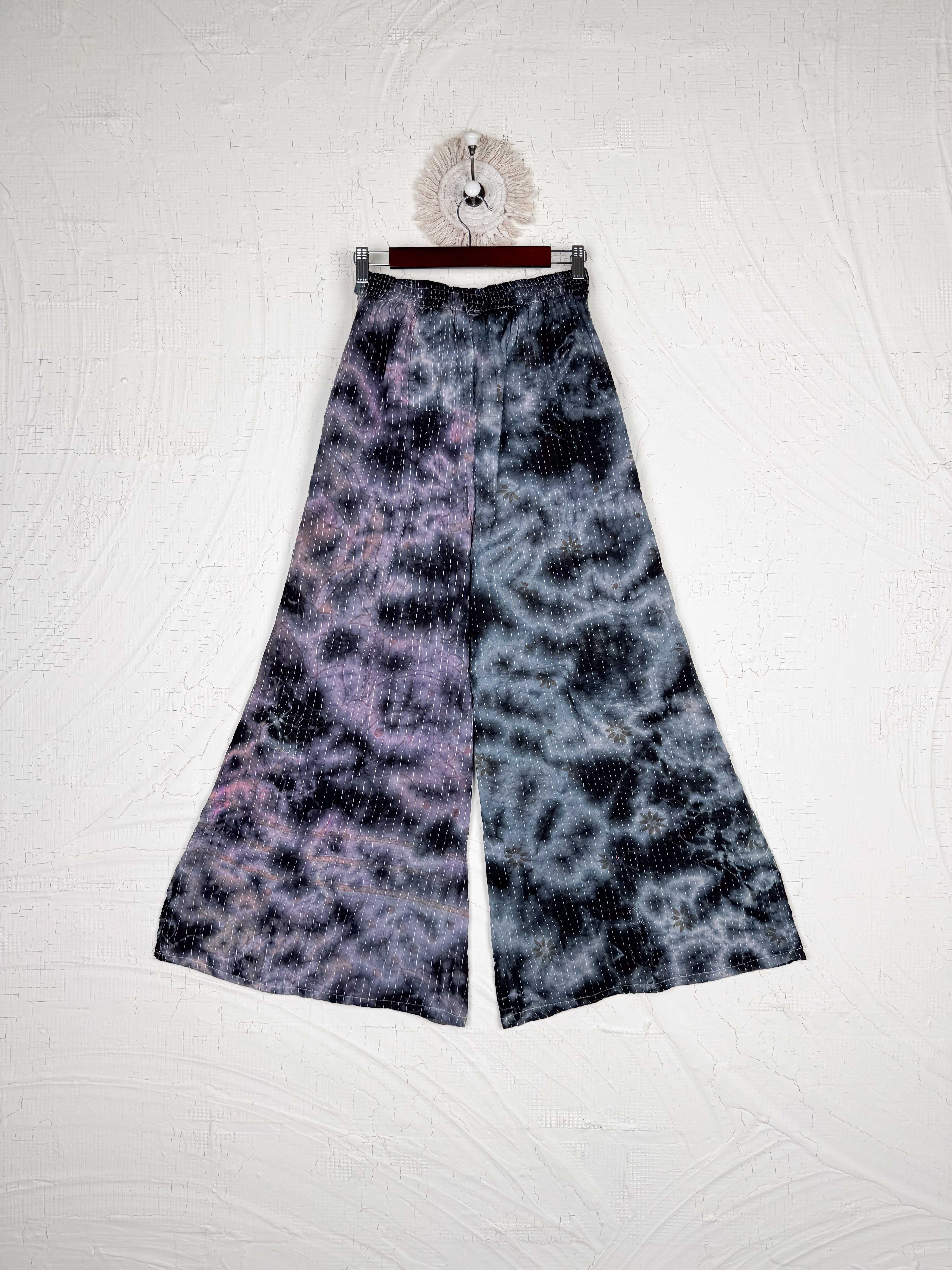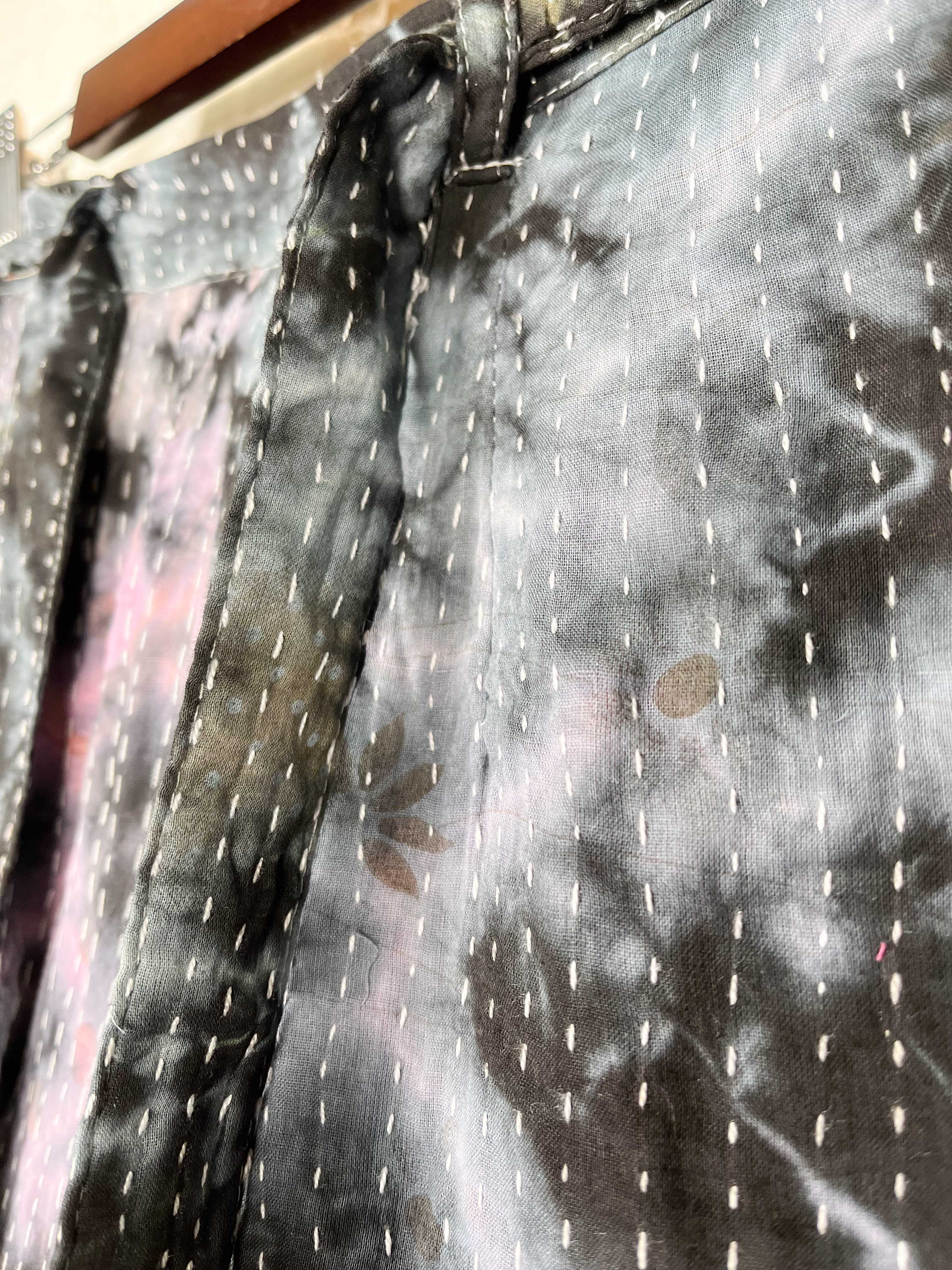 Imagine having pants that whisper tales of the past. Crafted from vintage Kantha, each pair tells its own story through a rich tapestry of repurposed cotton sarees. Feel the unique texture and beautiful flow created by layers of fabric lovingly stitched together with traditional running stitches.