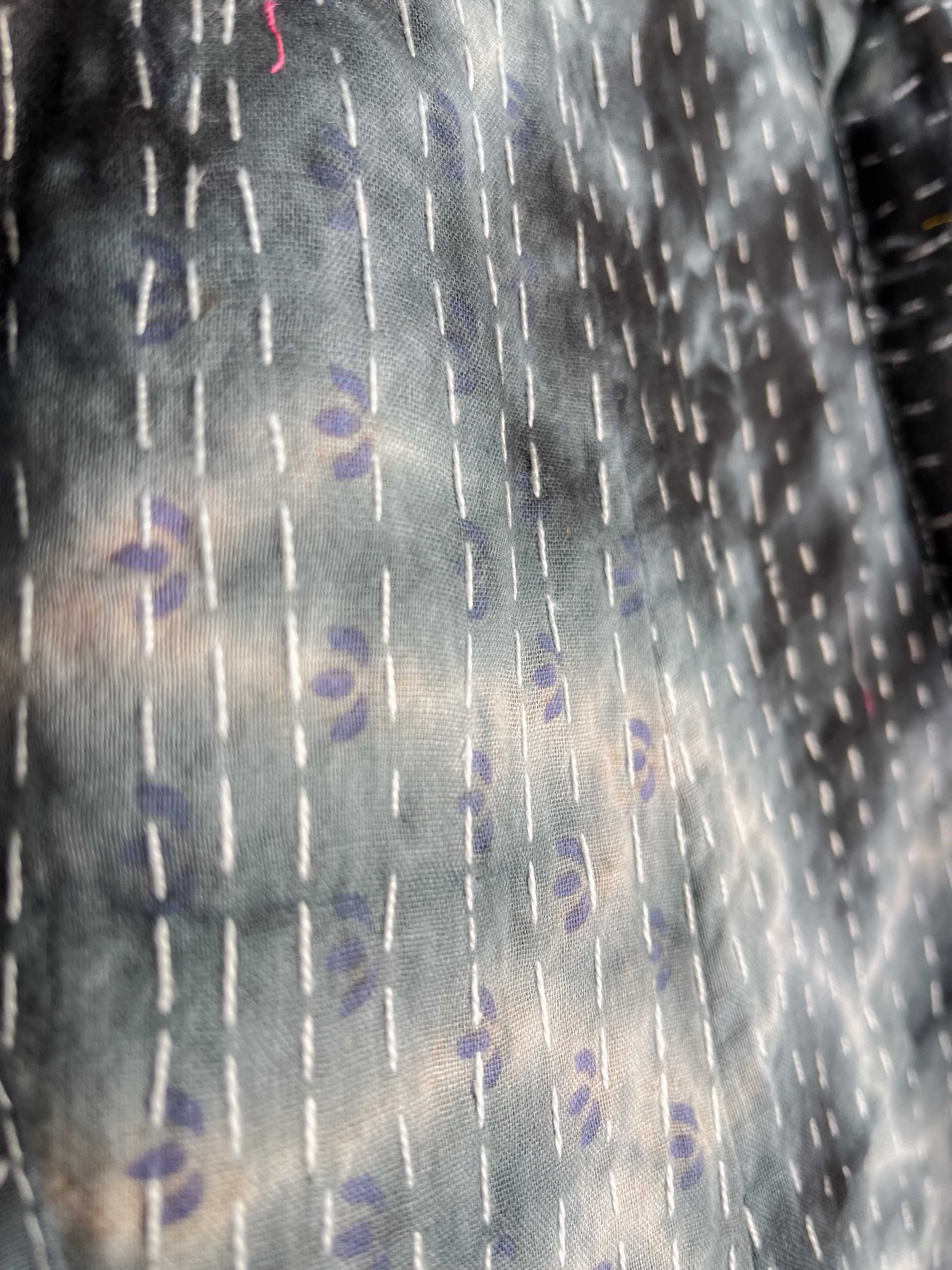 Imagine having pants that whisper tales of the past. Crafted from vintage Kantha, each pair tells its own story through a rich tapestry of repurposed cotton sarees. Feel the unique texture and beautiful flow created by layers of fabric lovingly stitched together with traditional running stitches.