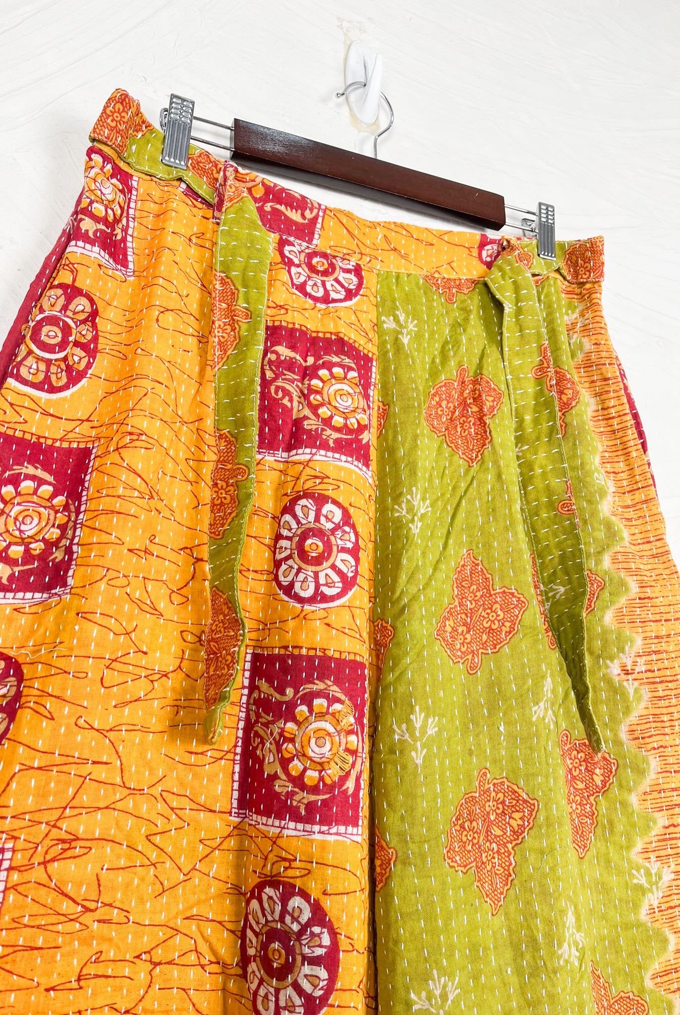 Imagine having pants that whisper tales of the past. Crafted from vintage Kantha, each pair tells its own story through a rich tapestry of repurposed cotton sarees. Feel the unique texture and beautiful flow created by layers of fabric lovingly stitched together with traditional running stitches.