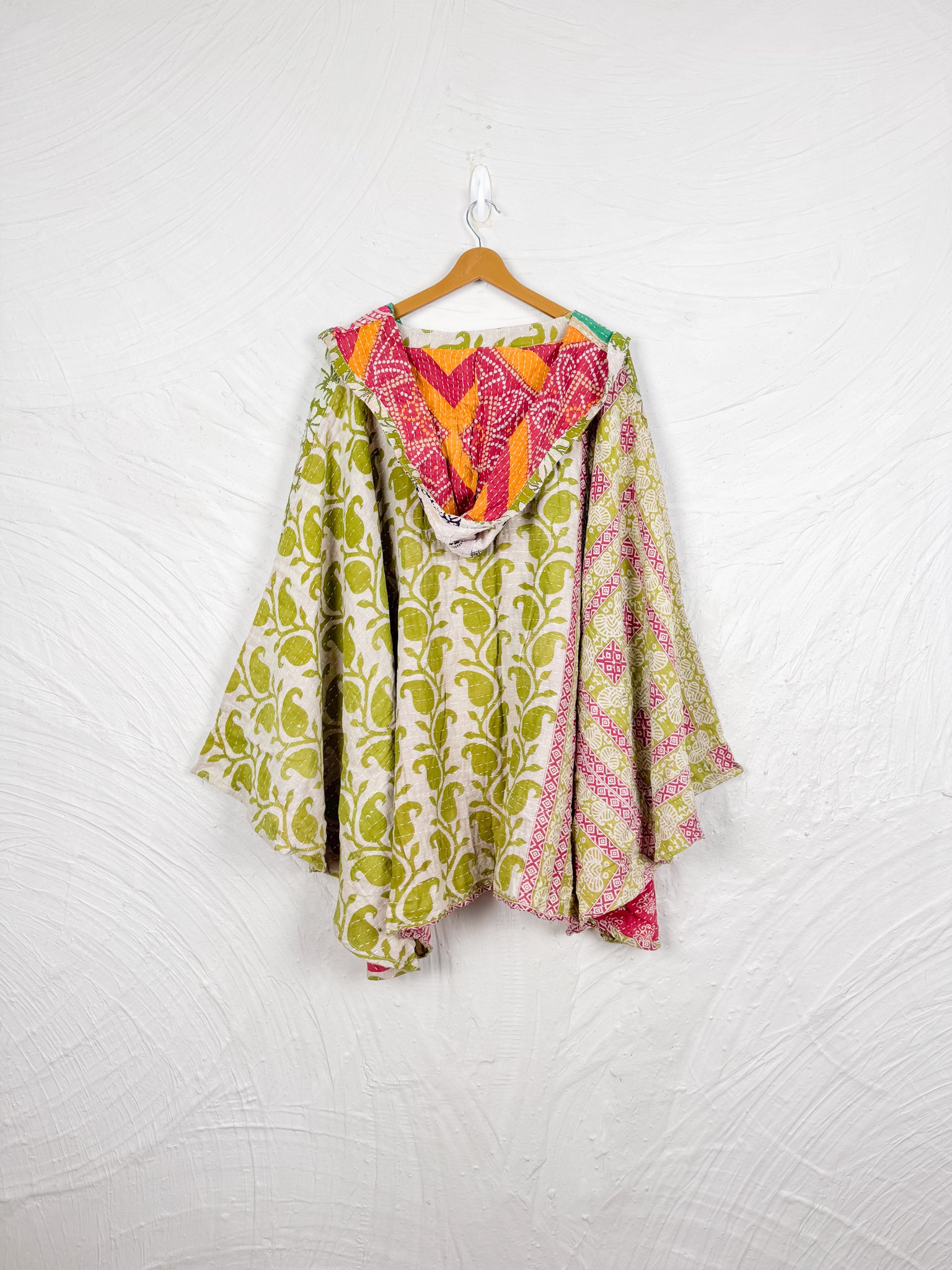 Handcrafted in India, this mid-length poncho dress is a unique piece of wearable art made from vintage Kantha fabric. Its beauty lies in the diverse tapestry of hand-stitched fabric patterns and colours, a hallmark of traditional Kantha patchwork.Designed for effortless style, it drapes gracefully with a wide, open silhouette, a comfortable