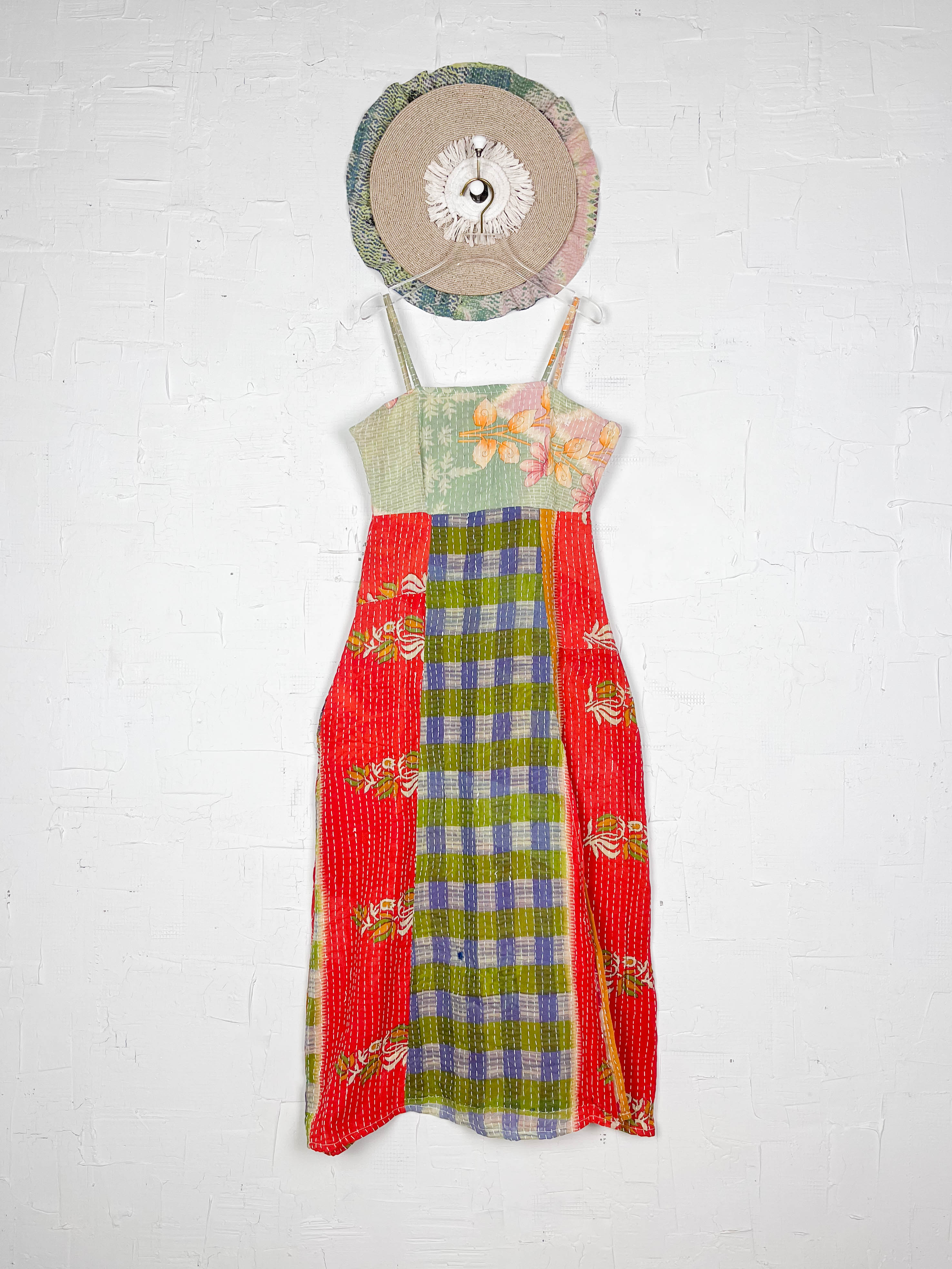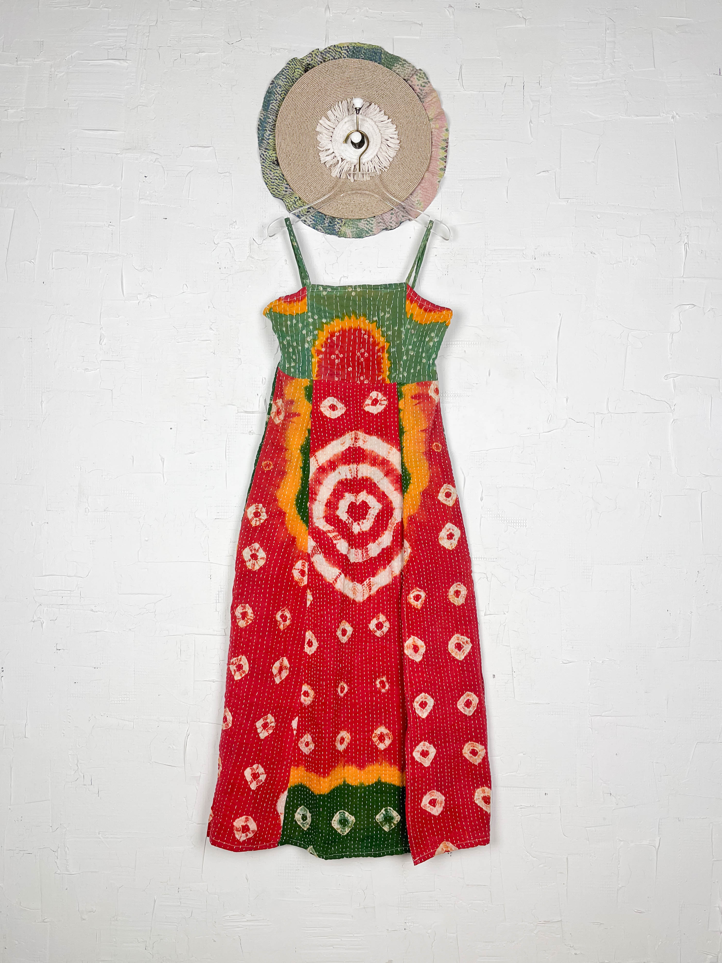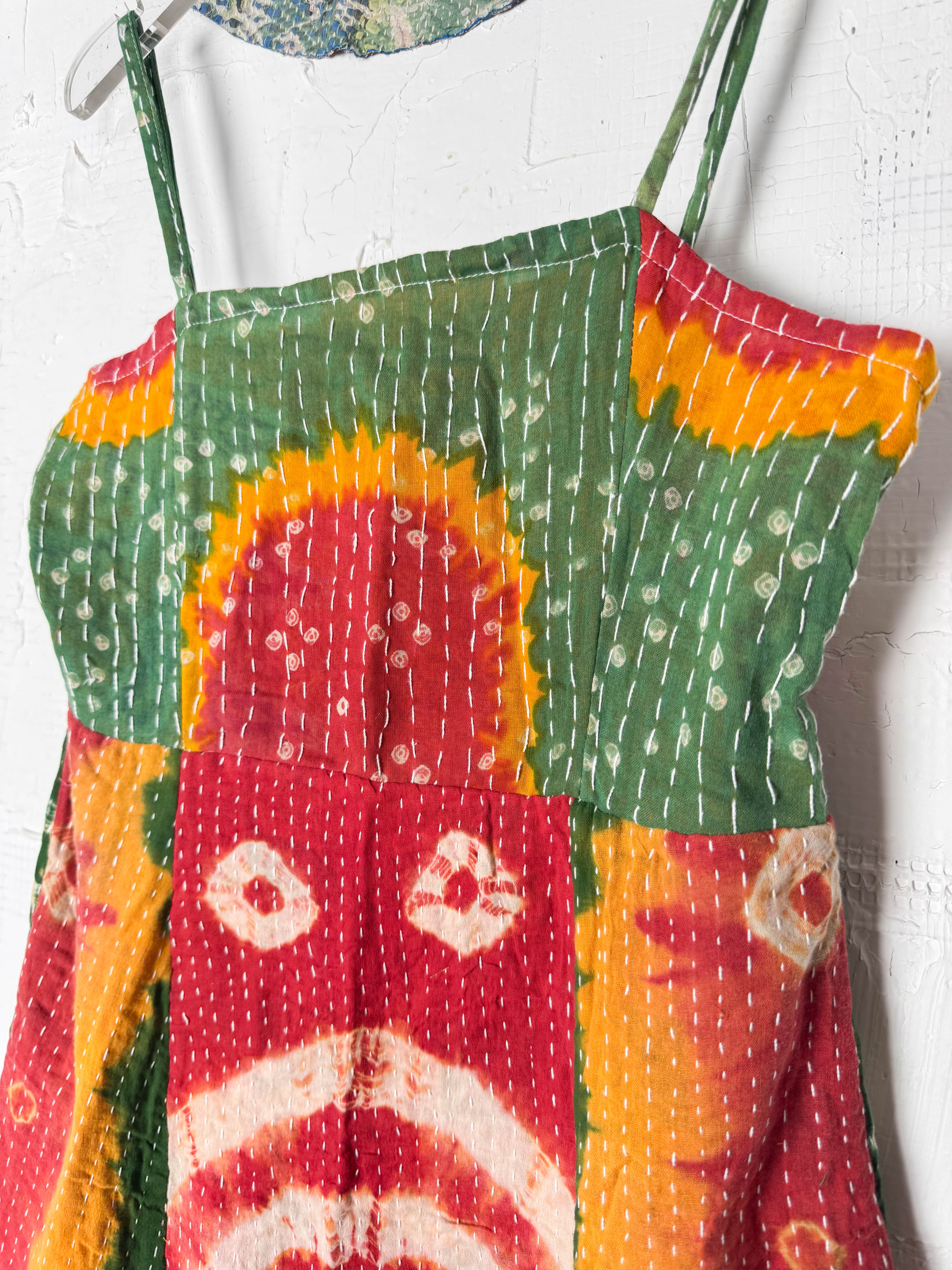 Kantha Strap Long Dress Boho Green Orange