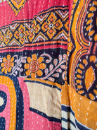 This is Kantha stitches all over the fabric. this kantha work is done by layering 2 or more cotton sarees over each other and stitched them all over the span to get the desired thickness depending upon the number of sarees put in layers, the texture of the stitch all over and the floral prints of cotton make it unique