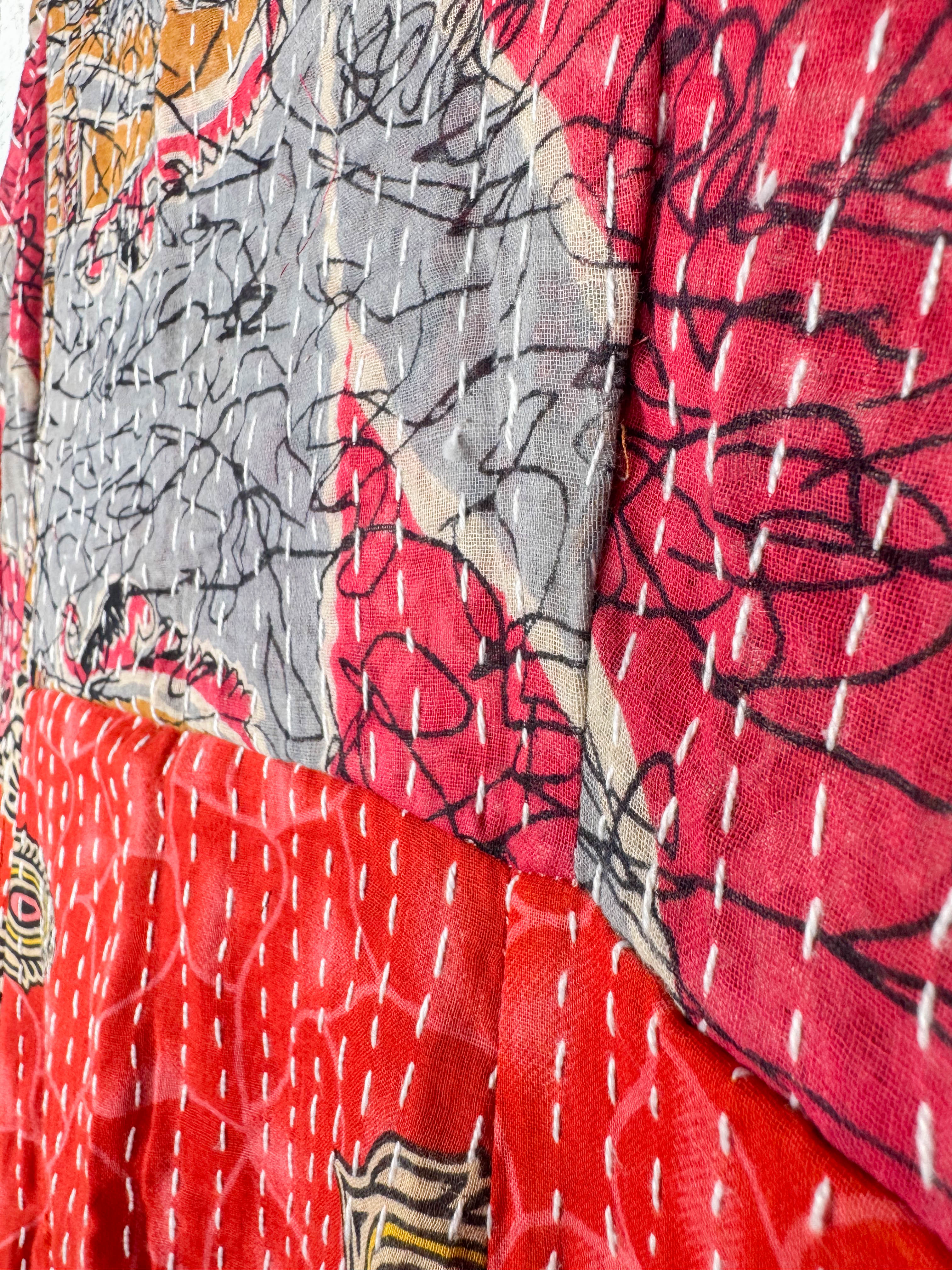 Envelop yourself in the artistry of this vintage Kantha dress. Each running stitch tells a story across the lightweight fabric, creating a unique texture and a beautifully airy feel. A long slit graces the left side, adding a touch of distinctive charm. Experience the seamless harmony of traditional hand craftsmanship and everyday ease to enhance your Playful feminine essence every day!