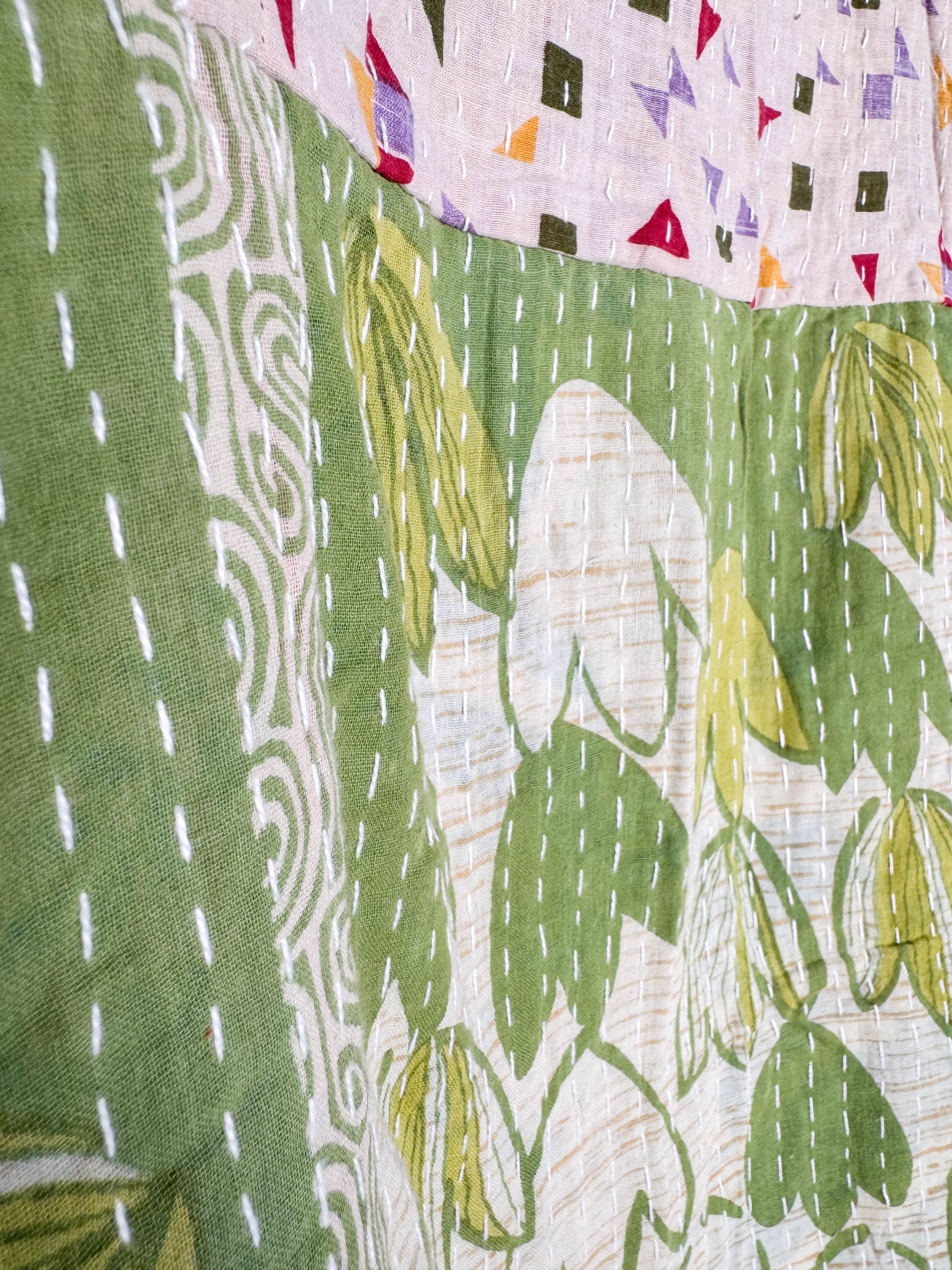 This is Kantha stitches all over the fabric. this kantha work is done by layering 2 or more cotton sarees over each other and stitched them all over the span to get the desired thickness depending upon the number of sarees put in layers, the texture of the stitch all over and the floral prints of cotton make it unique