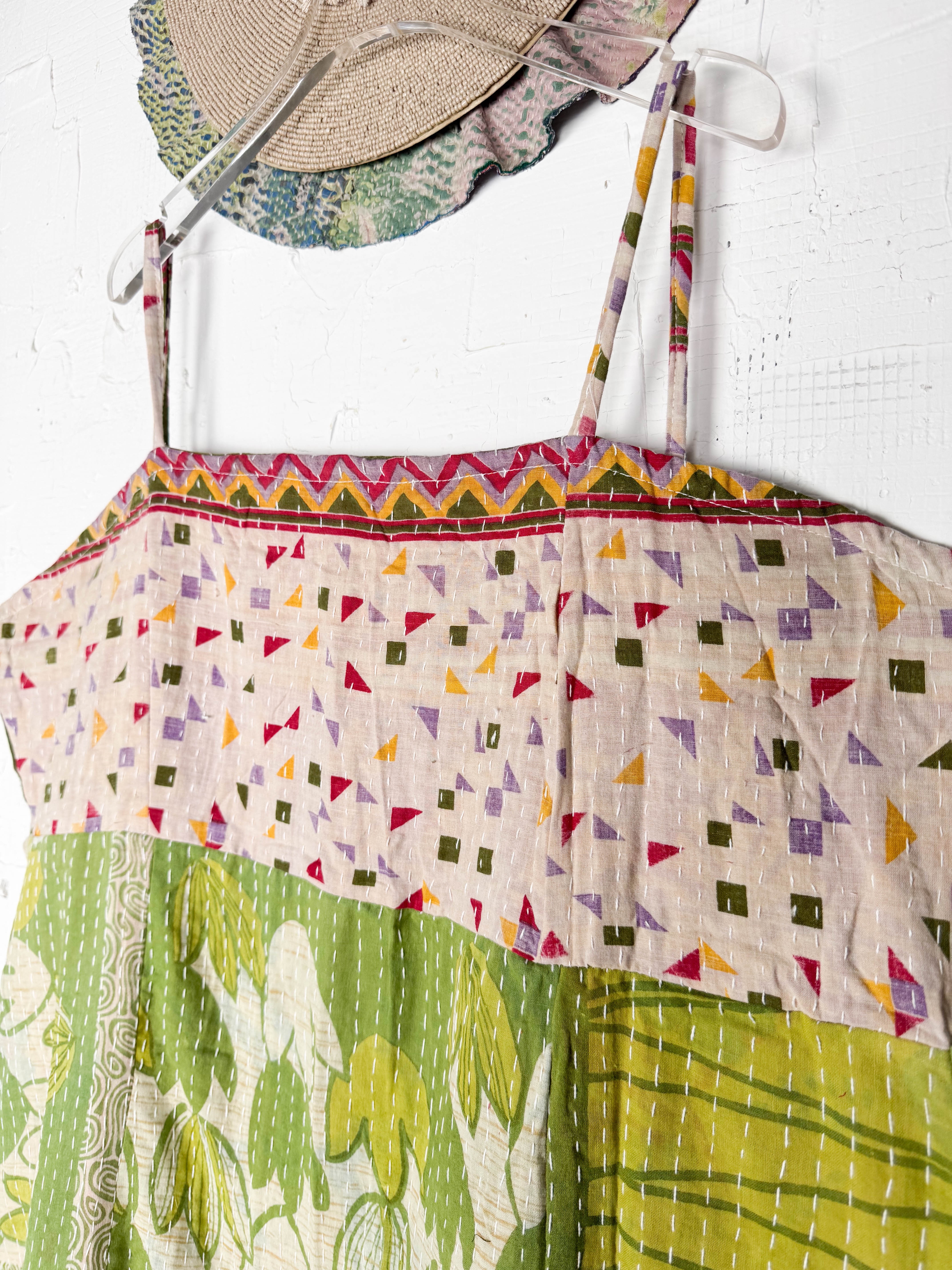 Kantha Strap Long Dress Floral Beige Green