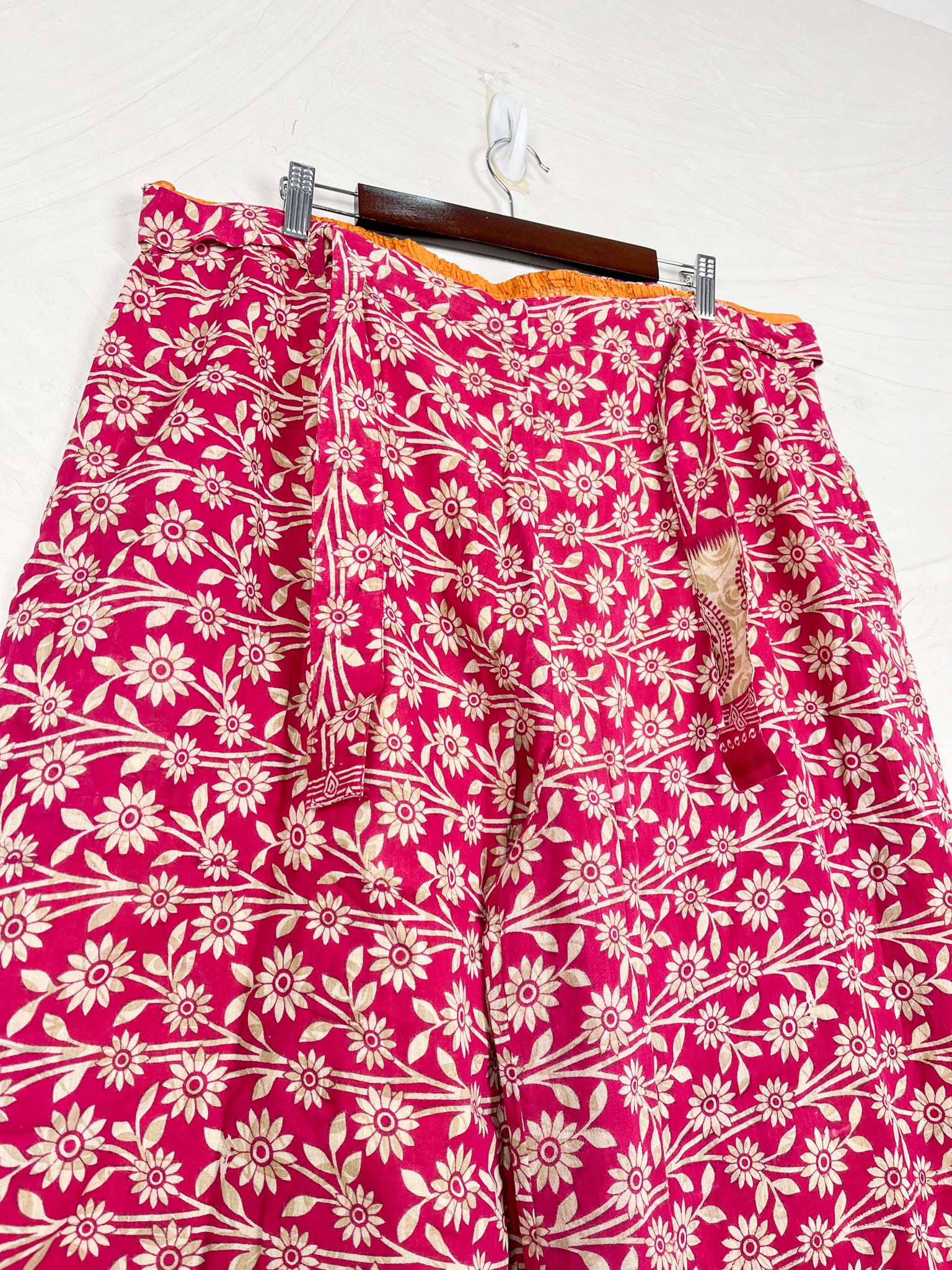 Made from vintage cotton sarees featuring traditional floral prints and vibrant hues, these pants are a celebration of timeless design. Their loose, flowing wide legs ensure ultimate comfort and freedom of movement, while the Adjustable front tie waistband with back-half elastic gives you control for desired fit.