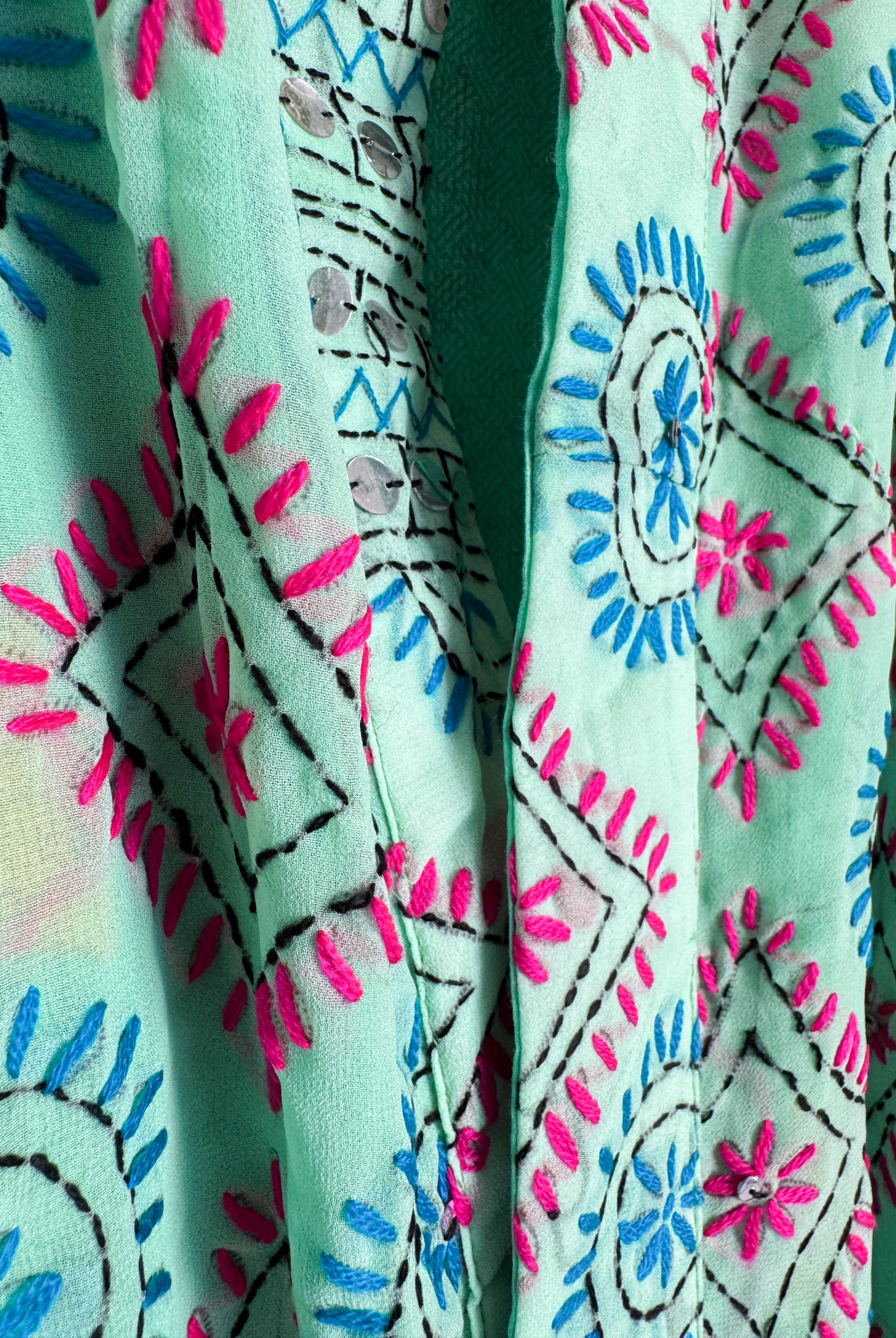 This exquisite, long Phulkari robe is a unique piece of wearable art, handcrafted in India from vintage Kantha fabric. Its semi-transparent silk and vibrant, hand-stitched floral and geometric patterns, adorned with tiny mirrors, evoke nature's artistry. Designed with an open front and flowing sleeves, it drapes effortlessly for bohemian grace.