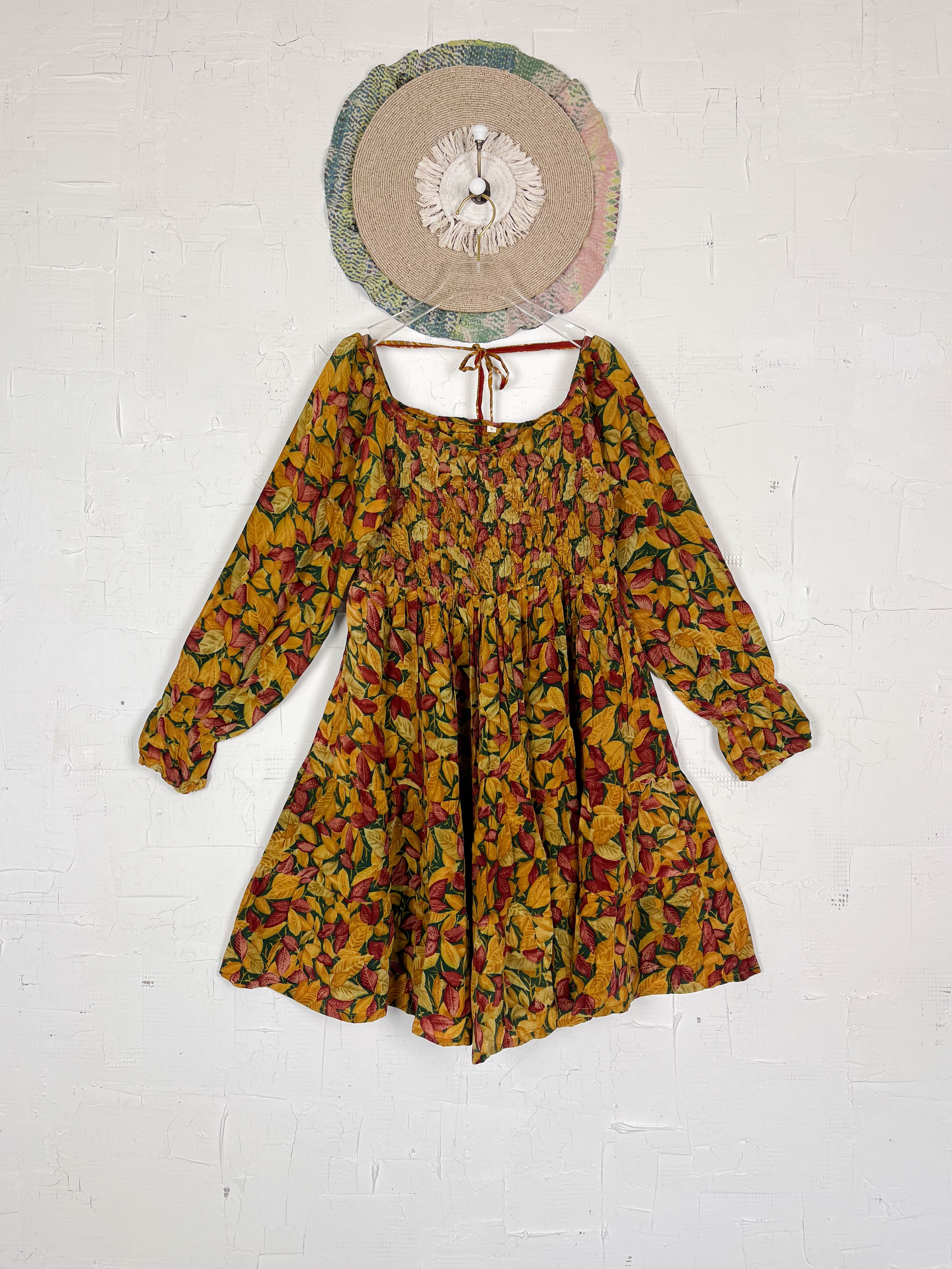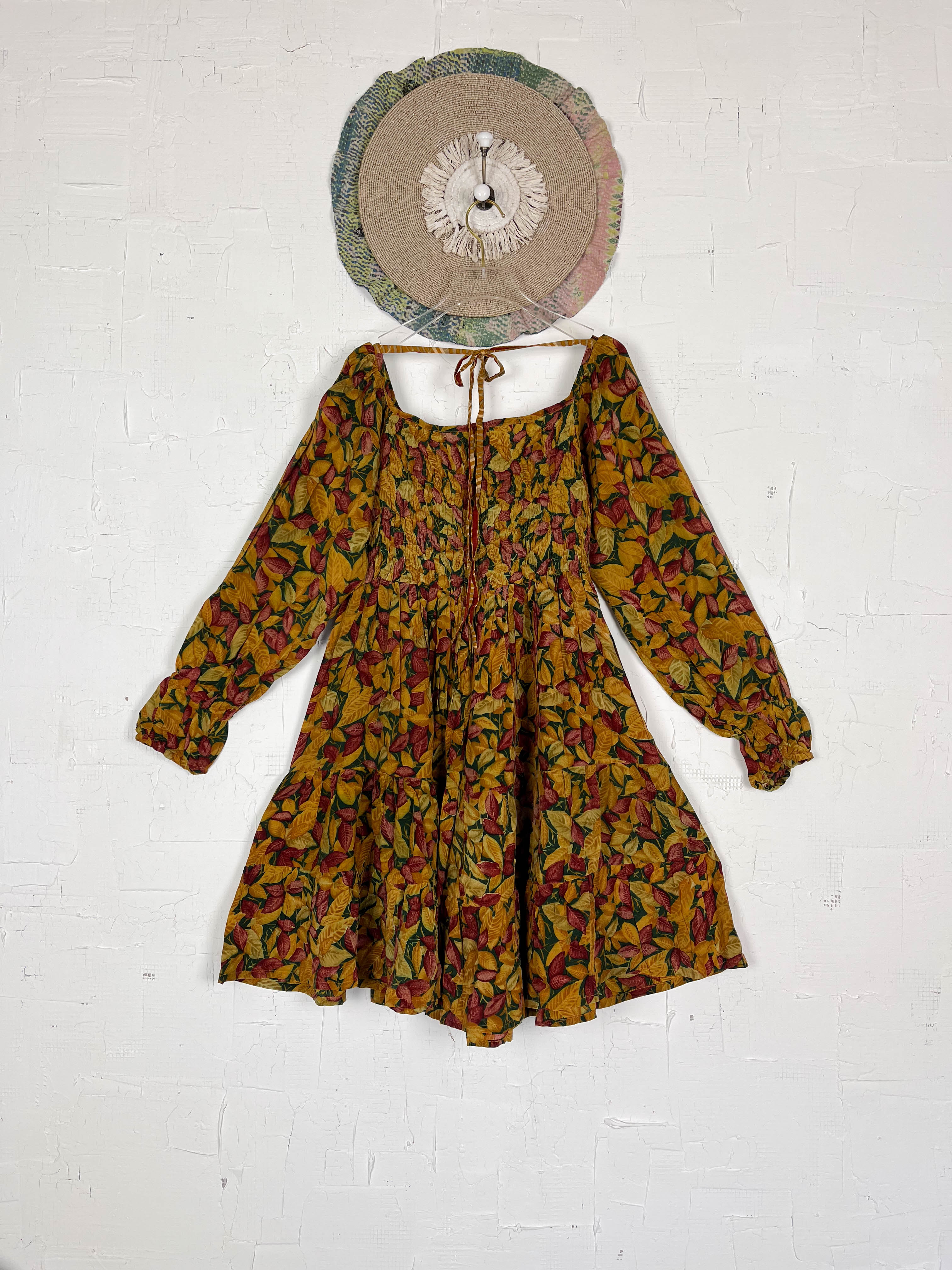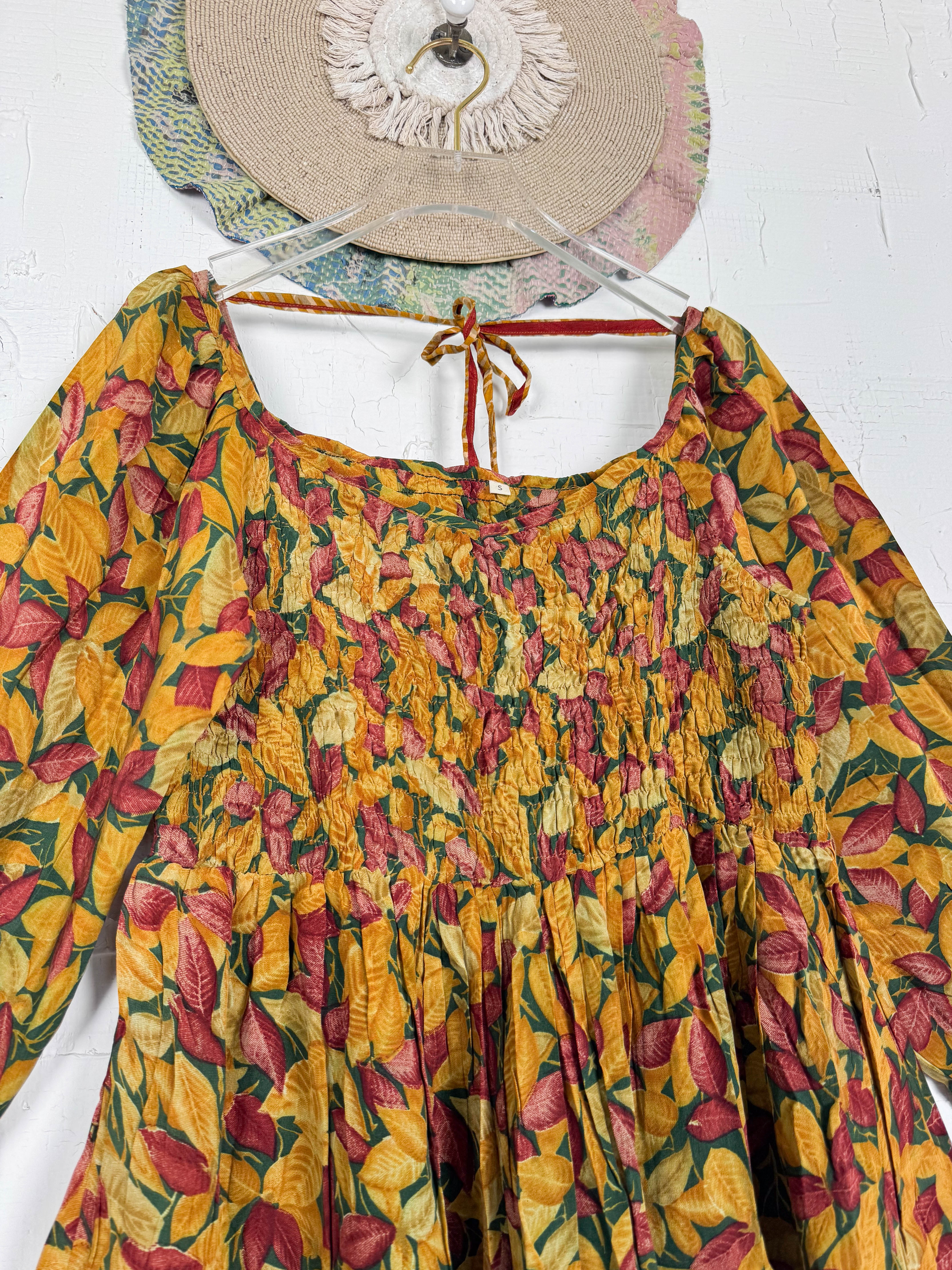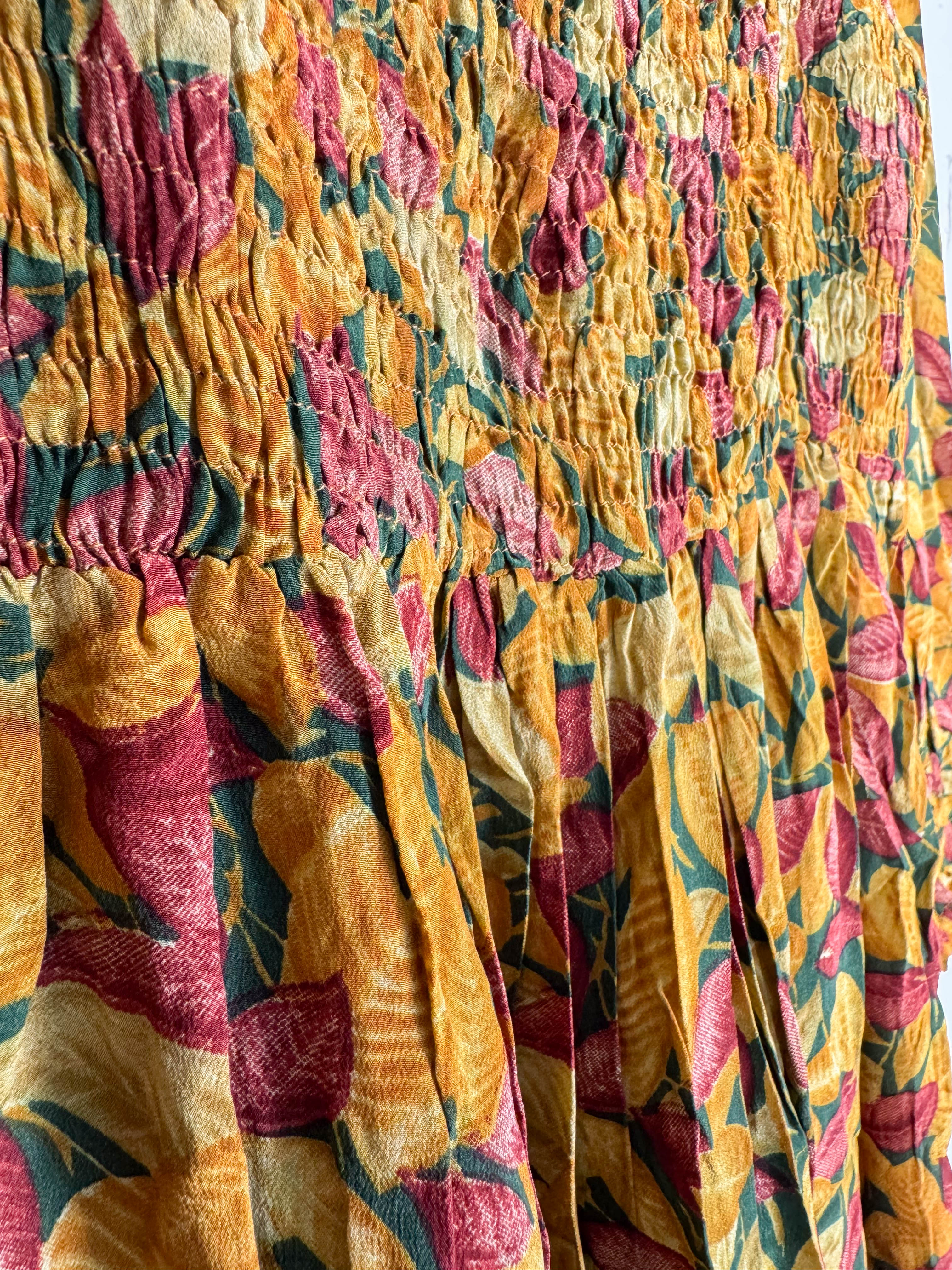 Crafted from vintage crepe silk, the traditional floral print drapes beautifully. The square neckline frames your décolletage, while the long, full sleeves gather into a delightful balloon shape. The bodice gently gathers at the bust, flowing into a skirt that moves with you.