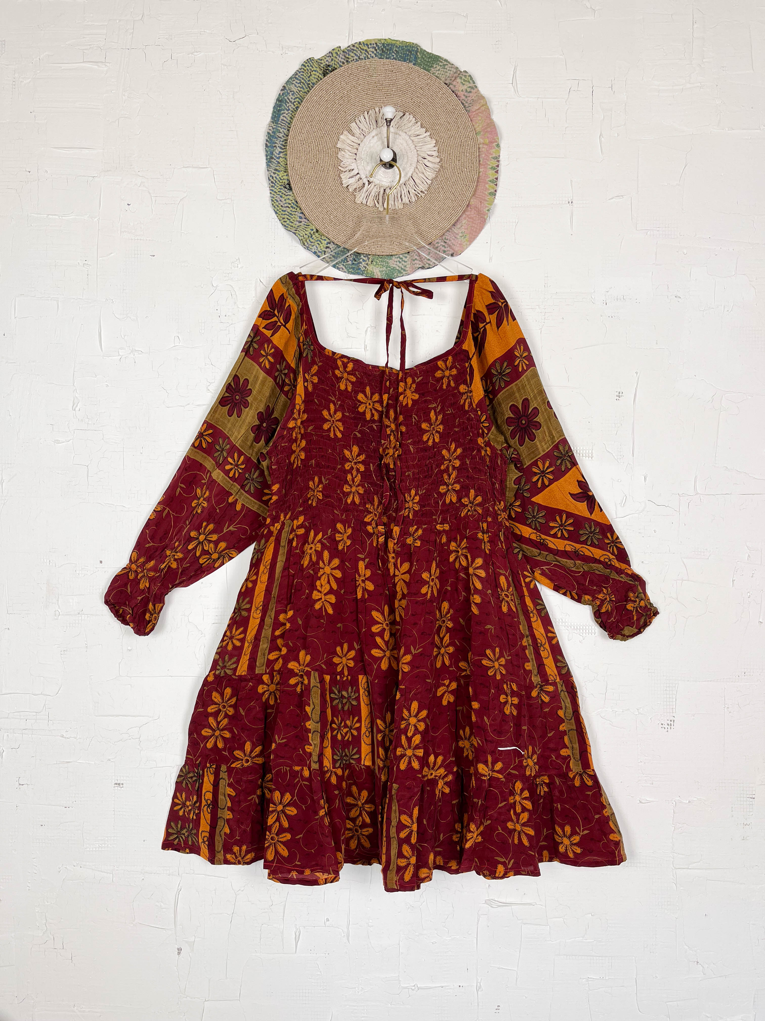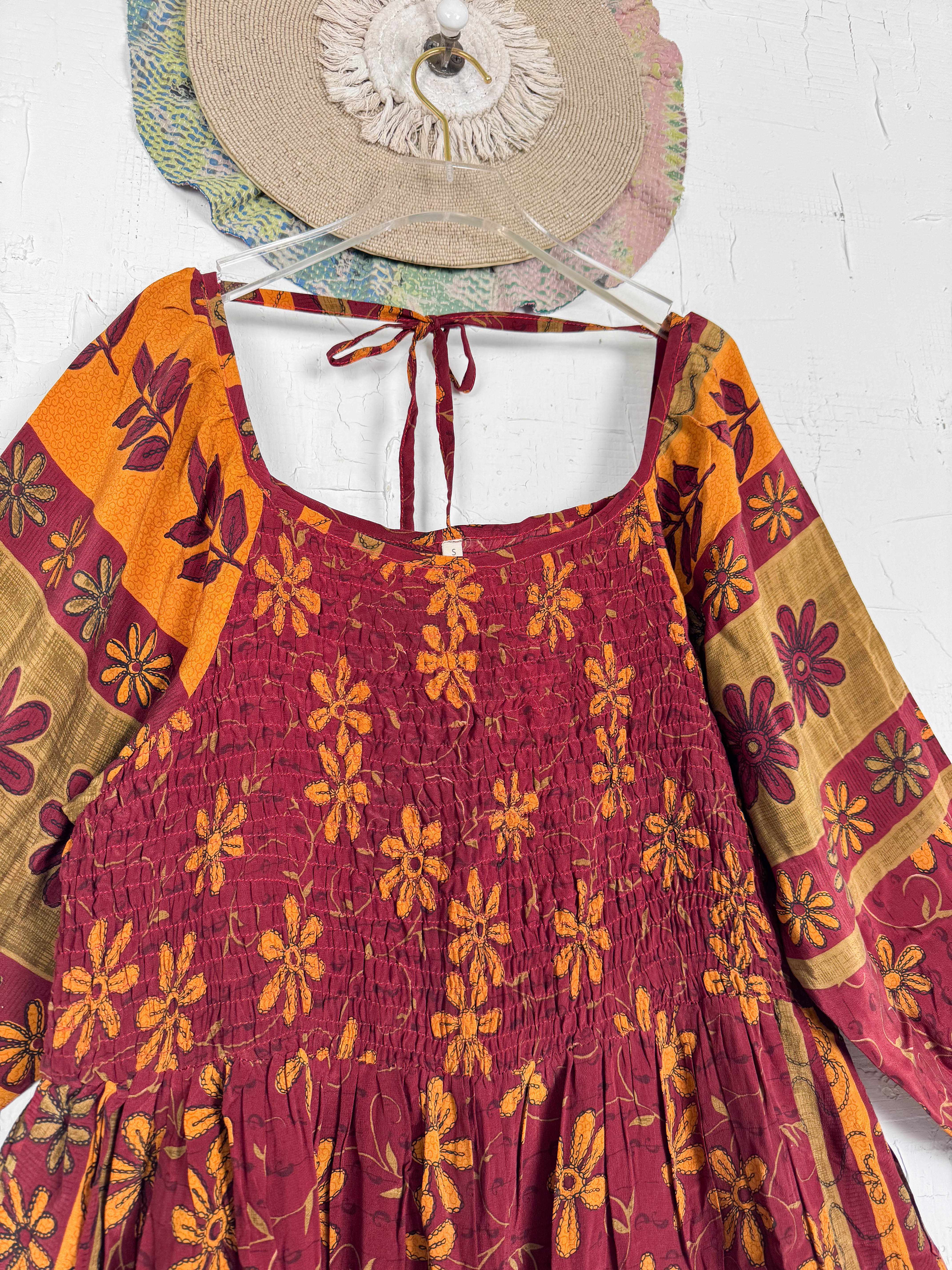 Crafted from vintage crepe silk, the traditional floral print drapes beautifully. The square neckline frames your décolletage, while the long, full sleeves gather into a delightful balloon shape. The bodice gently gathers at the bust, flowing into a skirt that moves with you.