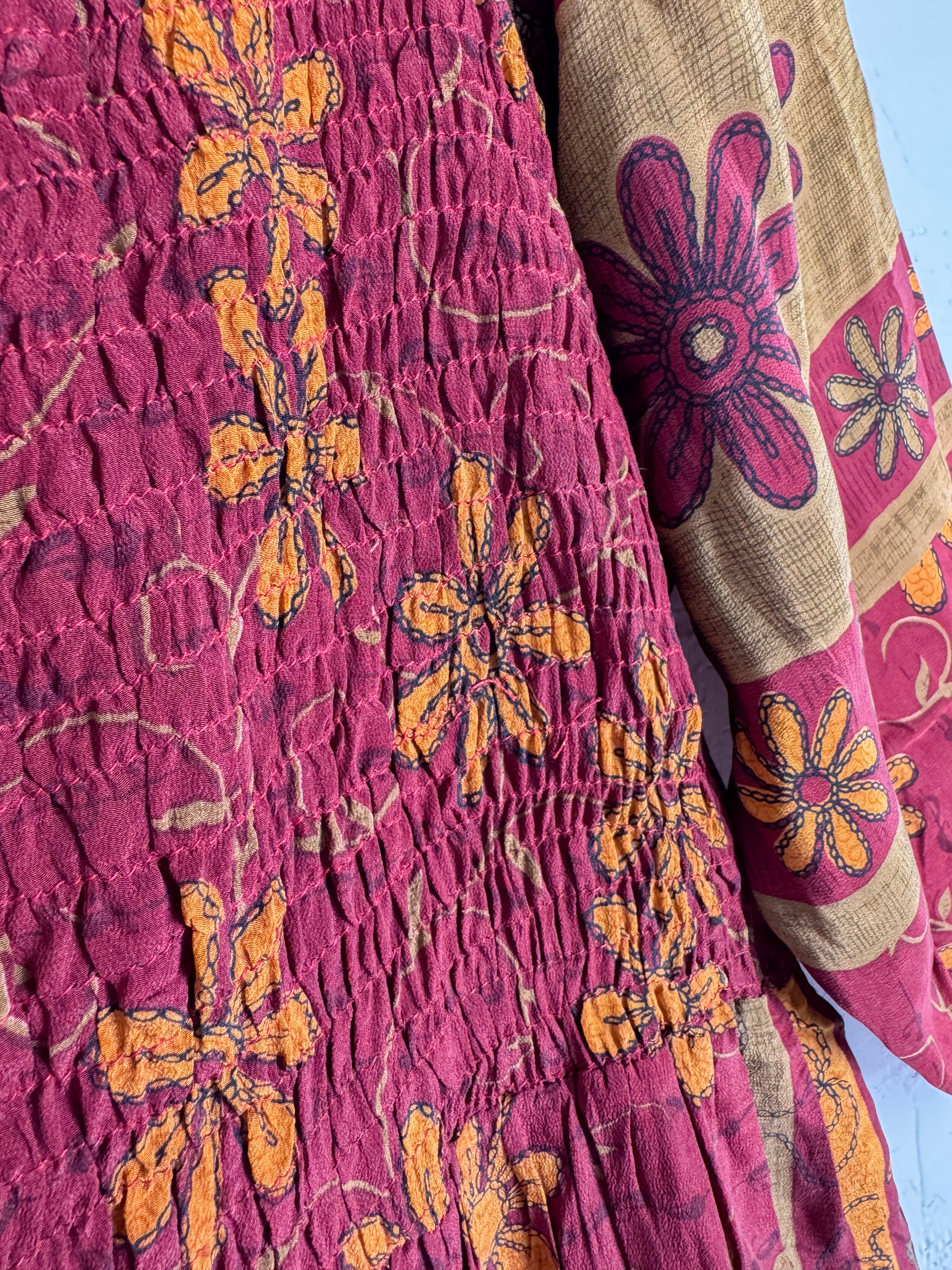 Crepe Silk: this is vintage silk. we take Indian sarees, which are often worn by people in different regions so the sarees consist of different prints and colours representing traditional values and vintage prints. we take the silk from Indian pre-loved sarees to make dresses