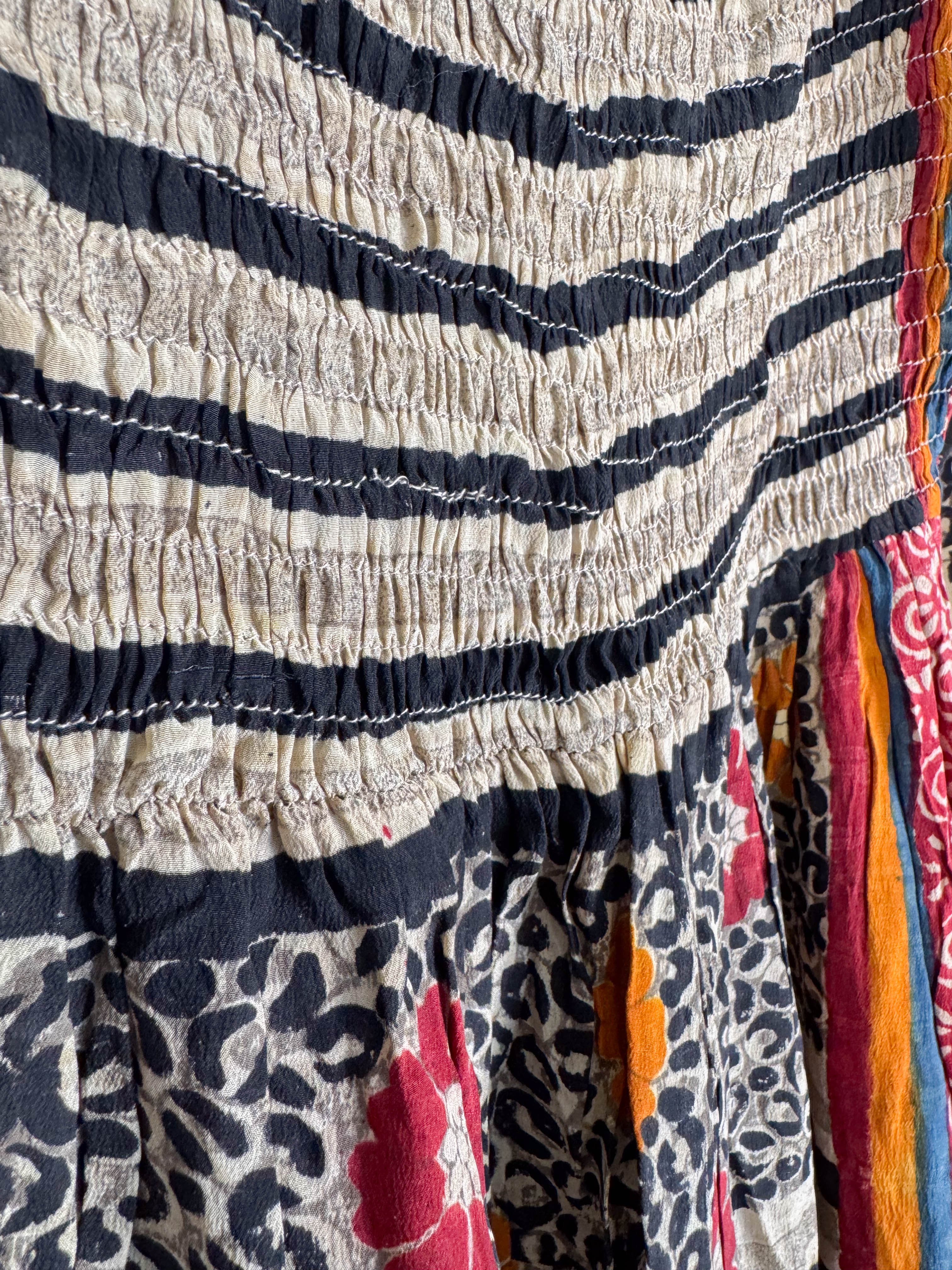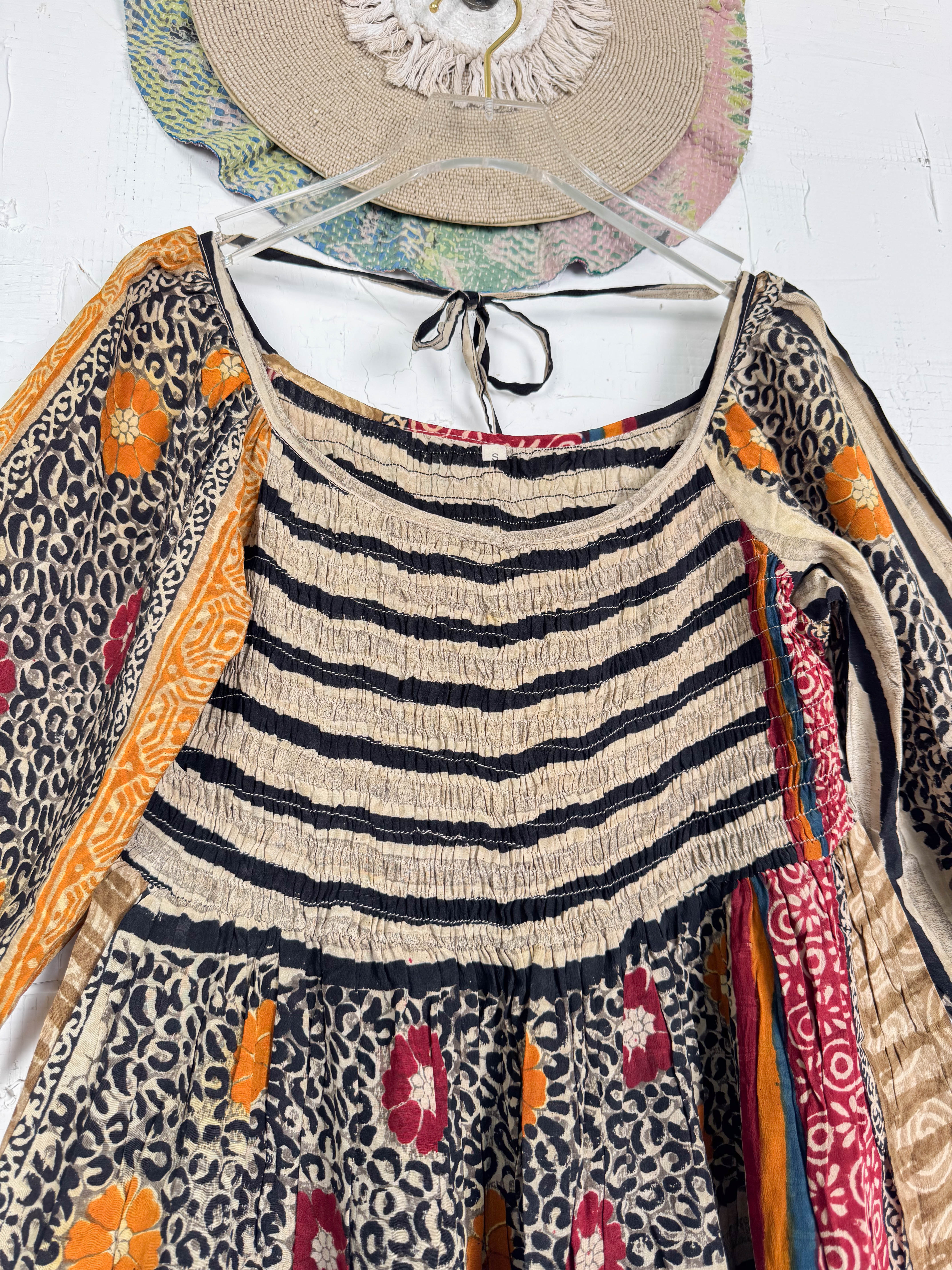 Crafted from vintage crepe silk, the traditional floral print drapes beautifully. The square neckline frames your décolletage, while the long, full sleeves gather into a delightful balloon shape. The bodice gently gathers at the bust, flowing into a skirt that moves with you.