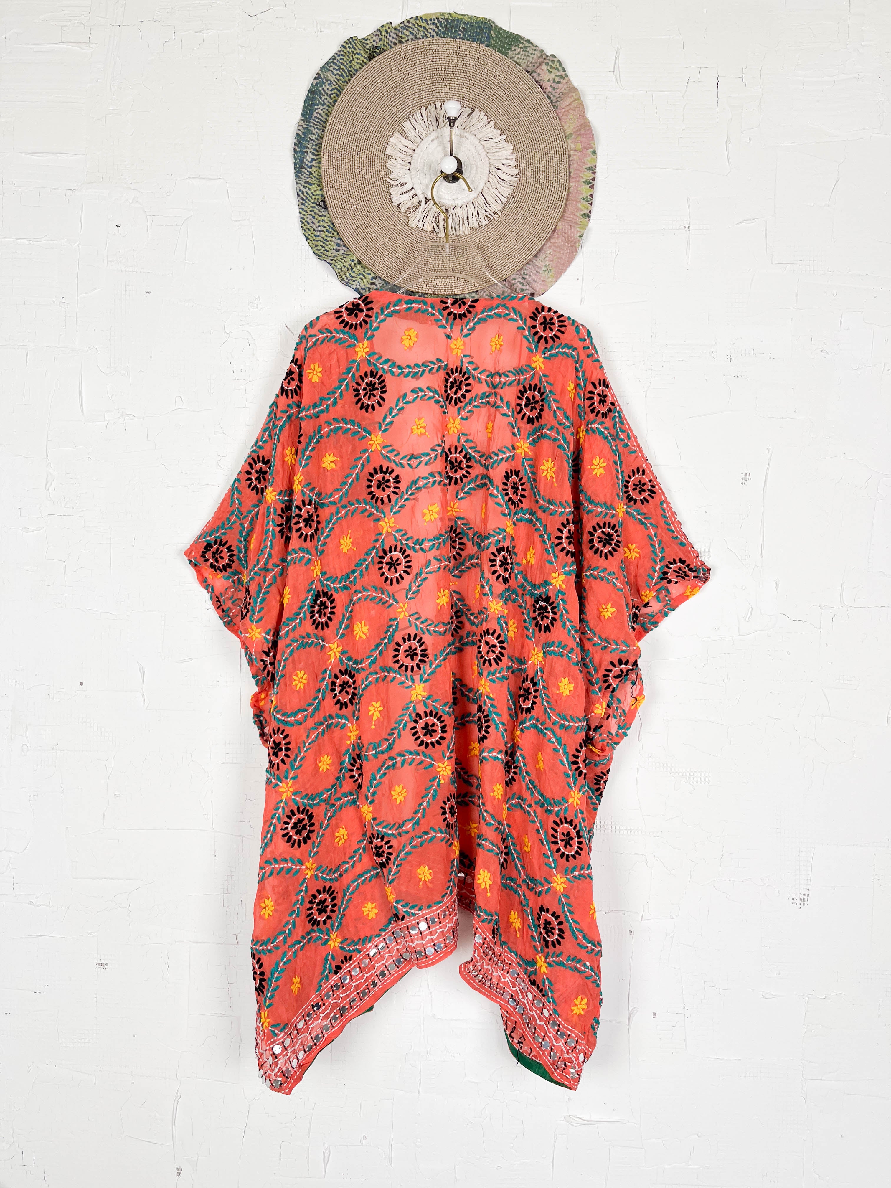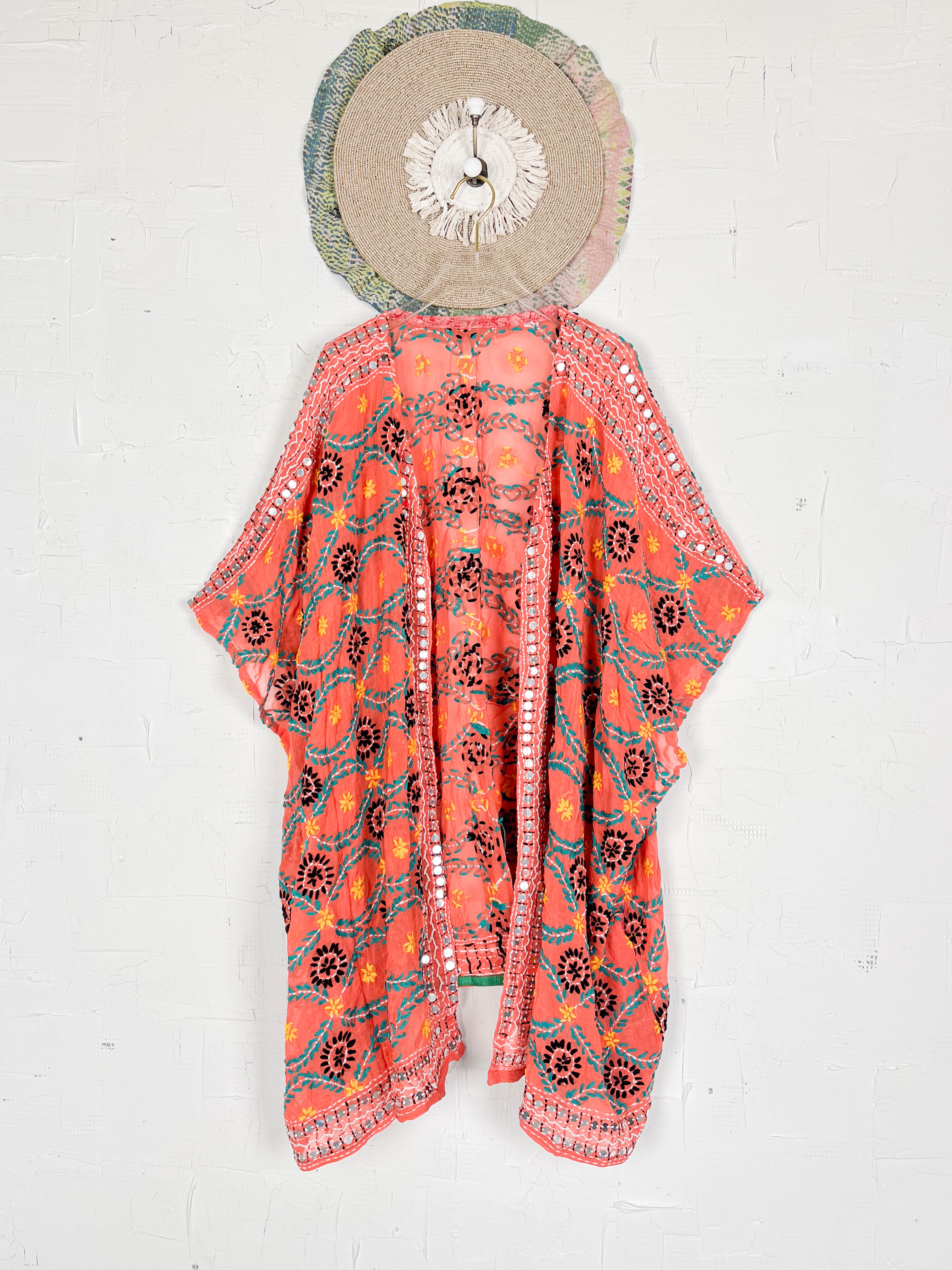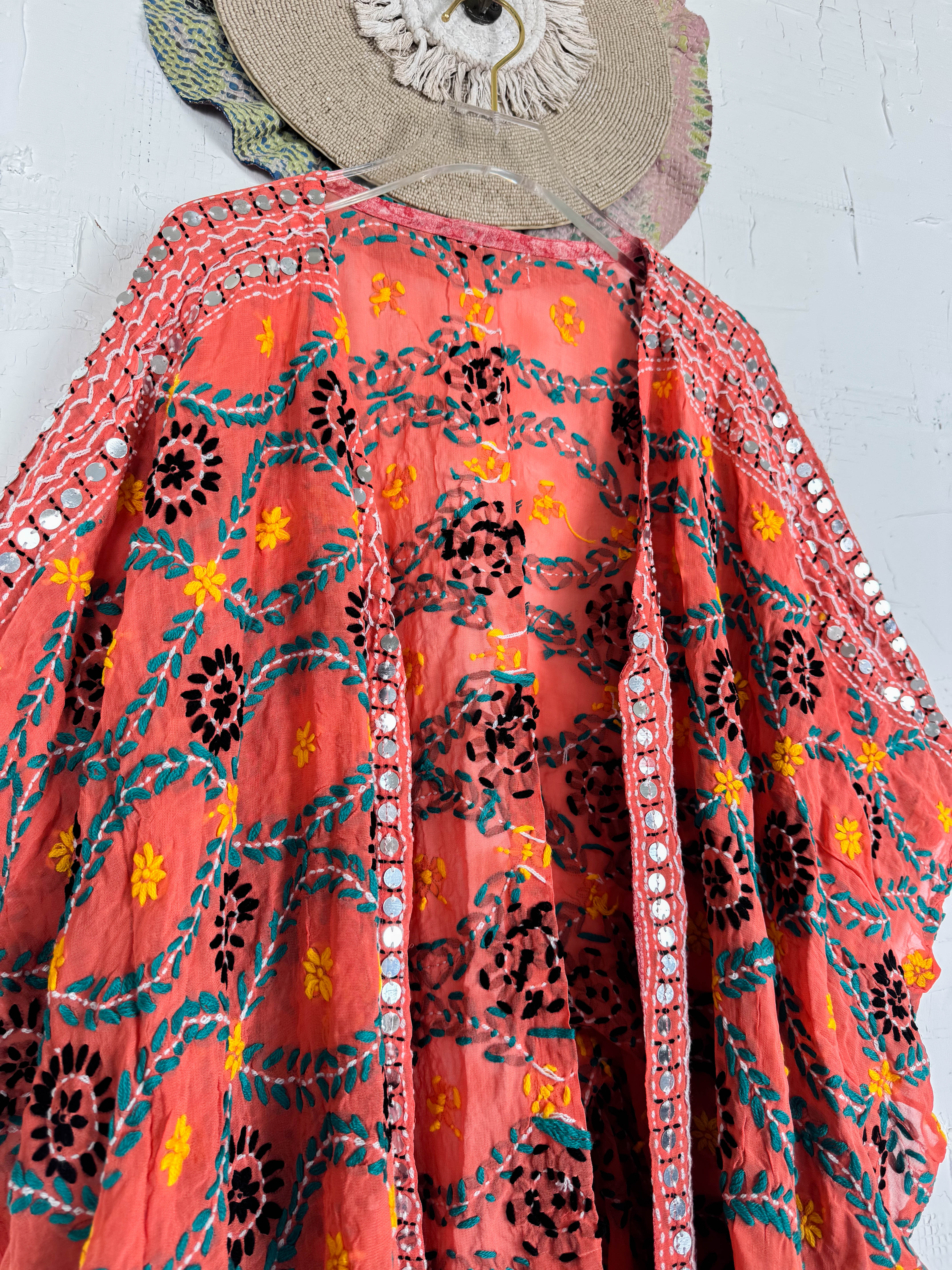 Cultural Aesthetic: The Phulkari embroidery and mirror work give the cover-up a distinct cultural and possibly bohemian-inspired style.