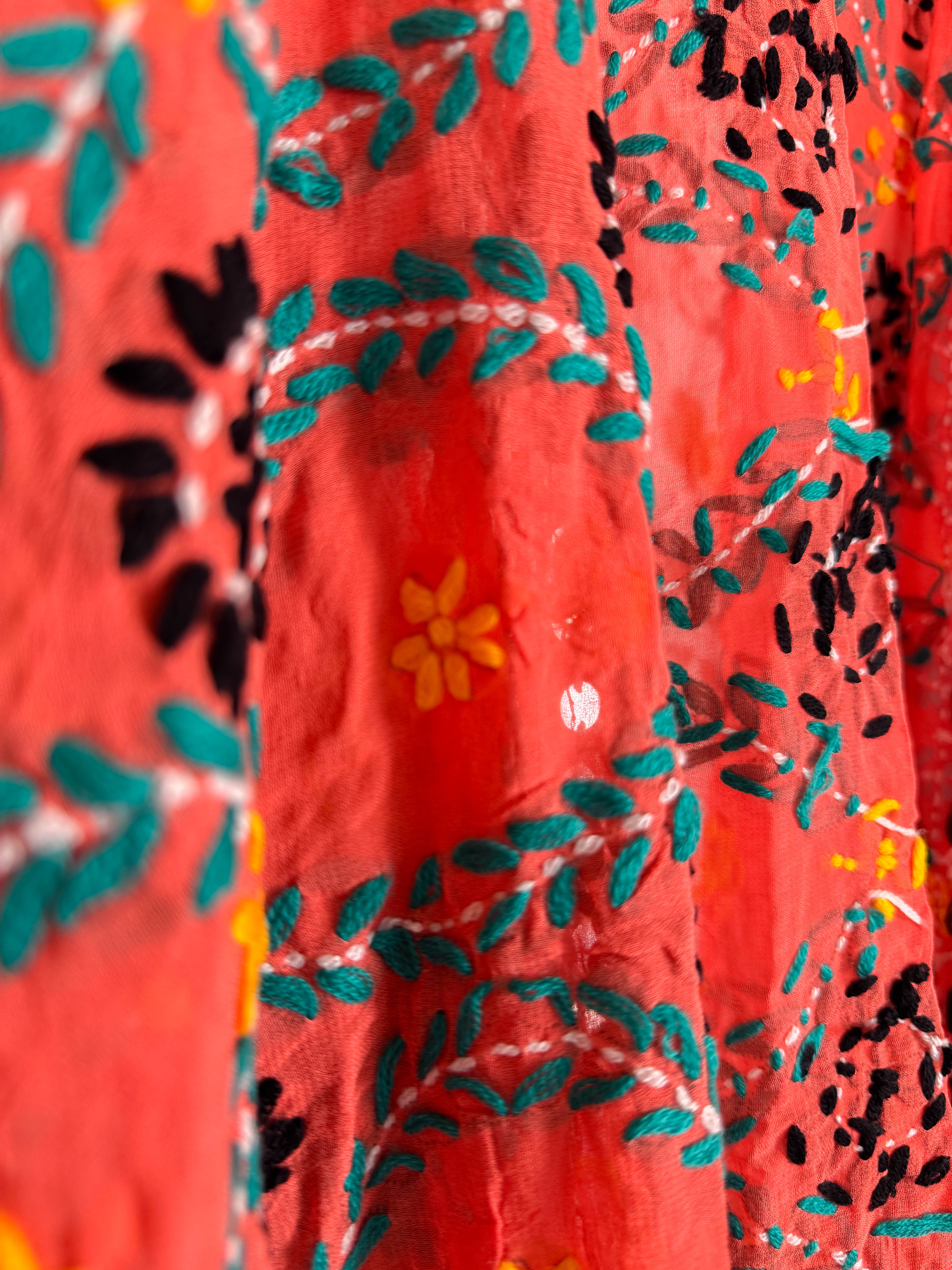 Wrap yourself in the artistry of Mother Earth with this sheer, hand-embroidered cover-up. Crafted from lightweight silk, its semi-transparent fabric whispers elegance, hinting at the beauty beneath. Adorned with vibrant Phulkari, a traditional embroidery from INDIA, each floral motif and geometric touch blooms with rich color. Tiny mirrors dance across the fabric, catching the light with every movement. Designed with an open front and flowing sleeves, this piece drapes effortlessly, adding a touch of bohemian grace and cultural charm to any look, whether as a delicate layer or a stunning lingerie cover. Feel the handcrafted love in every stitch.