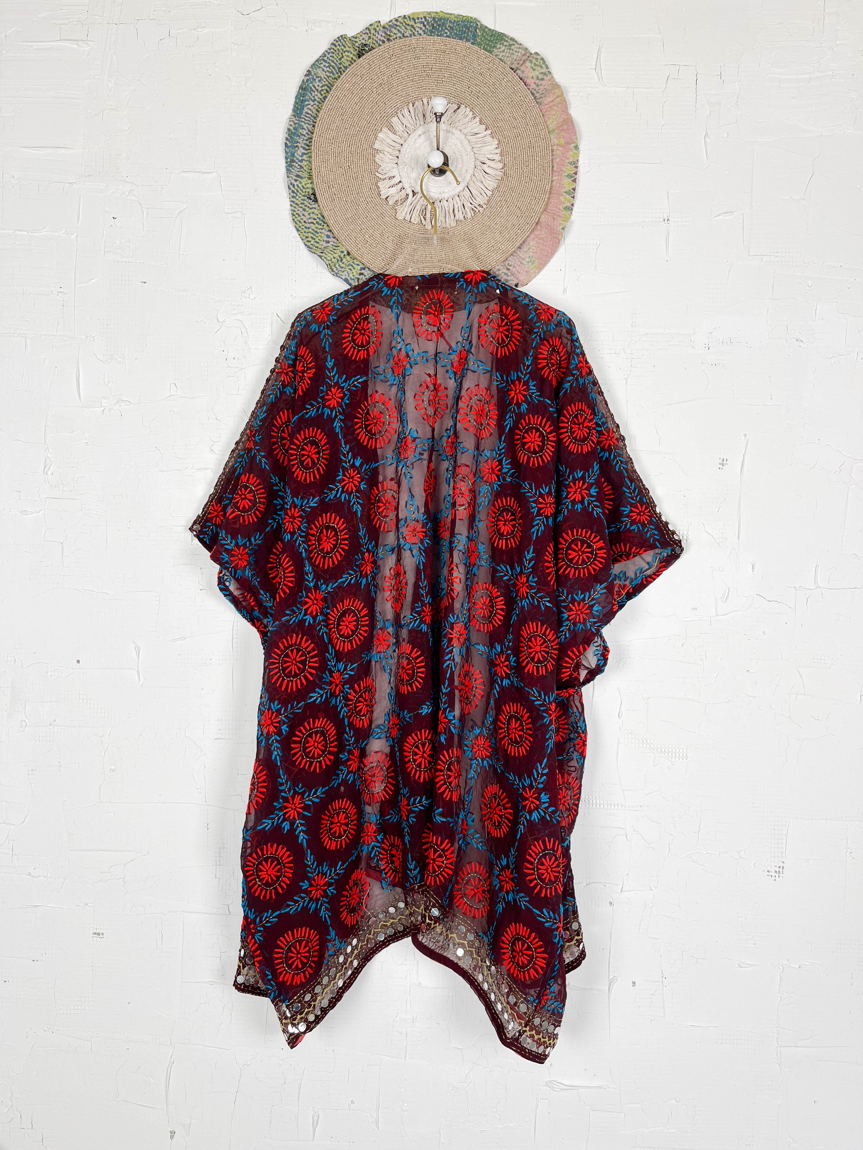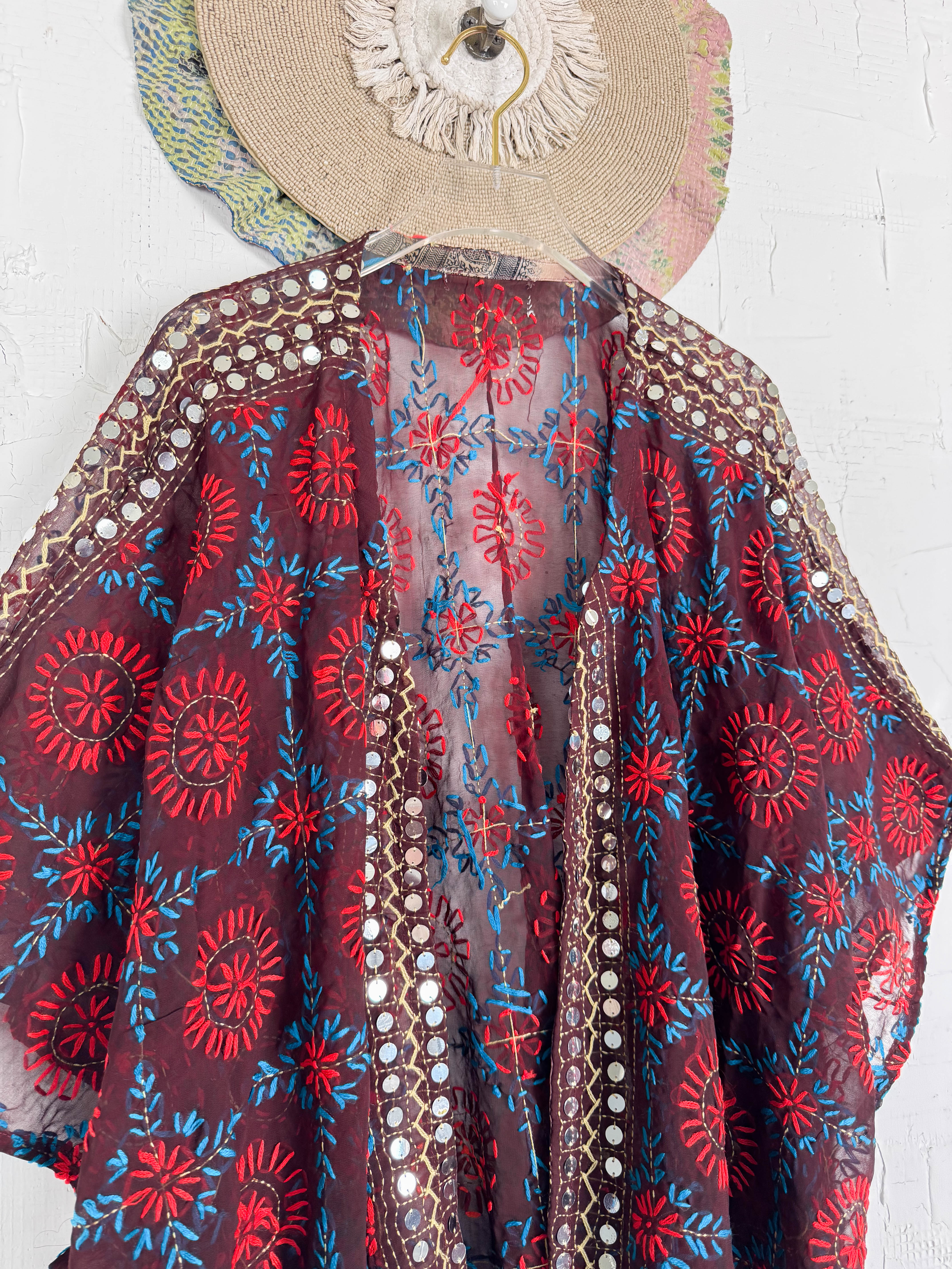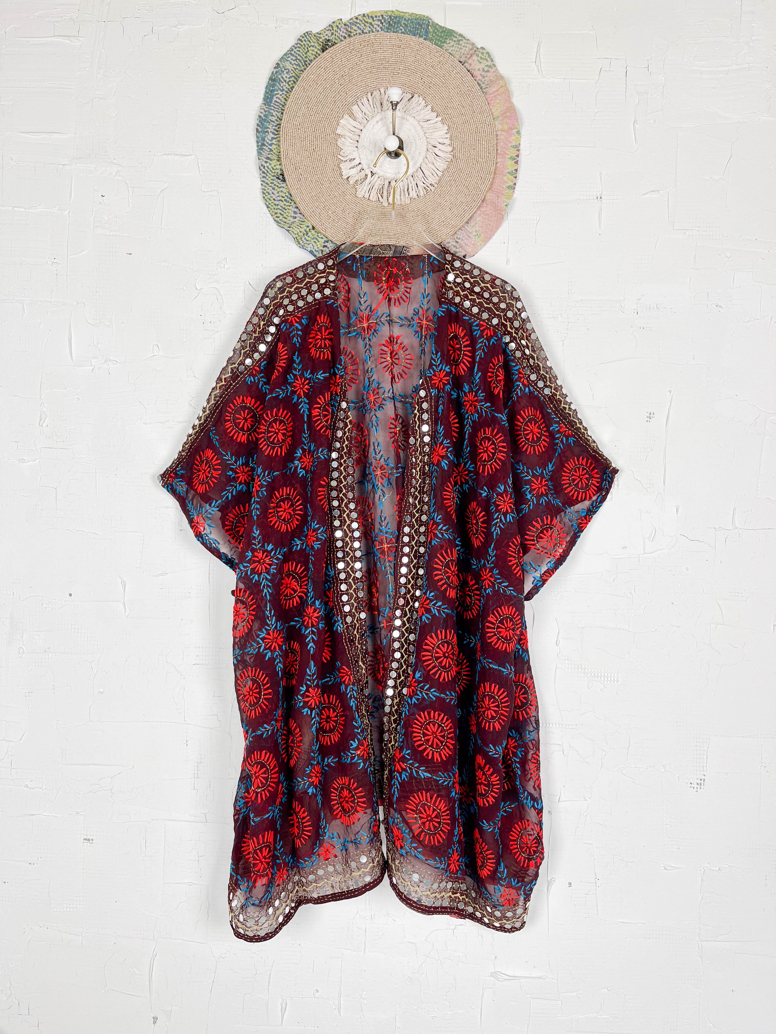 Wrap yourself in the artistry of Mother Earth with this sheer, hand-embroidered cover-up. Crafted from lightweight silk, its semi-transparent fabric whispers elegance, hinting at the beauty beneath. Adorned with vibrant Phulkari, a traditional embroidery from INDIA, each floral motif and geometric touch blooms with rich color. Tiny mirrors dance across the fabric, catching the light with every movement. Designed with an open front and flowing sleeves, this piece drapes effortlessly, adding a touch of bohemian grace and cultural charm to any look, whether as a delicate layer or a stunning lingerie cover. Feel the handcrafted love in every stitch.
