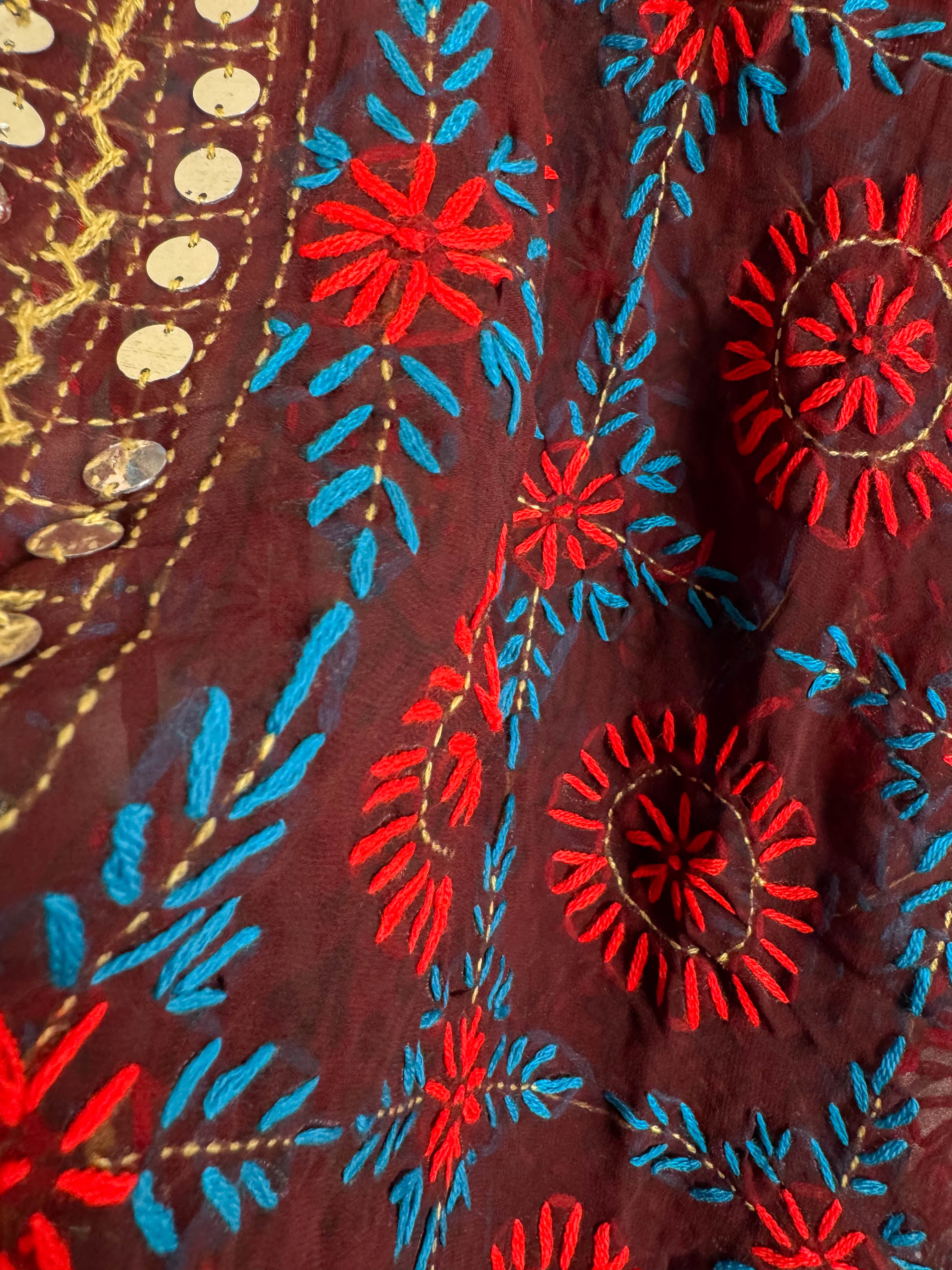 Cultural Aesthetic: The Phulkari embroidery and mirror work give the cover-up a distinct cultural and possibly bohemian-inspired style.