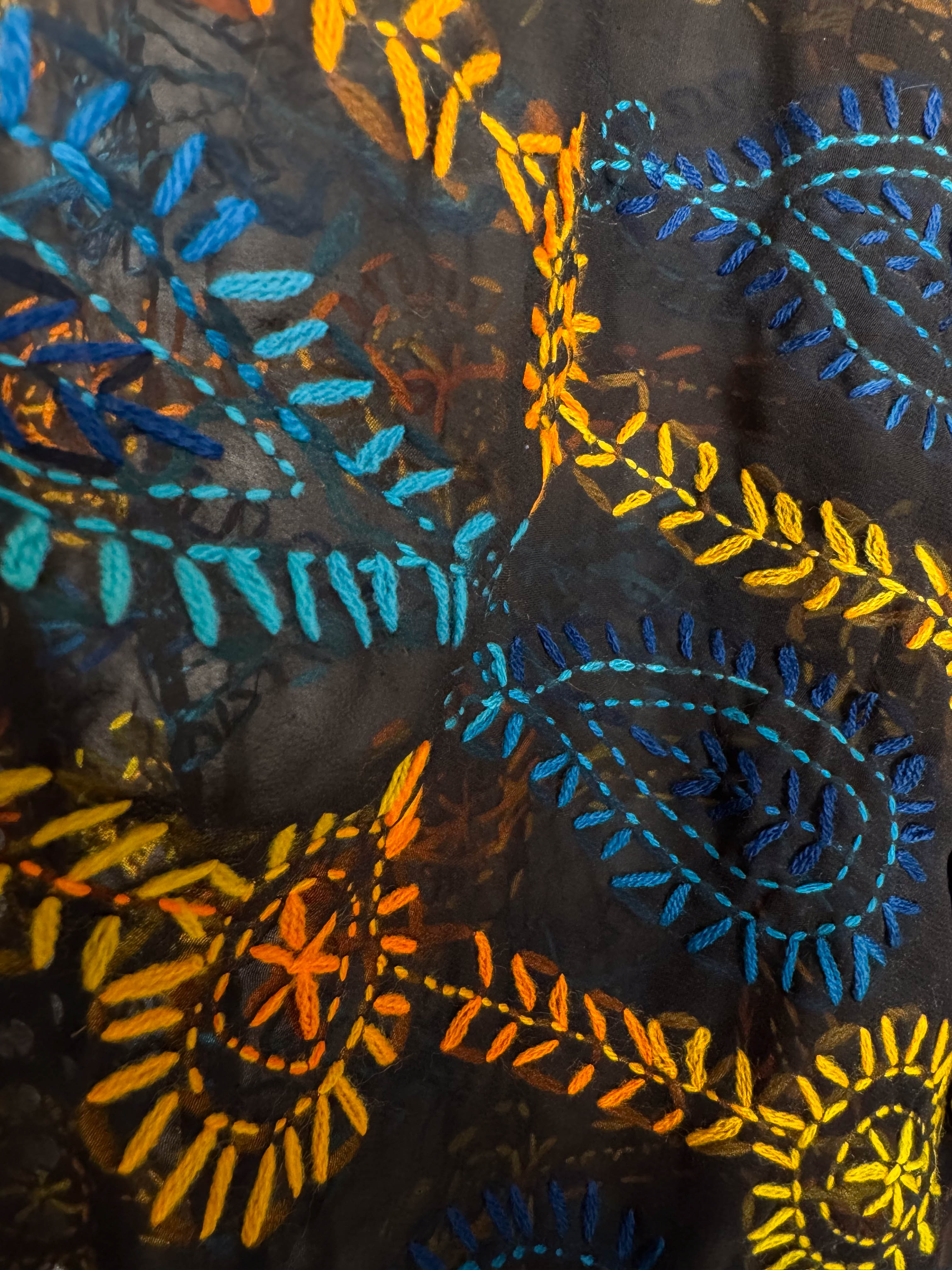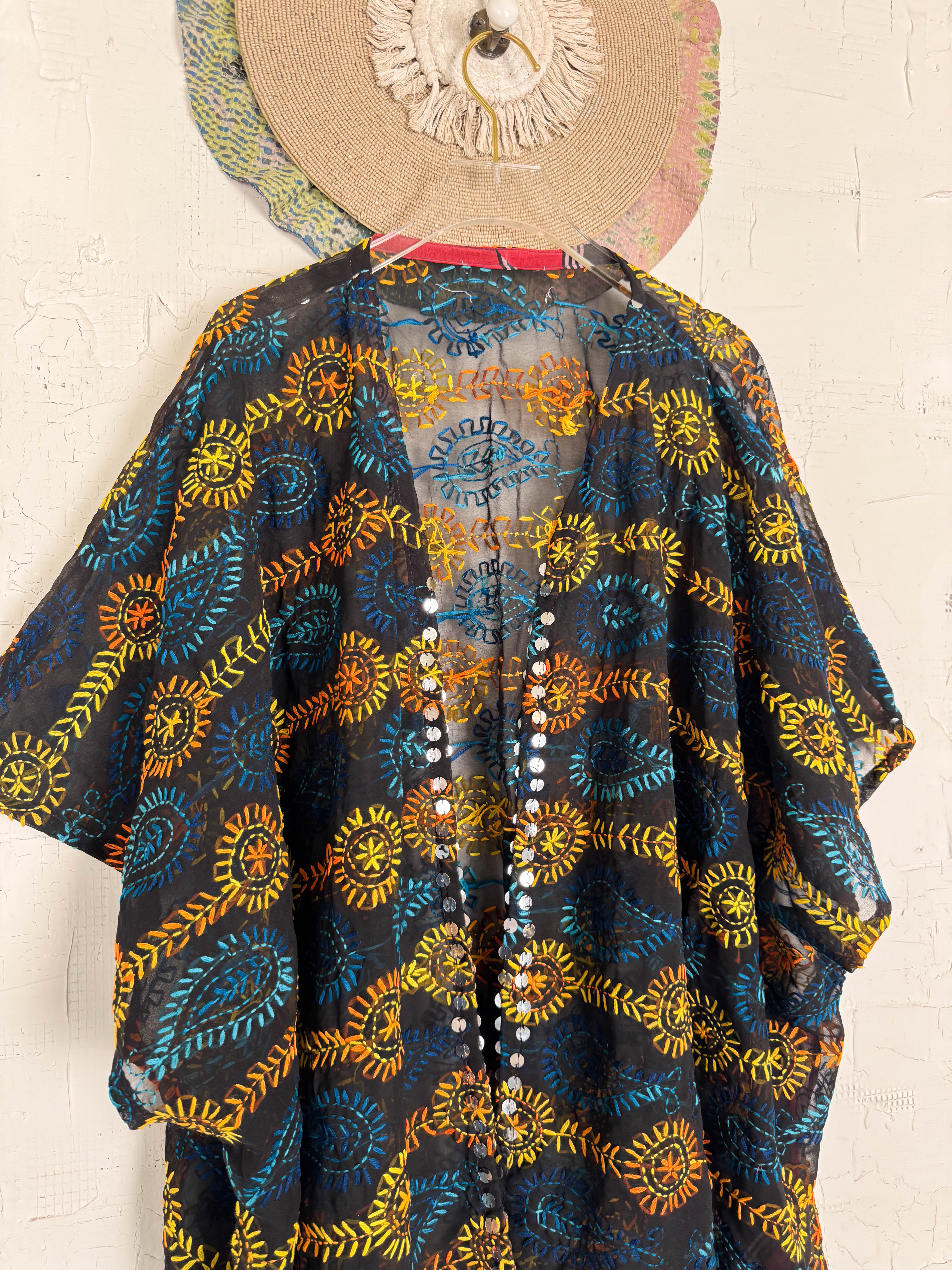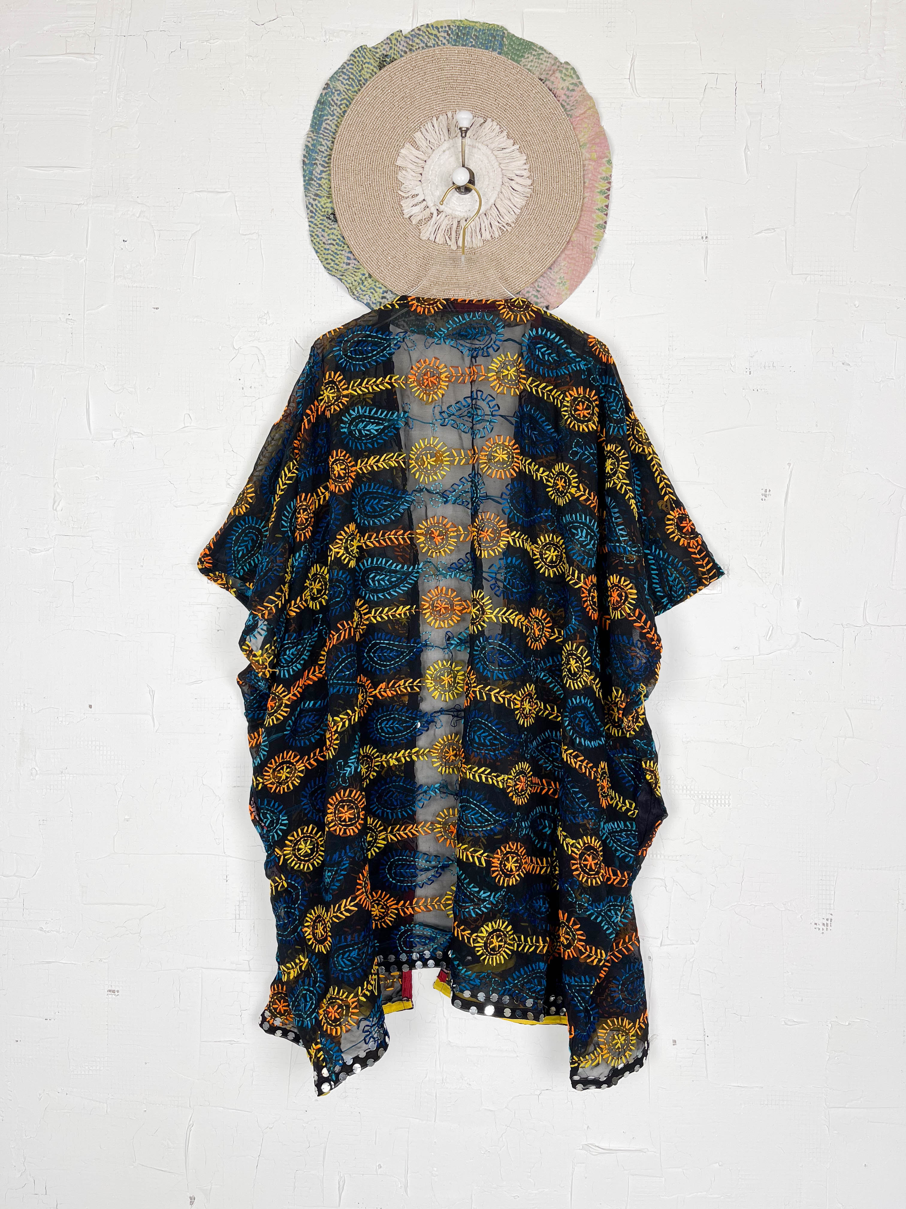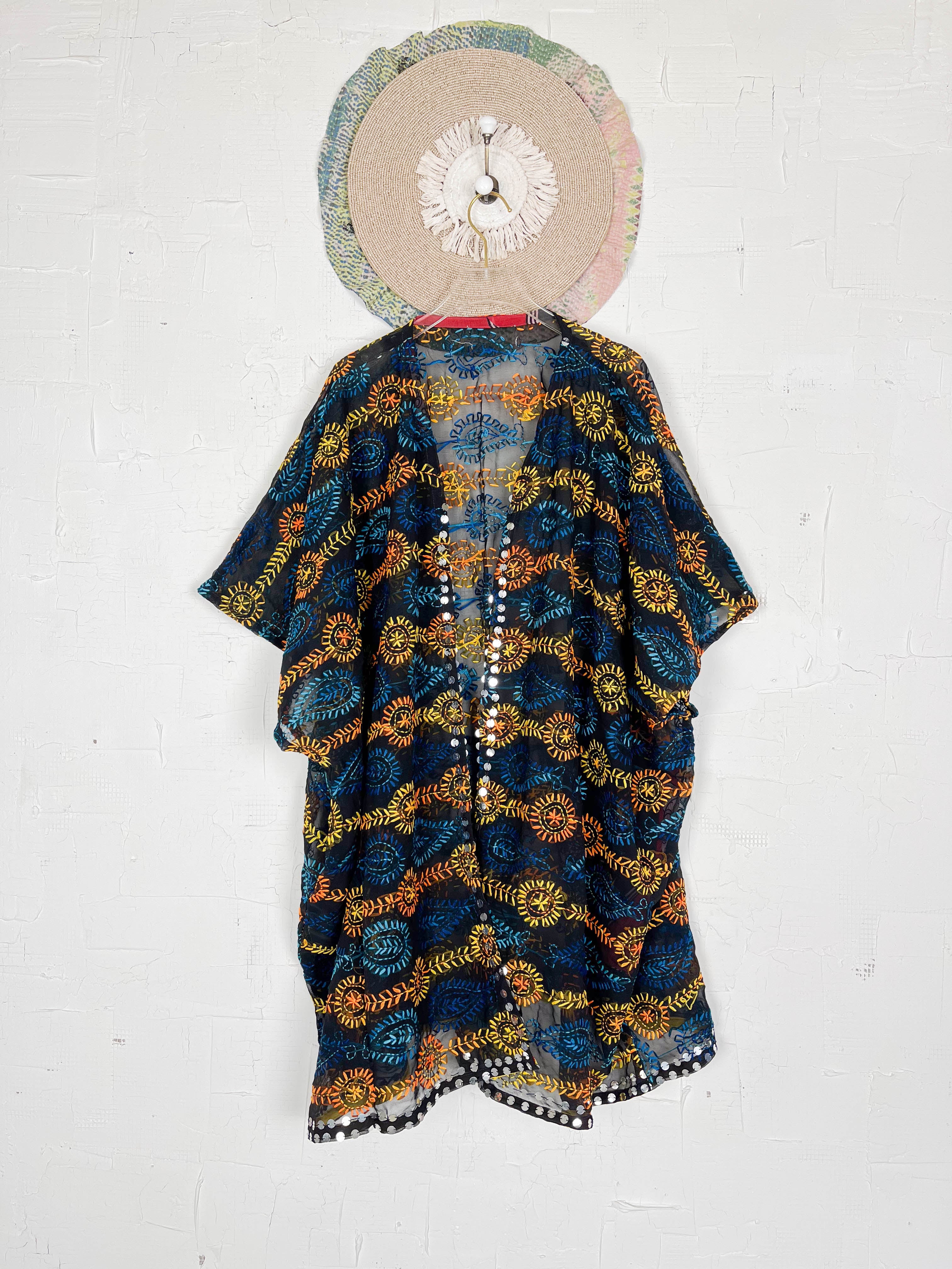 Wrap yourself in the artistry of Mother Earth with this sheer, hand-embroidered cover-up. Crafted from lightweight silk, its semi-transparent fabric whispers elegance, hinting at the beauty beneath. Adorned with vibrant Phulkari, a traditional embroidery from INDIA, each floral motif and geometric touch blooms with rich color. Tiny mirrors dance across the fabric, catching the light with every movement. Designed with an open front and flowing sleeves, this piece drapes effortlessly, adding a touch of bohemian grace and cultural charm to any look, whether as a delicate layer or a stunning lingerie cover. Feel the handcrafted love in every stitch.