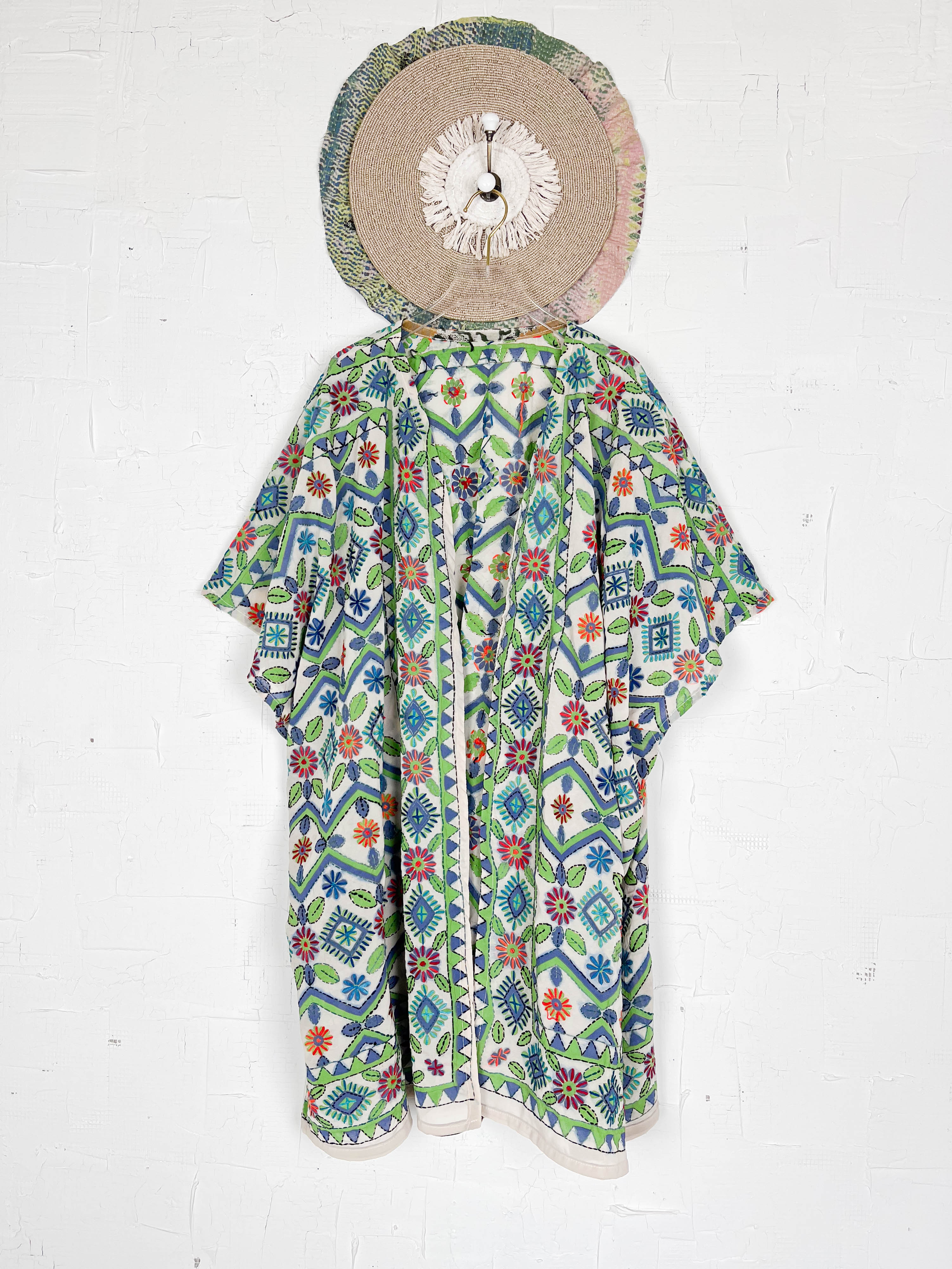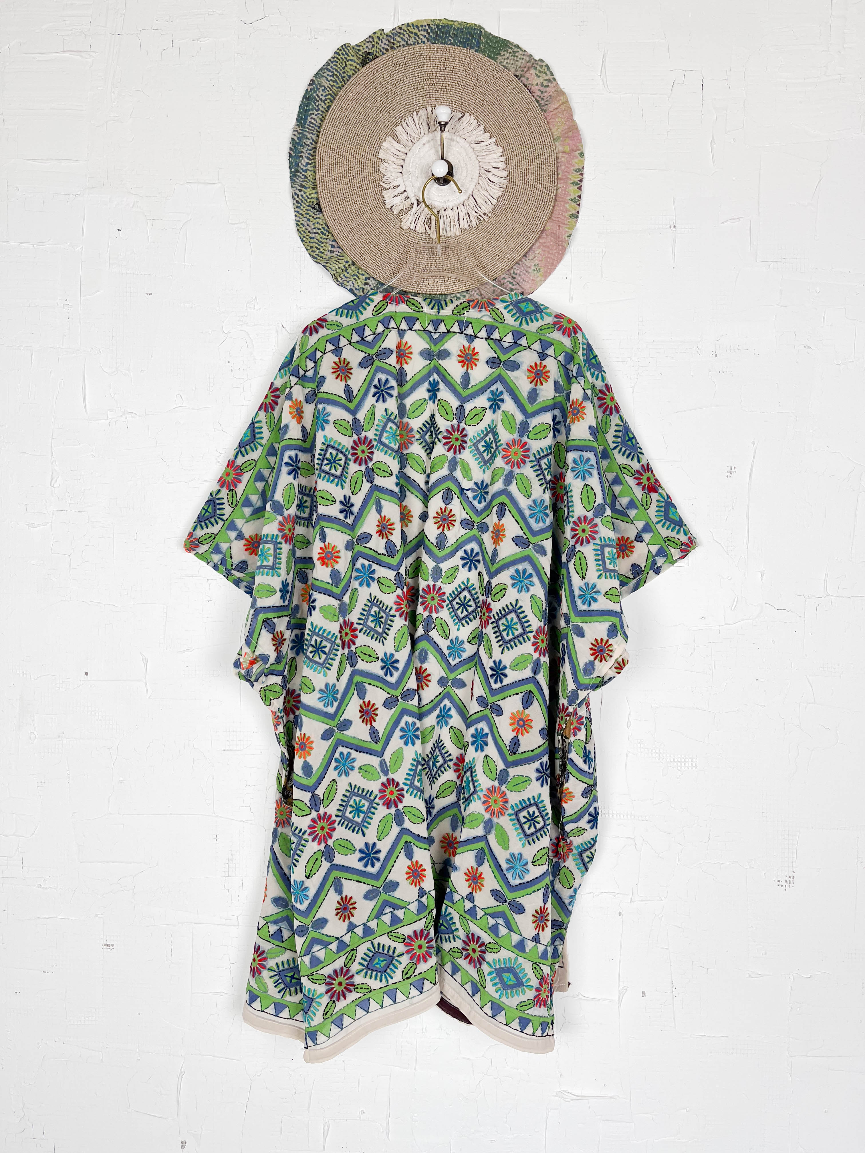 Cultural Aesthetic: The Phulkari embroidery and mirror work give the cover-up a distinct cultural and possibly bohemian-inspired style.