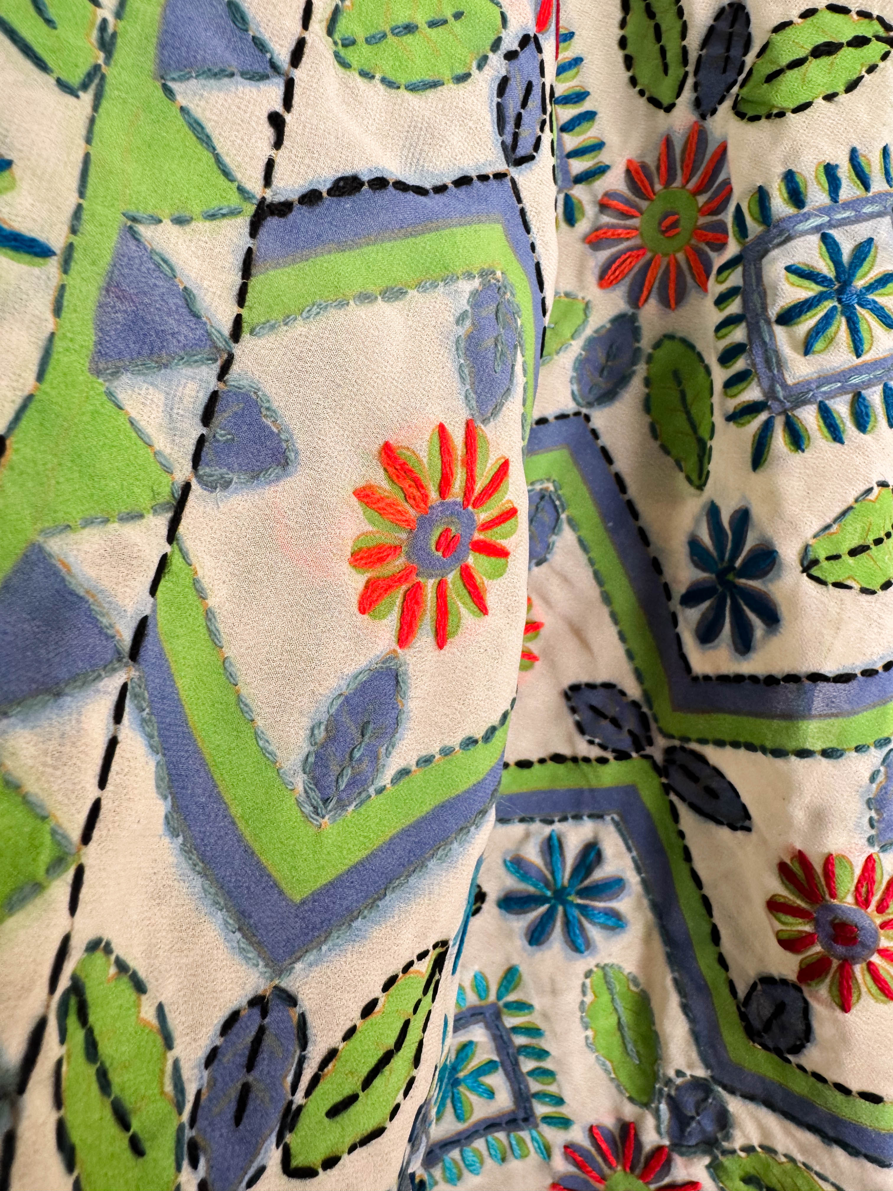 Phulkari Embroidery: The garment is decorated with Phulkari embroidery, a traditional needlework style from the India region. The embroidery is characterized by: