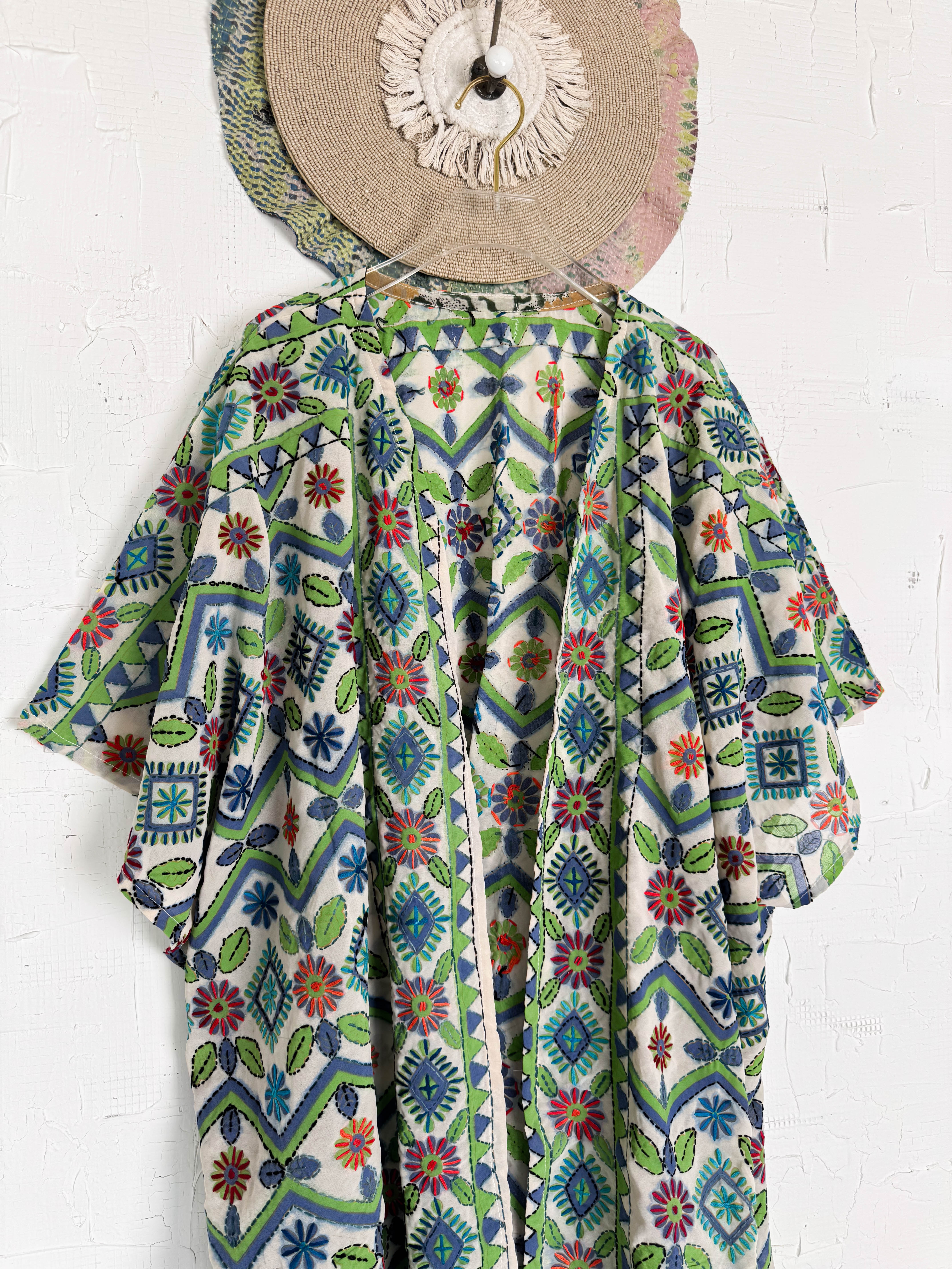 Wrap yourself in the artistry of Mother Earth with this sheer, hand-embroidered cover-up. Crafted from lightweight silk, its semi-transparent fabric whispers elegance, hinting at the beauty beneath. Adorned with vibrant Phulkari, a traditional embroidery from INDIA, each floral motif and geometric touch blooms with rich color. Tiny mirrors dance across the fabric, catching the light with every movement. Designed with an open front and flowing sleeves, this piece drapes effortlessly, adding a touch of bohemian grace and cultural charm to any look, whether as a delicate layer or a stunning lingerie cover. Feel the handcrafted love in every stitch.