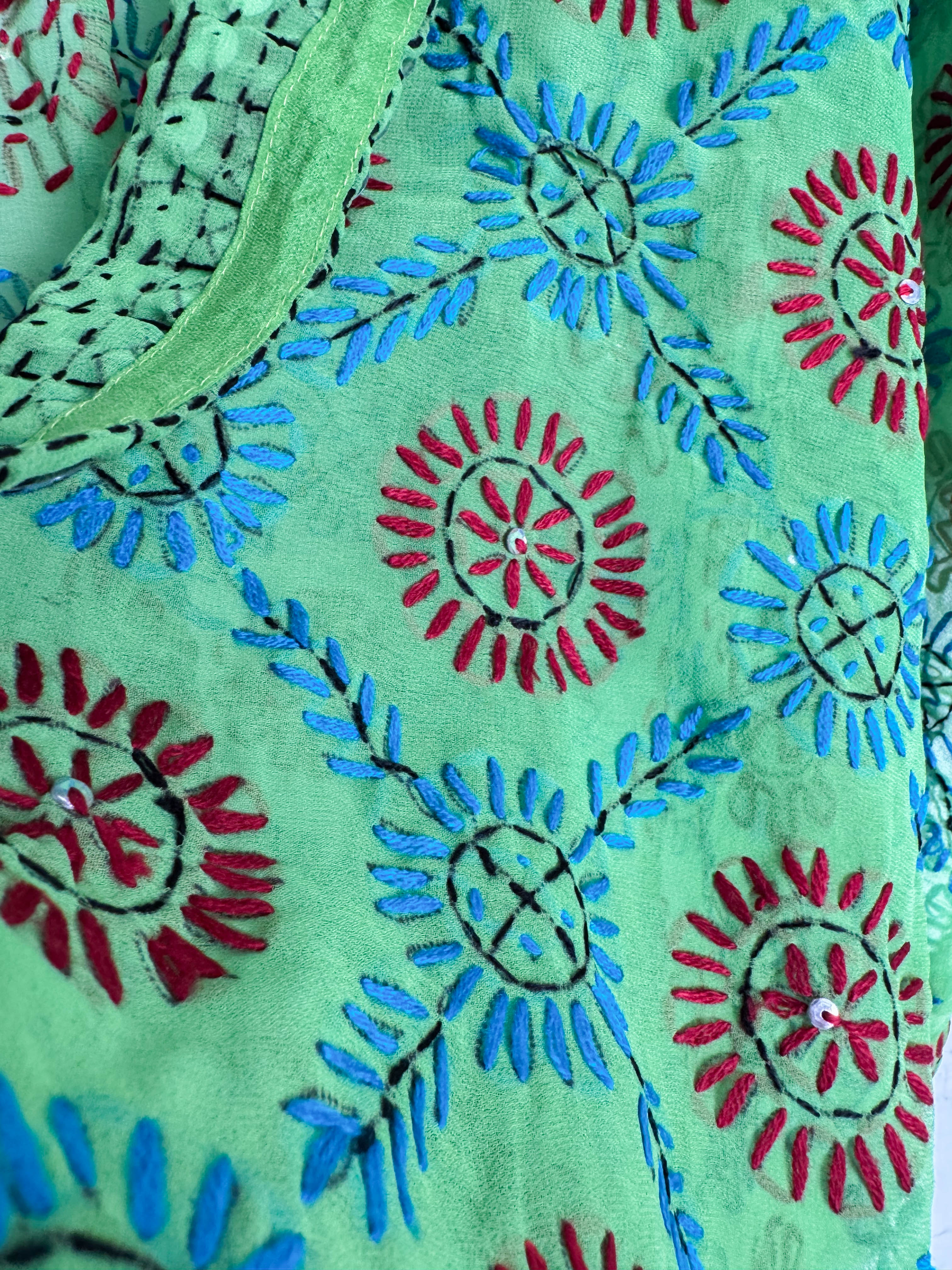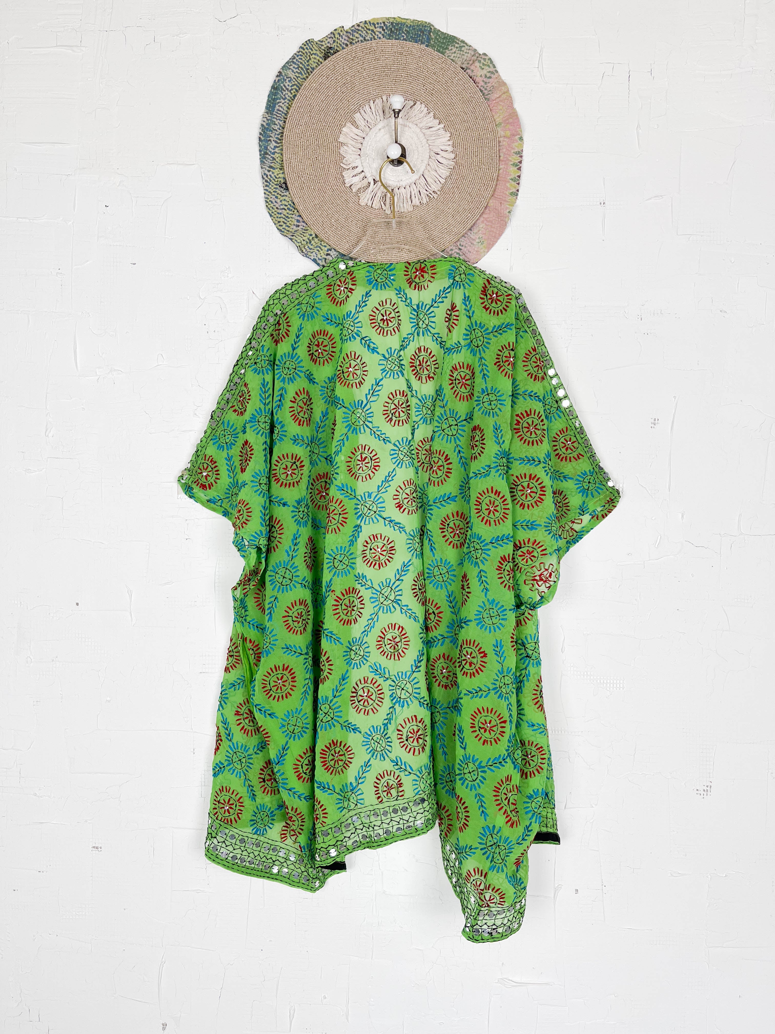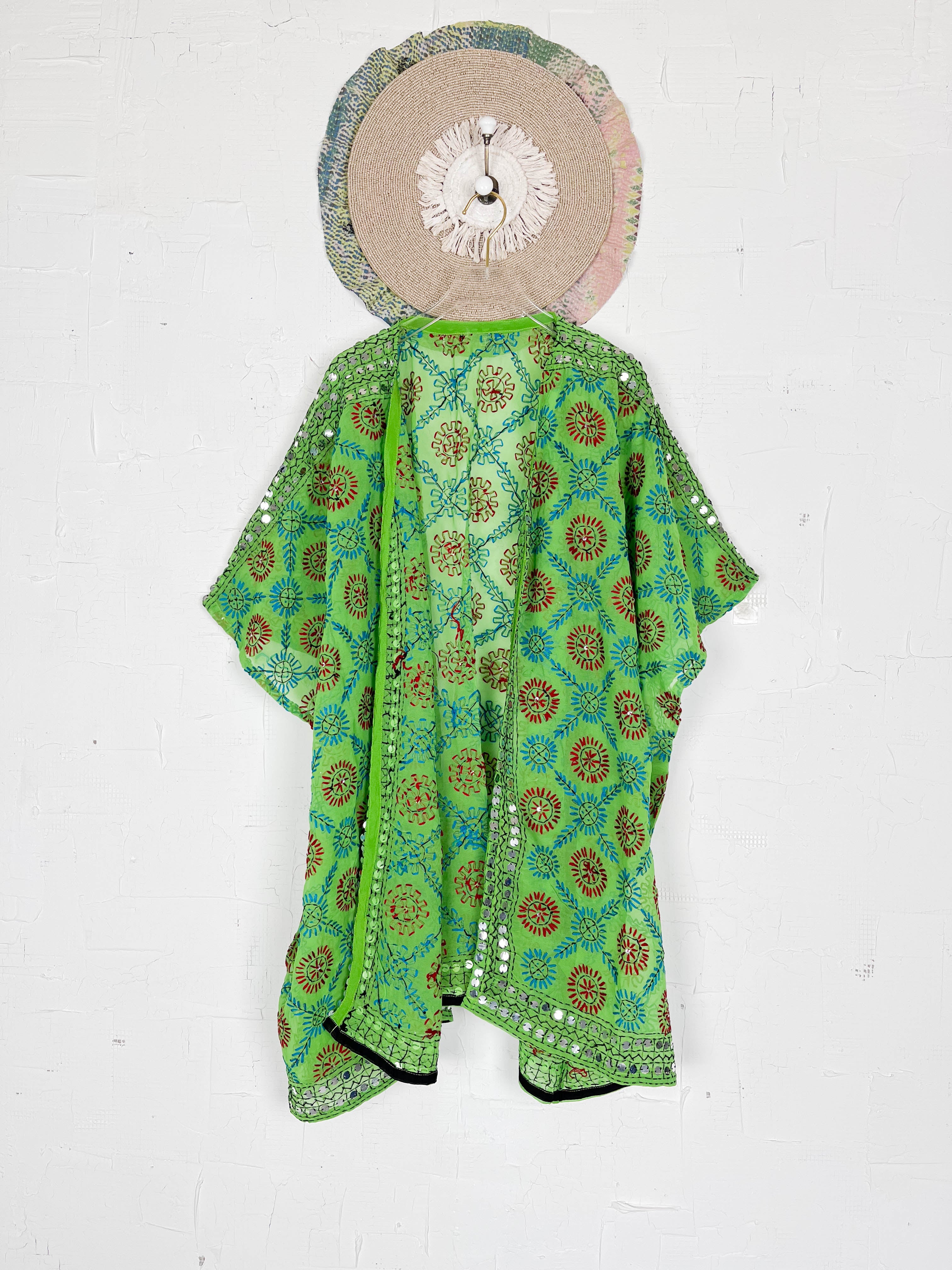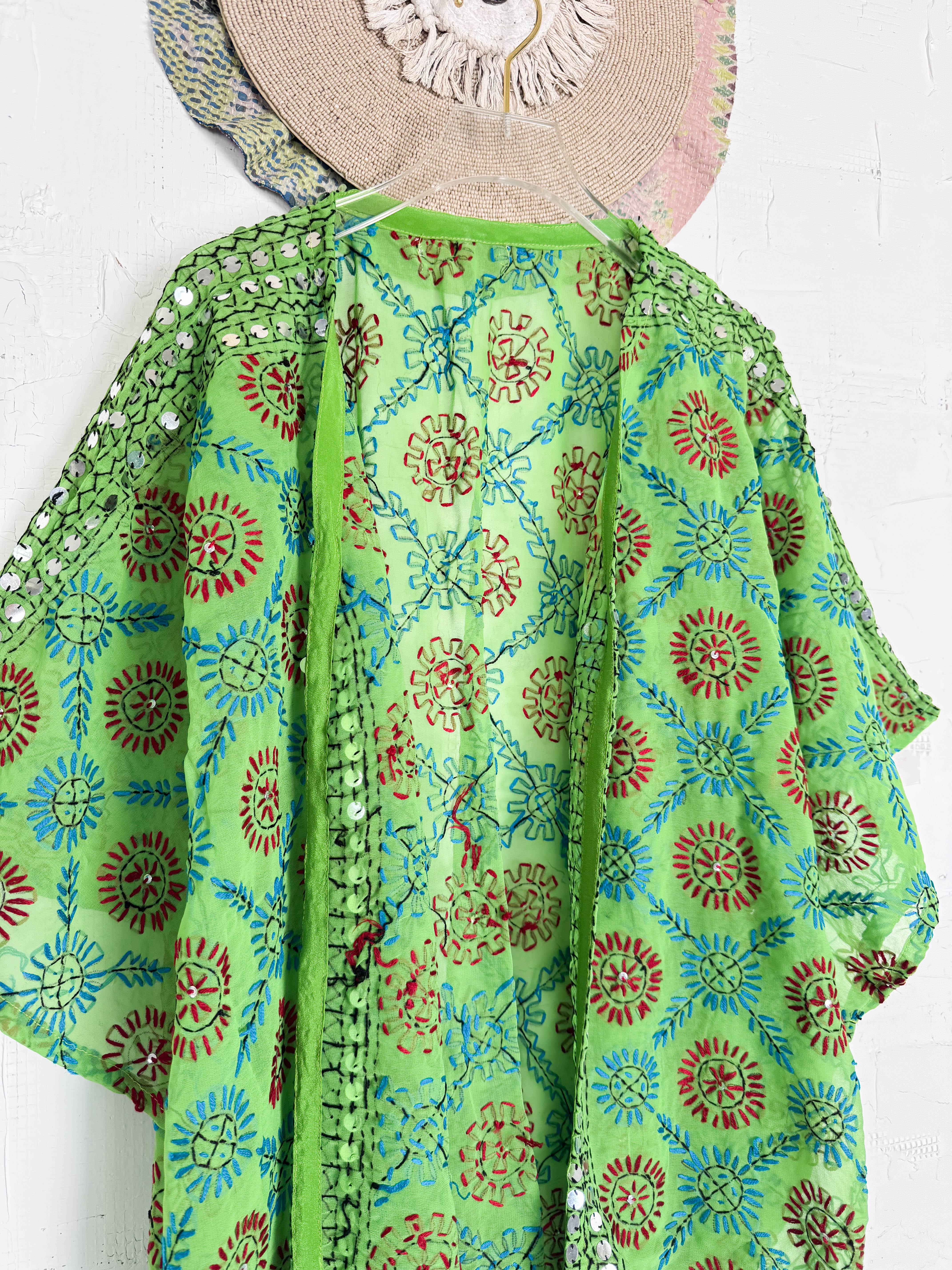 Wrap yourself in the artistry of Mother Earth with this sheer, hand-embroidered cover-up. Crafted from lightweight silk, its semi-transparent fabric whispers elegance, hinting at the beauty beneath. Adorned with vibrant Phulkari, a traditional embroidery from INDIA, each floral motif and geometric touch blooms with rich color. Tiny mirrors dance across the fabric, catching the light with every movement. Designed with an open front and flowing sleeves, this piece drapes effortlessly, adding a touch of bohemian grace and cultural charm to any look, whether as a delicate layer or a stunning lingerie cover. Feel the handcrafted love in every stitch.