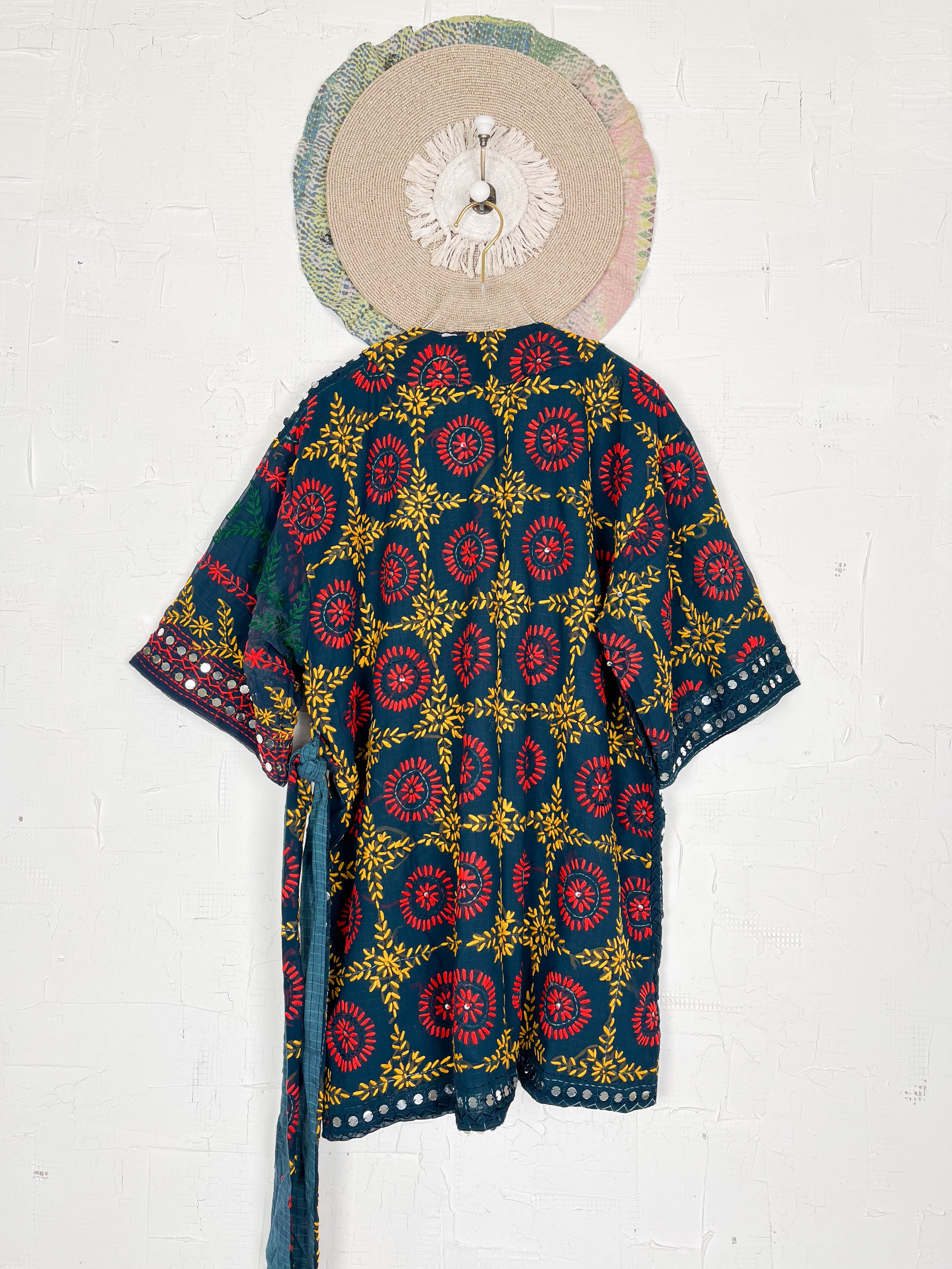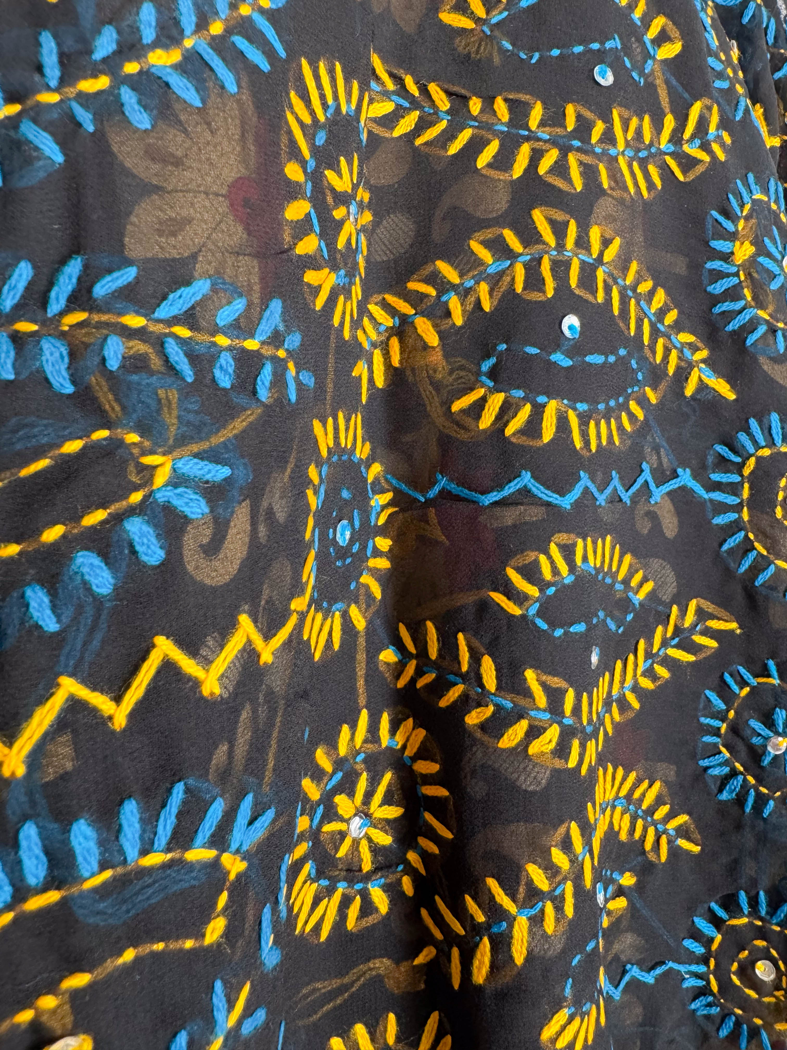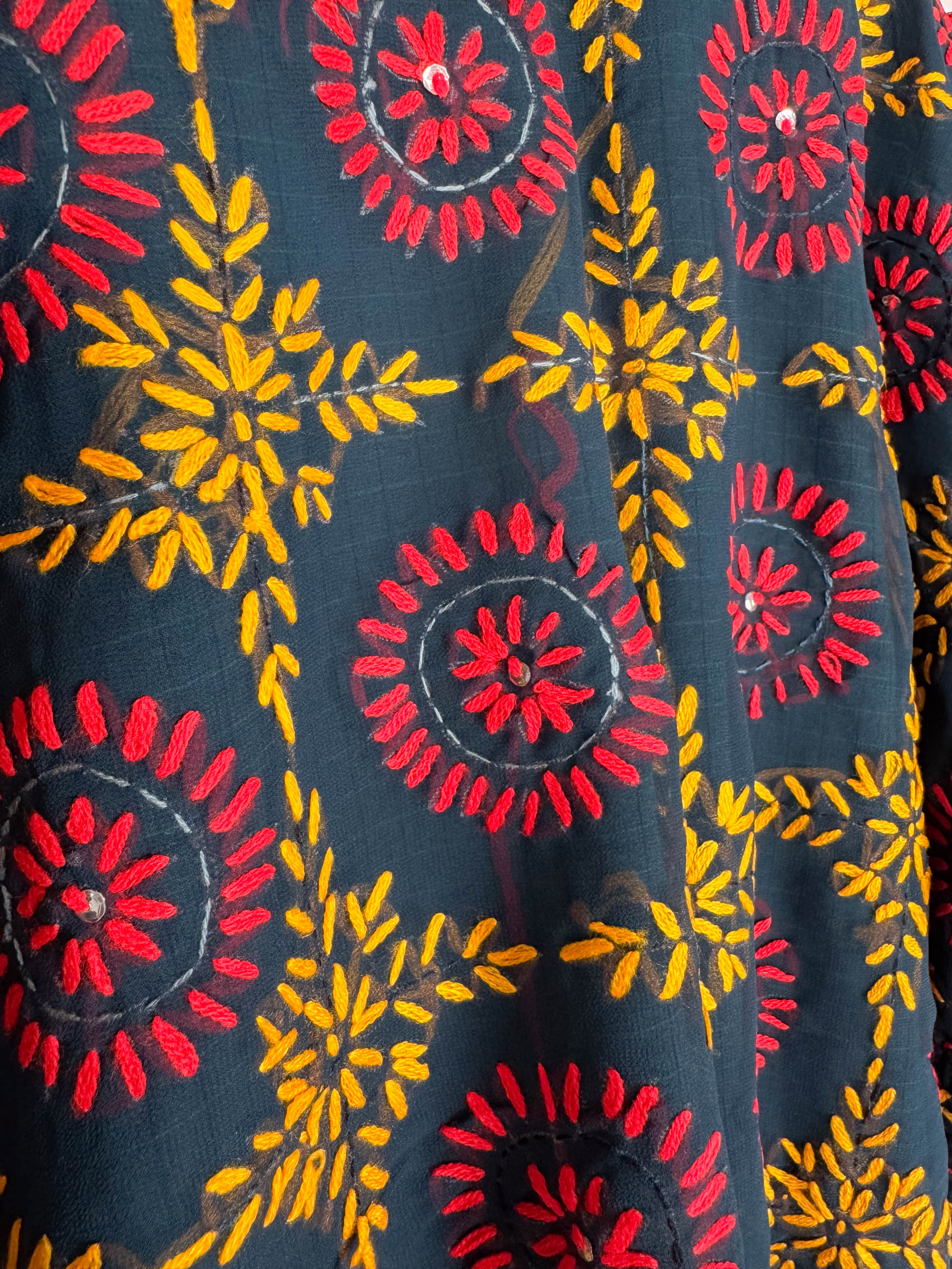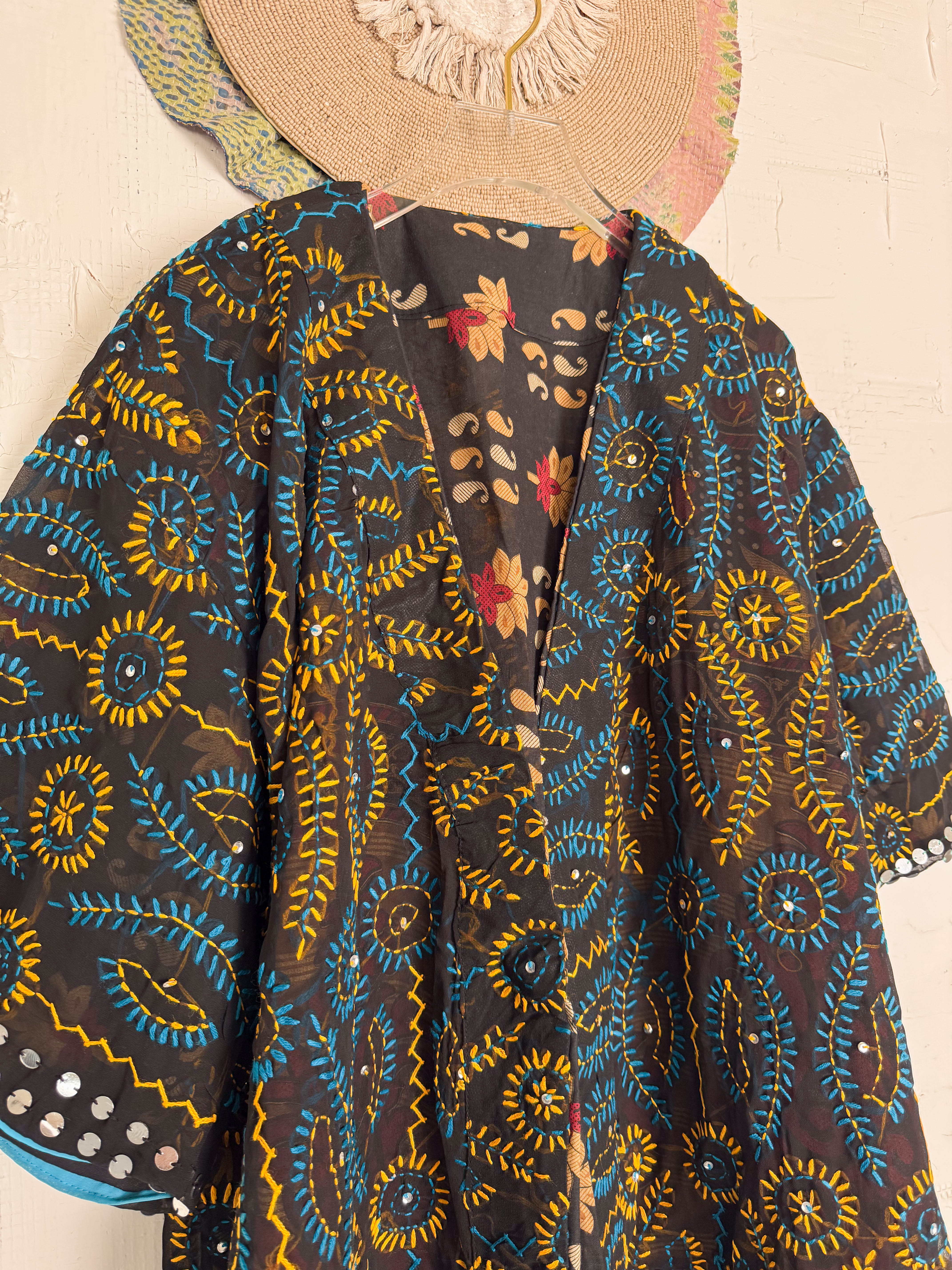 Imagine draping yourself in this exquisite Floral hand-embroidered Short Phulkari Robe, a wearable whisper of nature's artistry. Each delicate motif, lovingly stitched by hand, draws inspiration from the vibrant tapestry of Mother Earth – a tangible connection you can feel with your fingertips. For your playful feminine essence, this thoughtful combination lends the robe a unique flow and captivating texture. Lined with soft, vintage cotton inside. A subtle glimpse of folded sleeves gives it uniqueness. Created to cascade beautifully on all body shapes and sizes, this robe promises an ethereal flow with every movement.