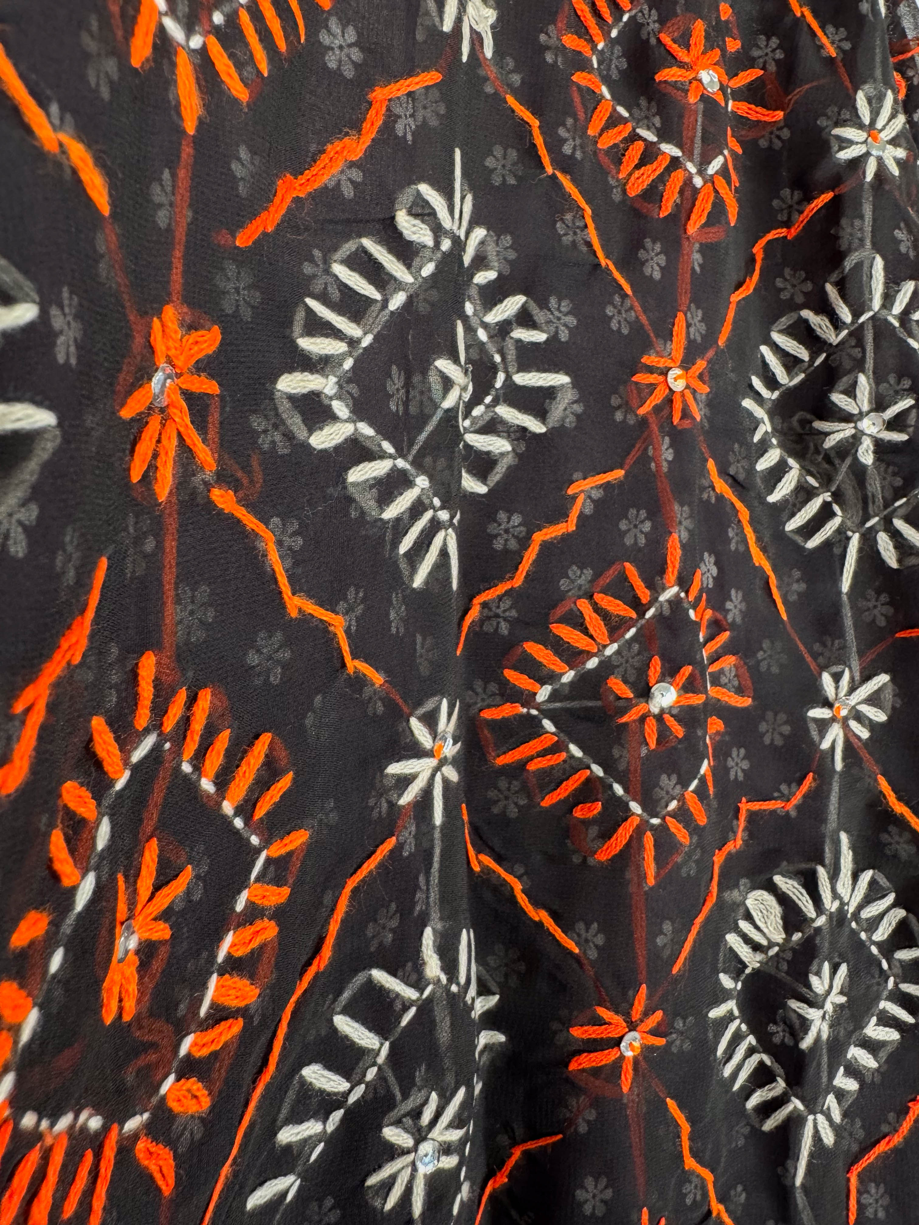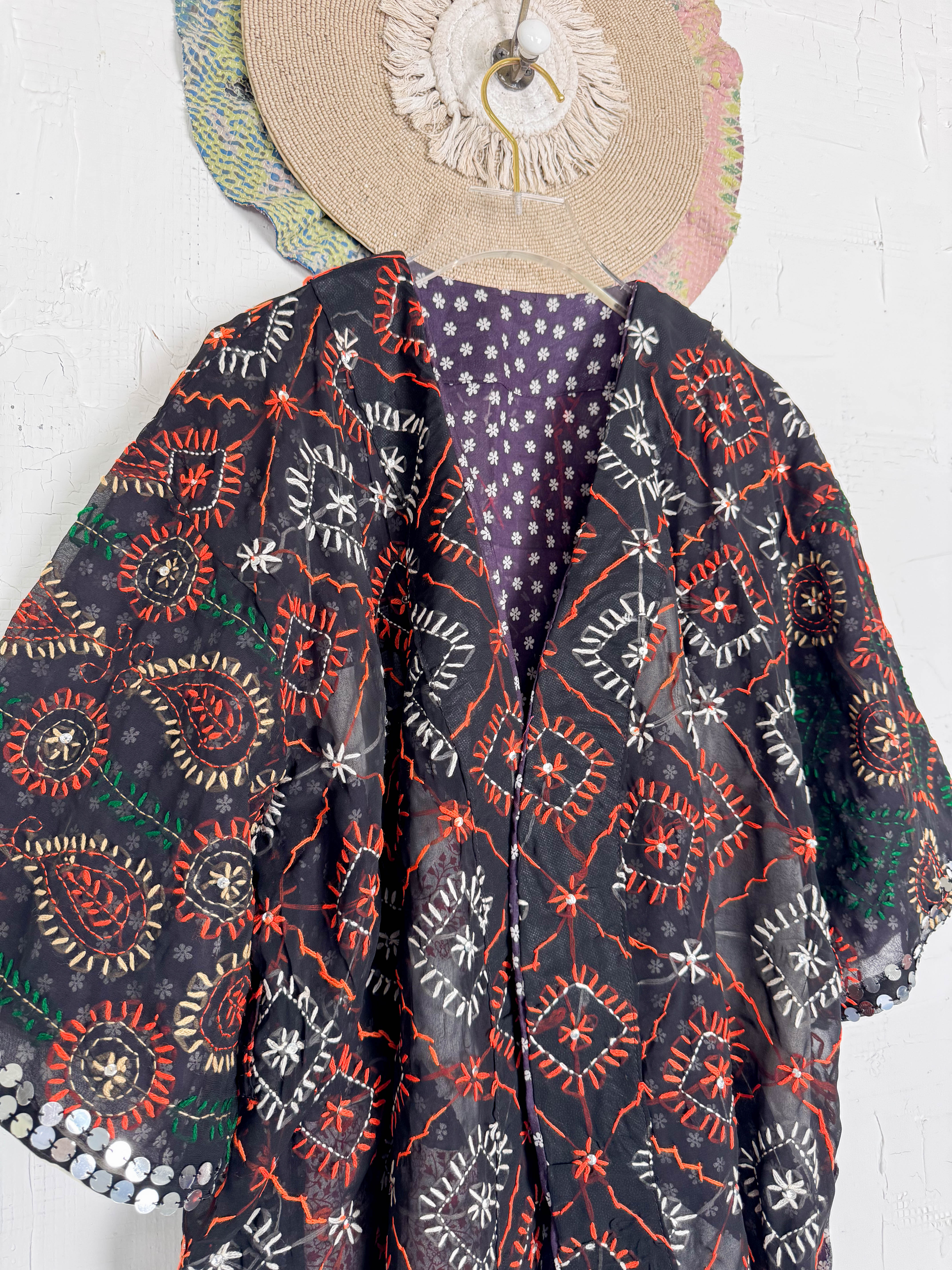 Imagine draping yourself in this exquisite Floral hand-embroidered Short Phulkari Robe, a wearable whisper of nature's artistry. Each delicate motif, lovingly stitched by hand, draws inspiration from the vibrant tapestry of Mother Earth – a tangible connection you can feel with your fingertips. For your playful feminine essence, this thoughtful combination lends the robe a unique flow and captivating texture. Lined with soft, vintage cotton inside. A subtle glimpse of folded sleeves gives it uniqueness. Created to cascade beautifully on all body shapes and sizes, this robe promises an ethereal flow with every movement.