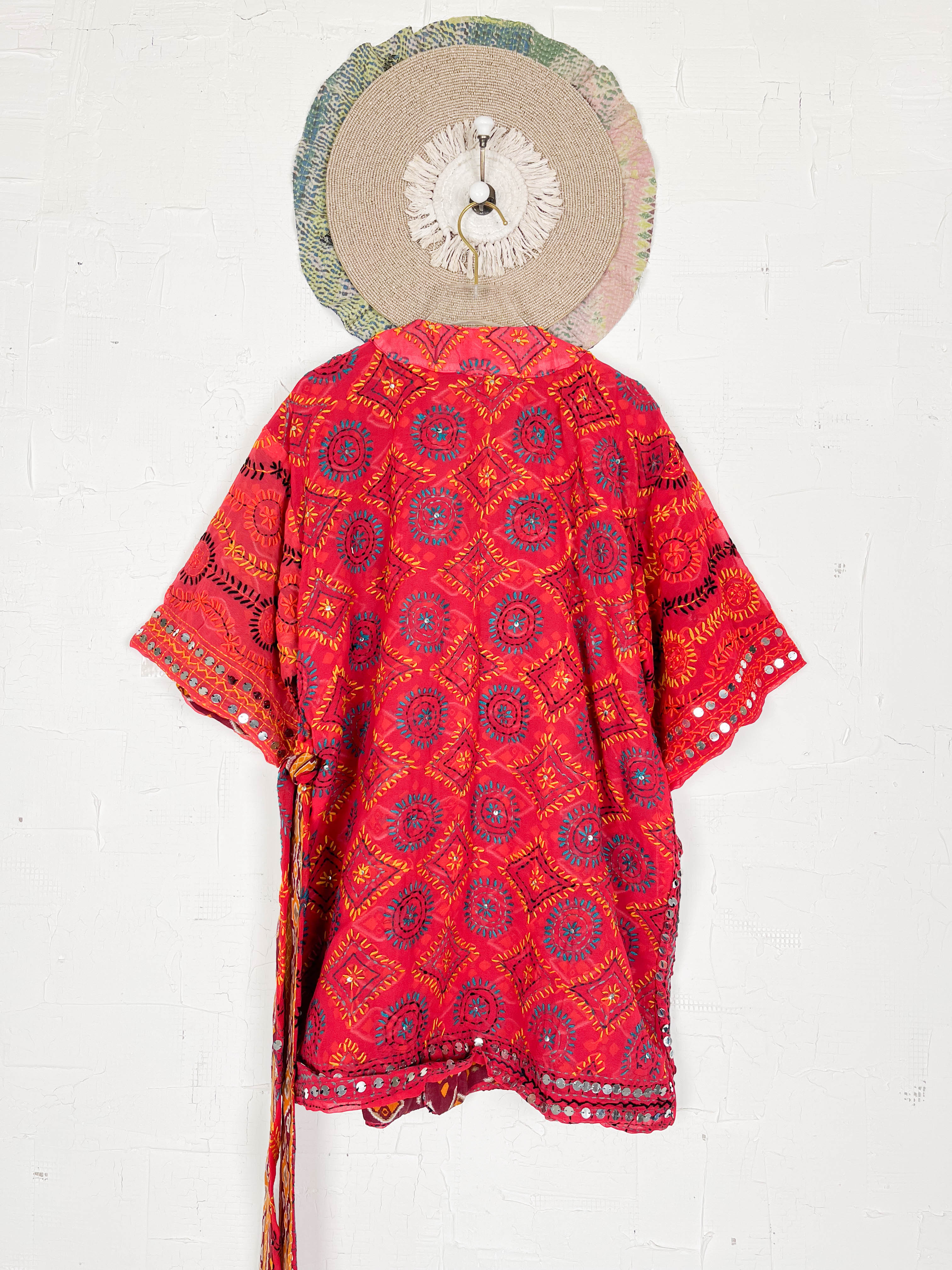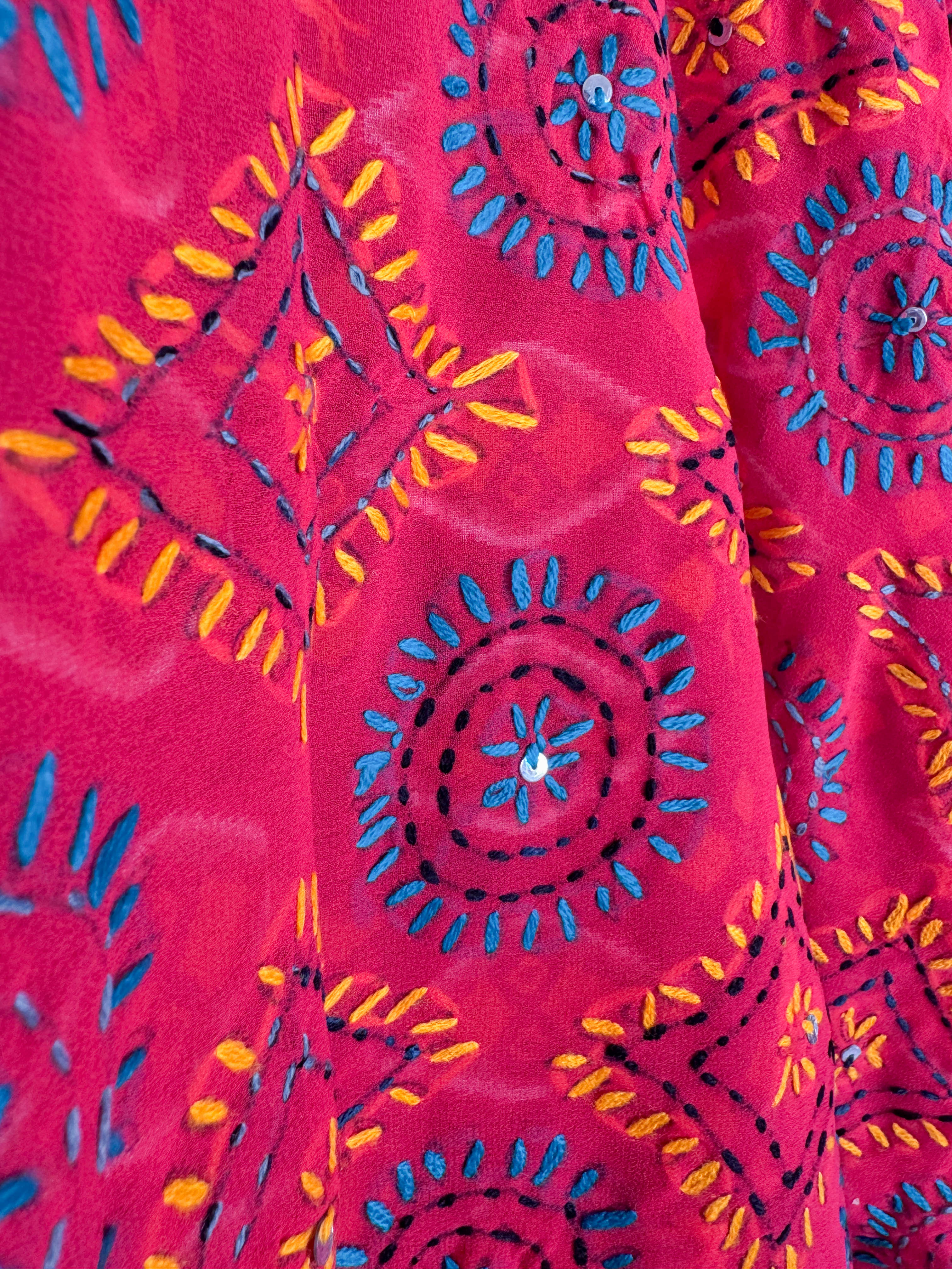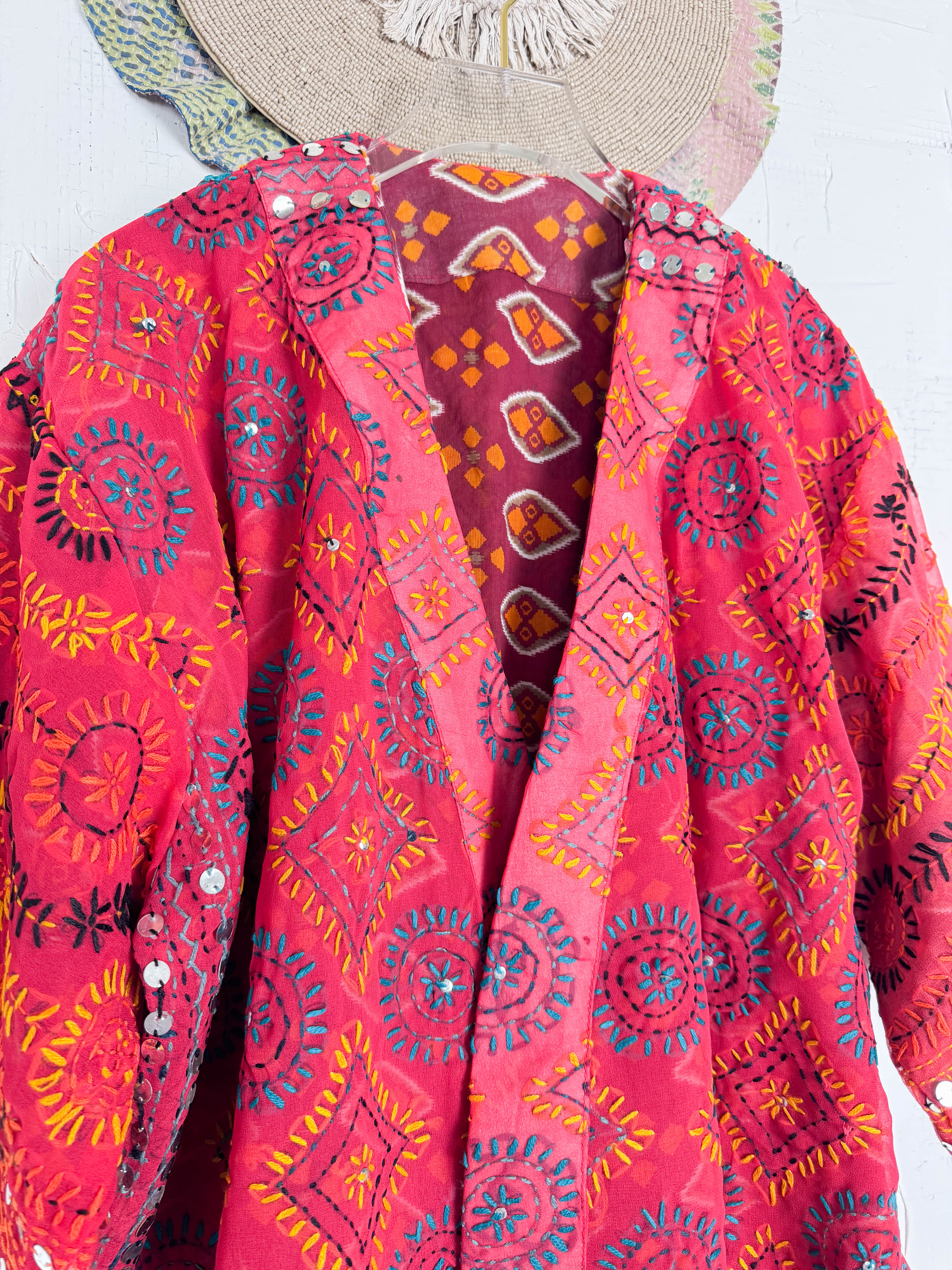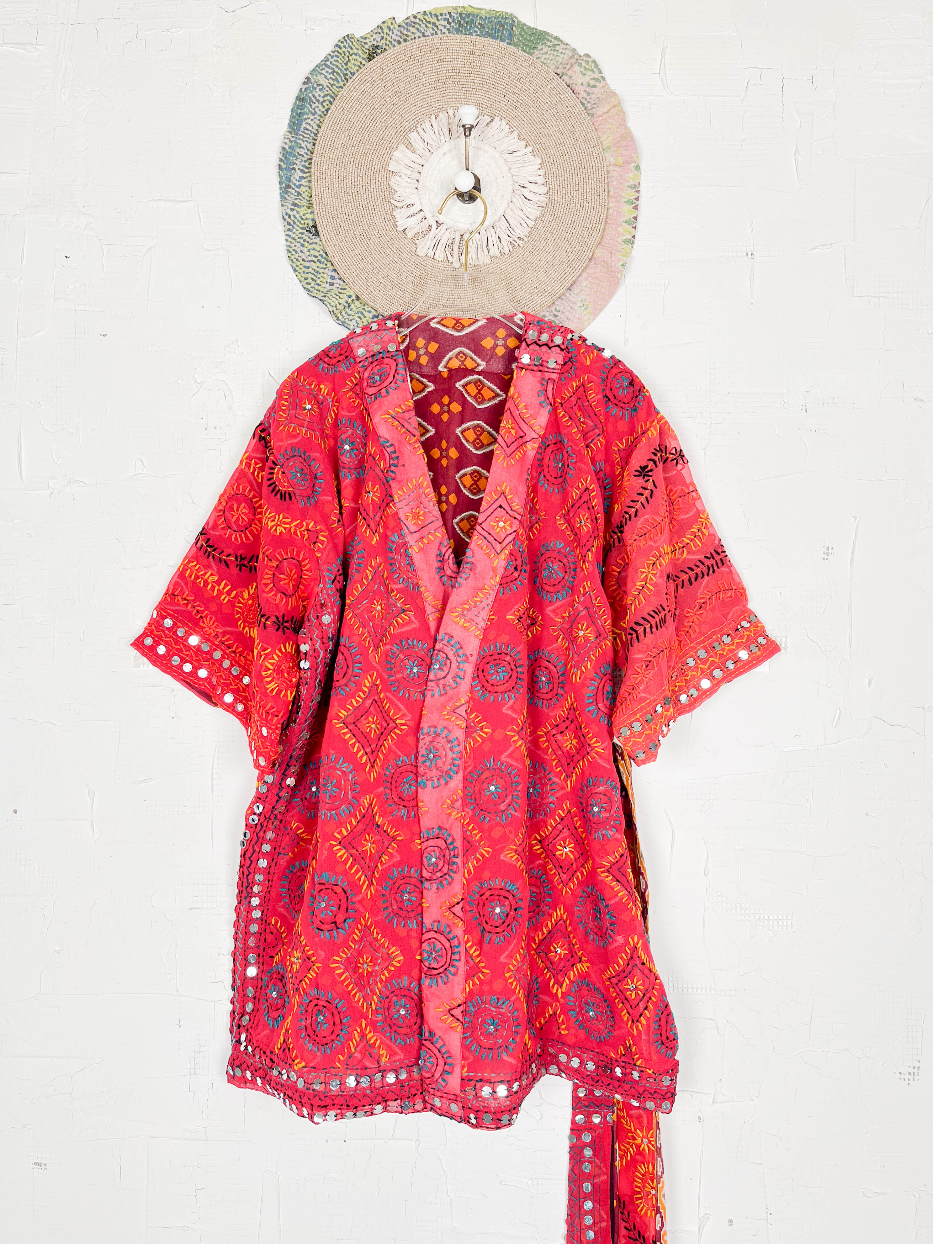 Imagine draping yourself in this exquisite Floral hand-embroidered Short Phulkari Robe, a wearable whisper of nature's artistry. Each delicate motif, lovingly stitched by hand, draws inspiration from the vibrant tapestry of Mother Earth – a tangible connection you can feel with your fingertips. For your playful feminine essence, this thoughtful combination lends the robe a unique flow and captivating texture. Lined with soft, vintage cotton inside. A subtle glimpse of folded sleeves gives it uniqueness. Created to cascade beautifully on all body shapes and sizes, this robe promises an ethereal flow with every movement.