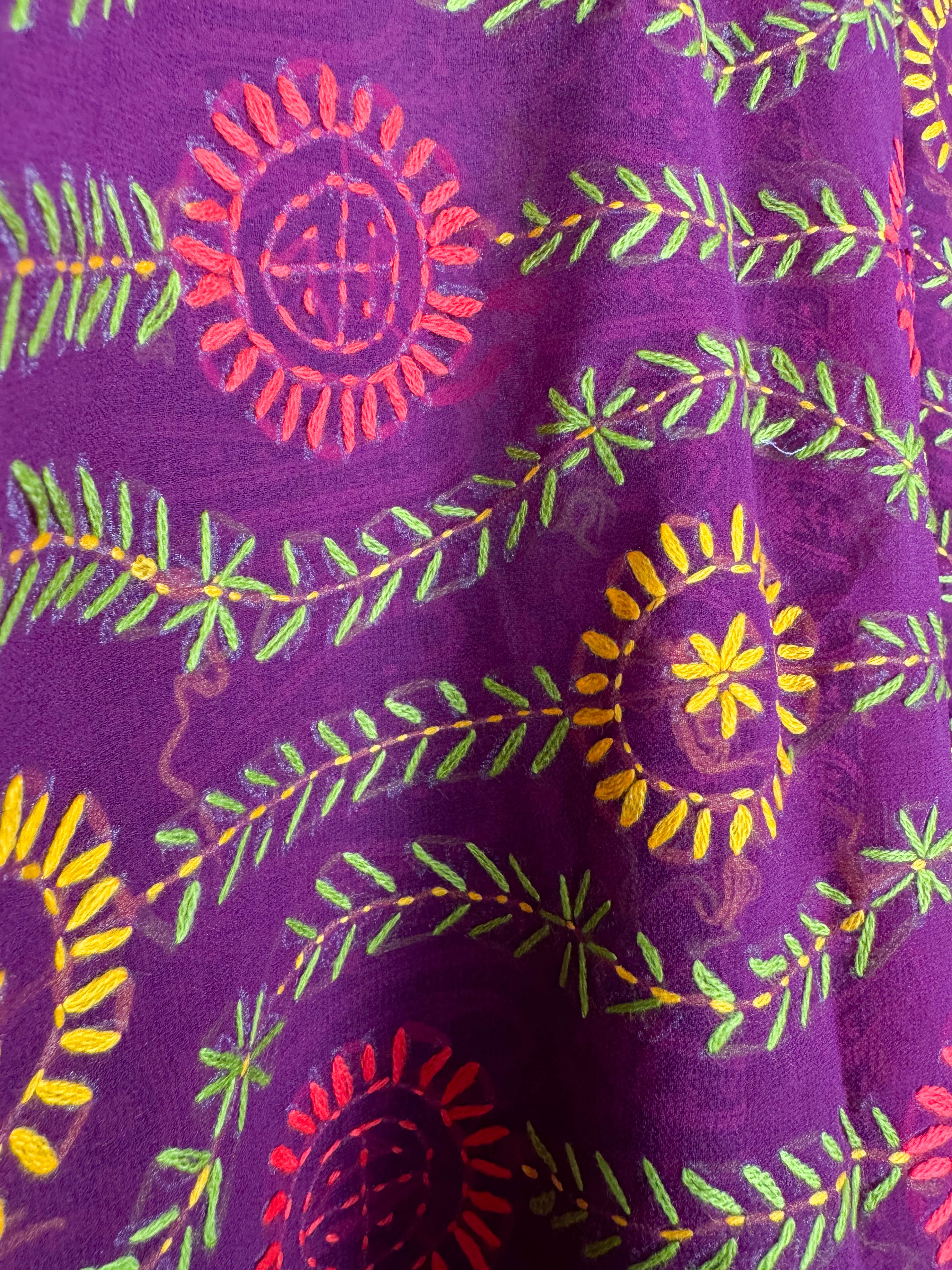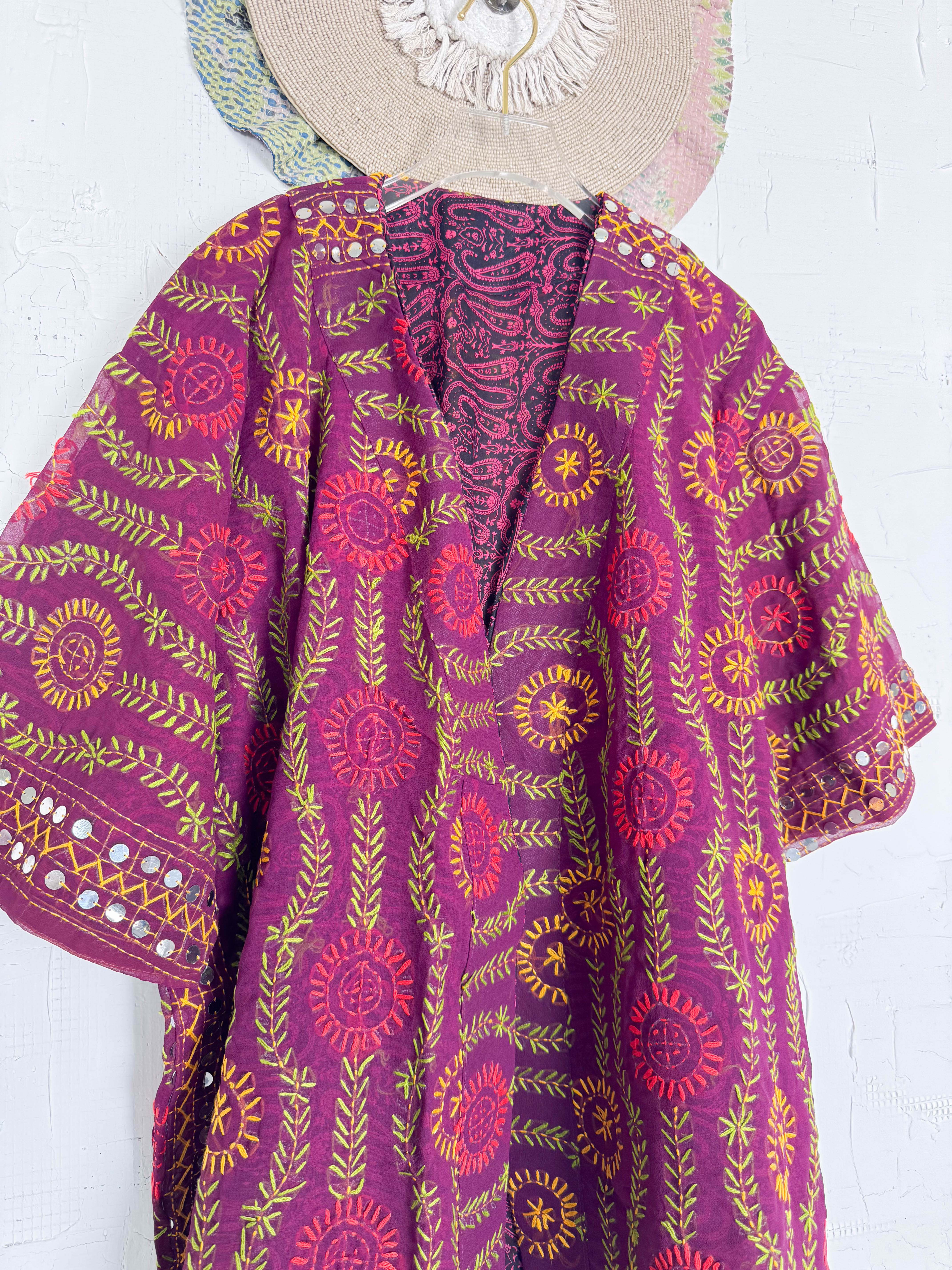 Imagine draping yourself in this exquisite Floral hand-embroidered Short Phulkari Robe, a wearable whisper of nature's artistry. Each delicate motif, lovingly stitched by hand, draws inspiration from the vibrant tapestry of Mother Earth – a tangible connection you can feel with your fingertips. For your playful feminine essence, this thoughtful combination lends the robe a unique flow and captivating texture. Lined with soft, vintage cotton inside. A subtle glimpse of folded sleeves gives it uniqueness. Created to cascade beautifully on all body shapes and sizes, this robe promises an ethereal flow with every movement.