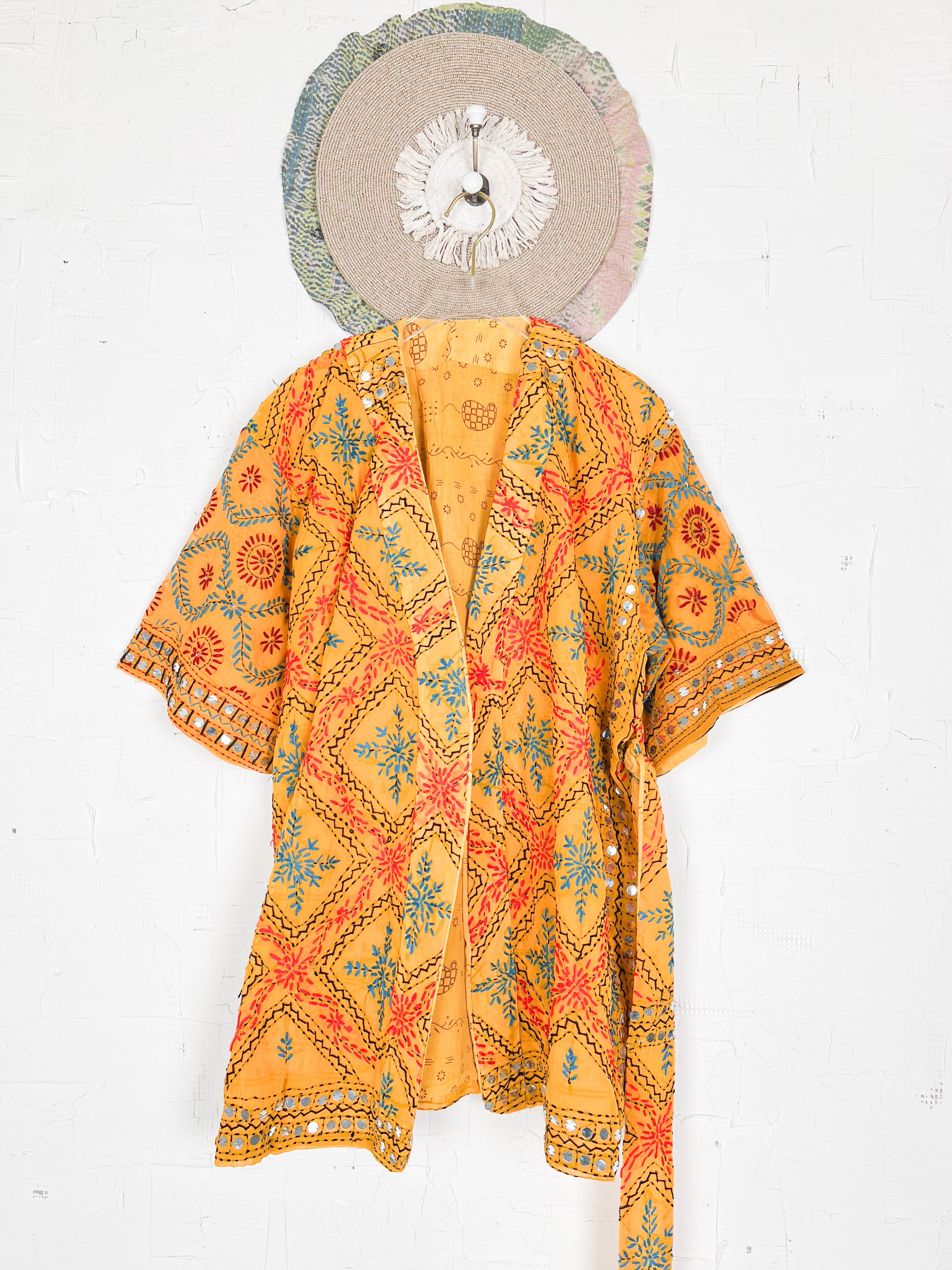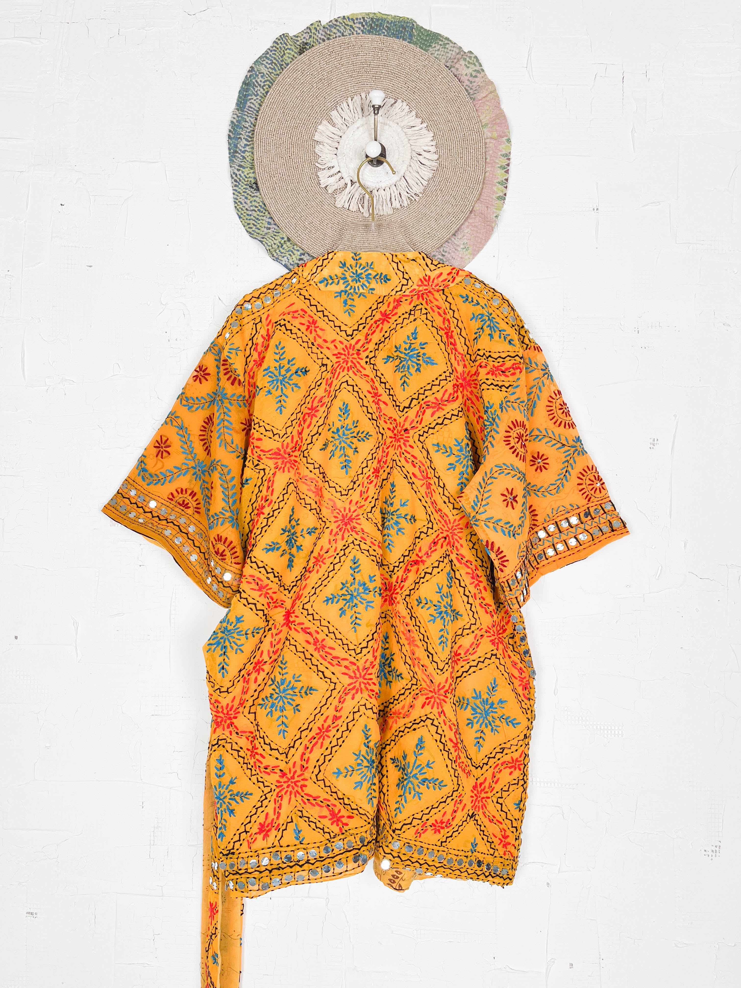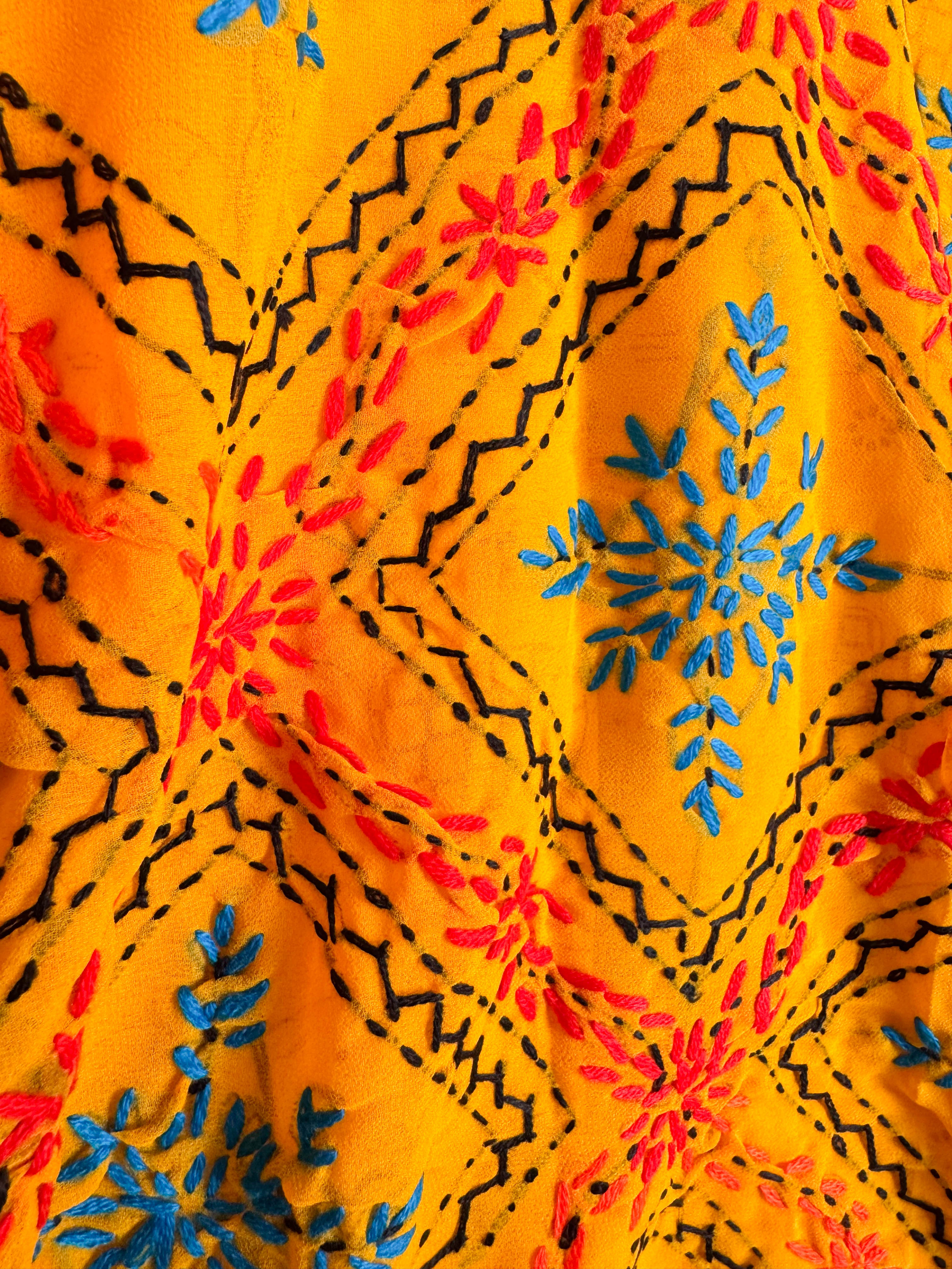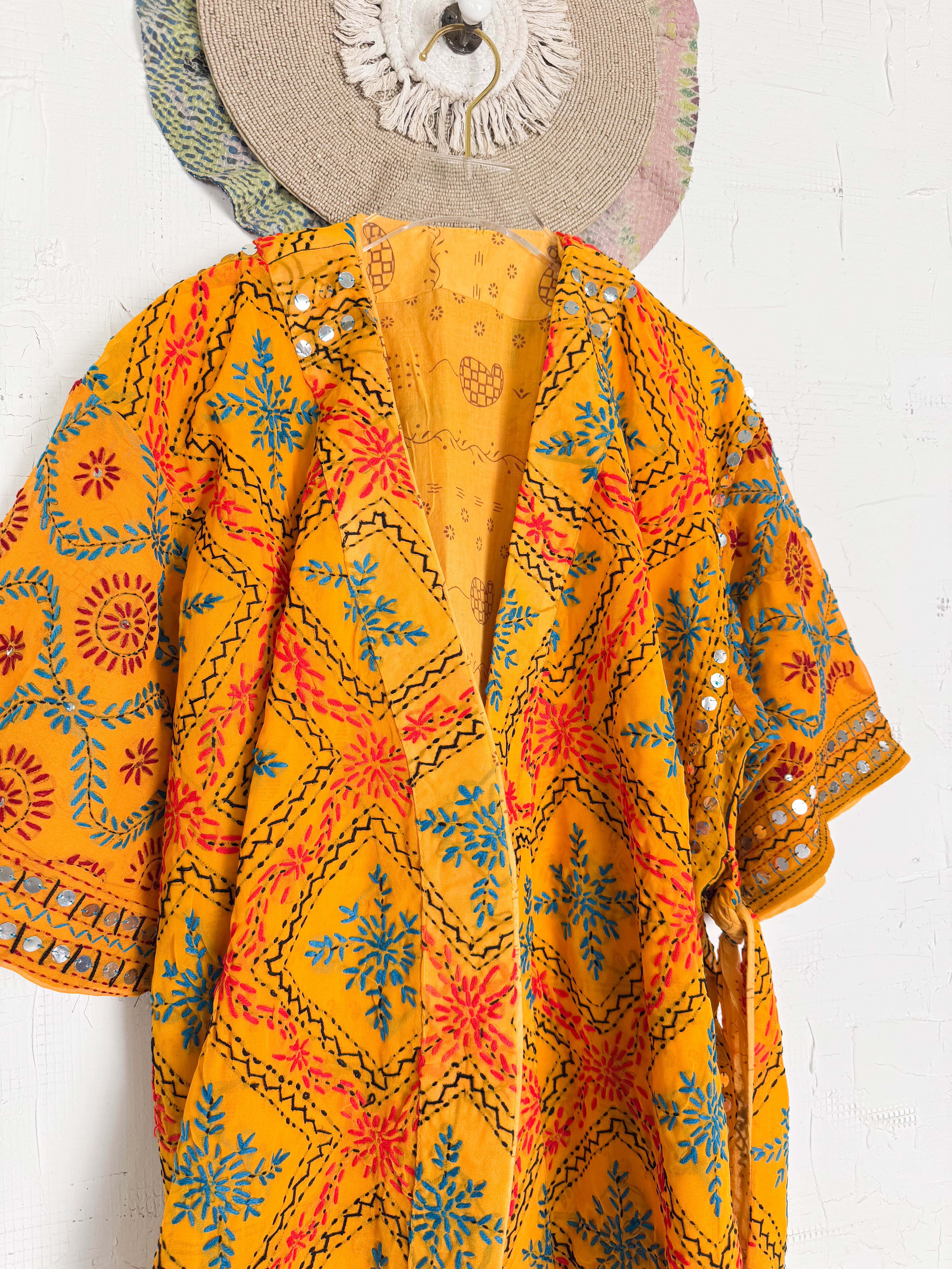 Imagine draping yourself in this exquisite Floral hand-embroidered Short Phulkari Robe, a wearable whisper of nature's artistry. Each delicate motif, lovingly stitched by hand, draws inspiration from the vibrant tapestry of Mother Earth – a tangible connection you can feel with your fingertips. For your playful feminine essence, this thoughtful combination lends the robe a unique flow and captivating texture. Lined with soft, vintage cotton inside. A subtle glimpse of folded sleeves gives it uniqueness. Created to cascade beautifully on all body shapes and sizes, this robe promises an ethereal flow with every movement.