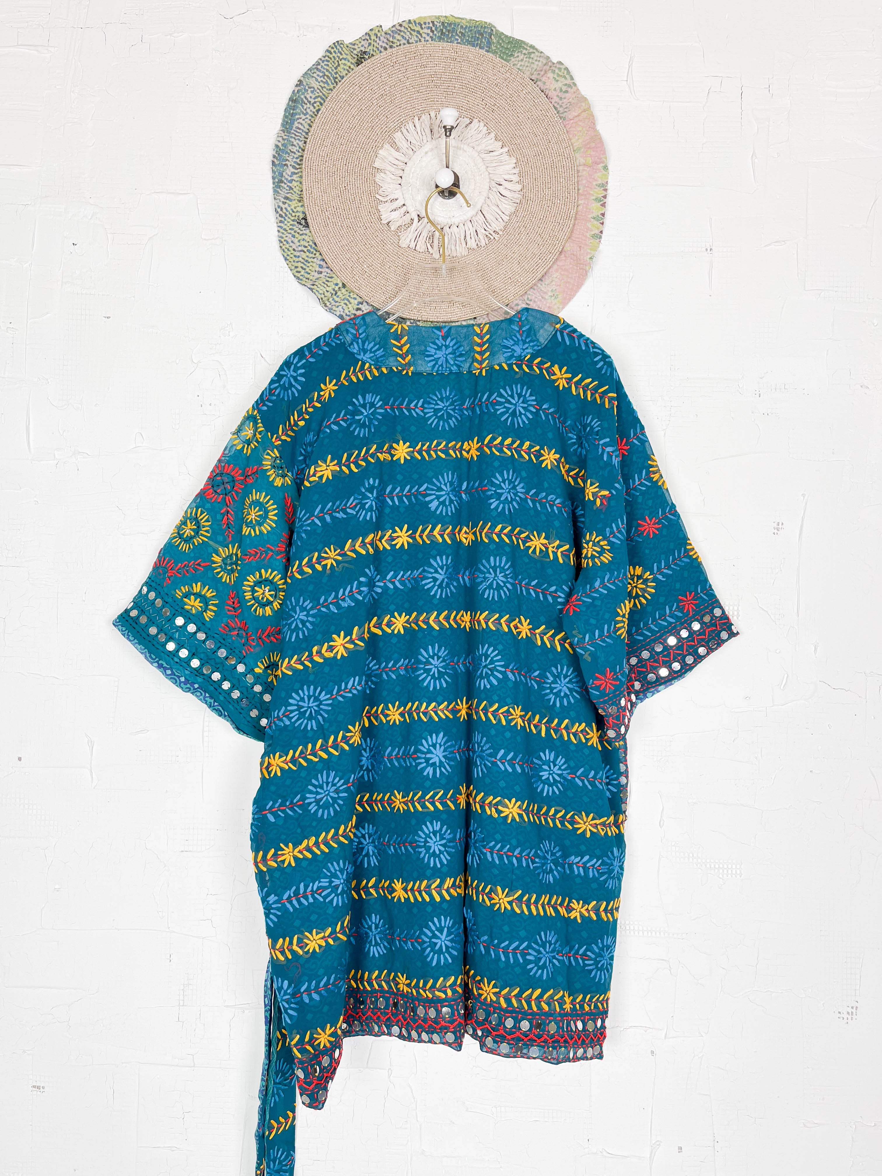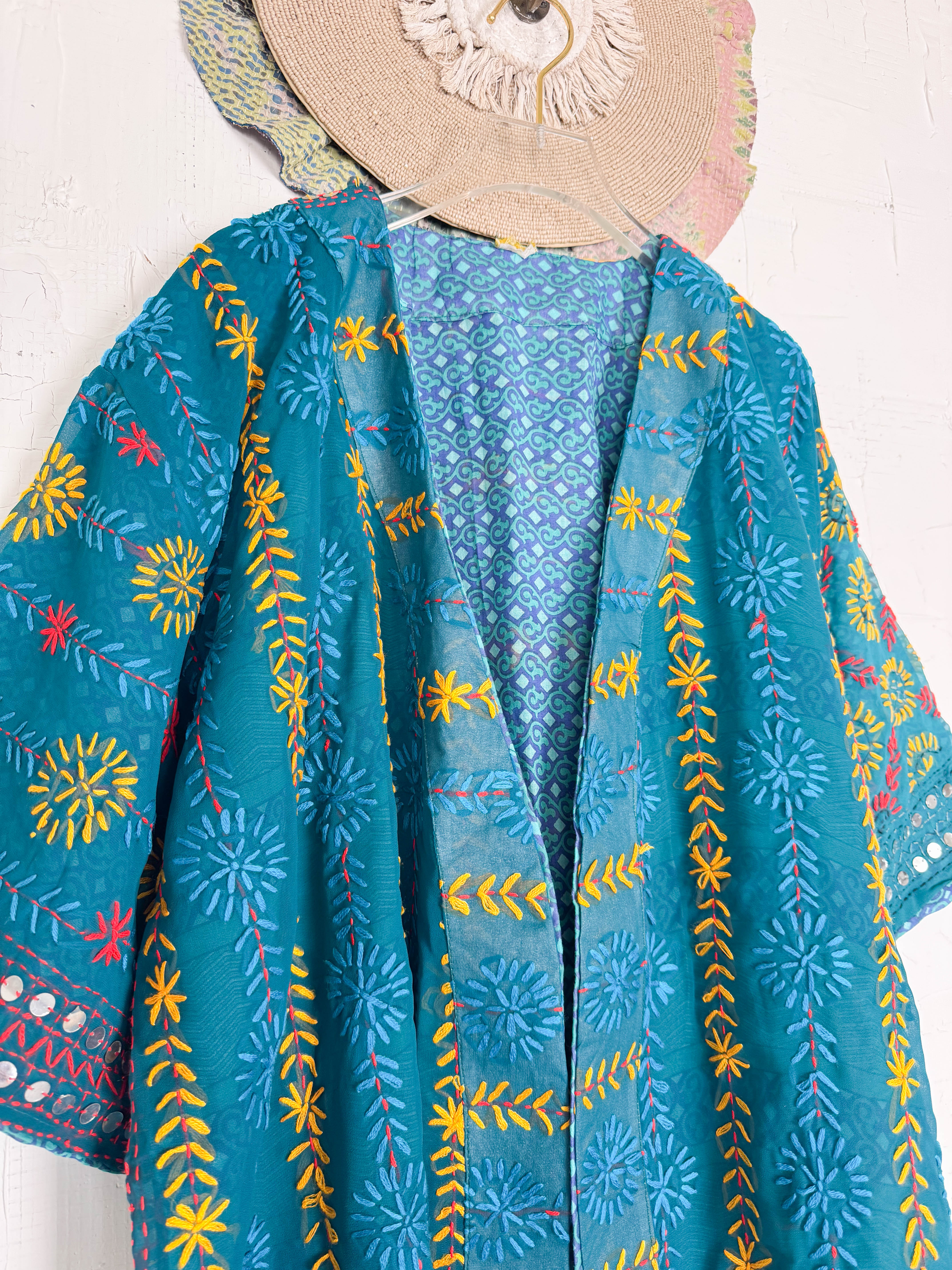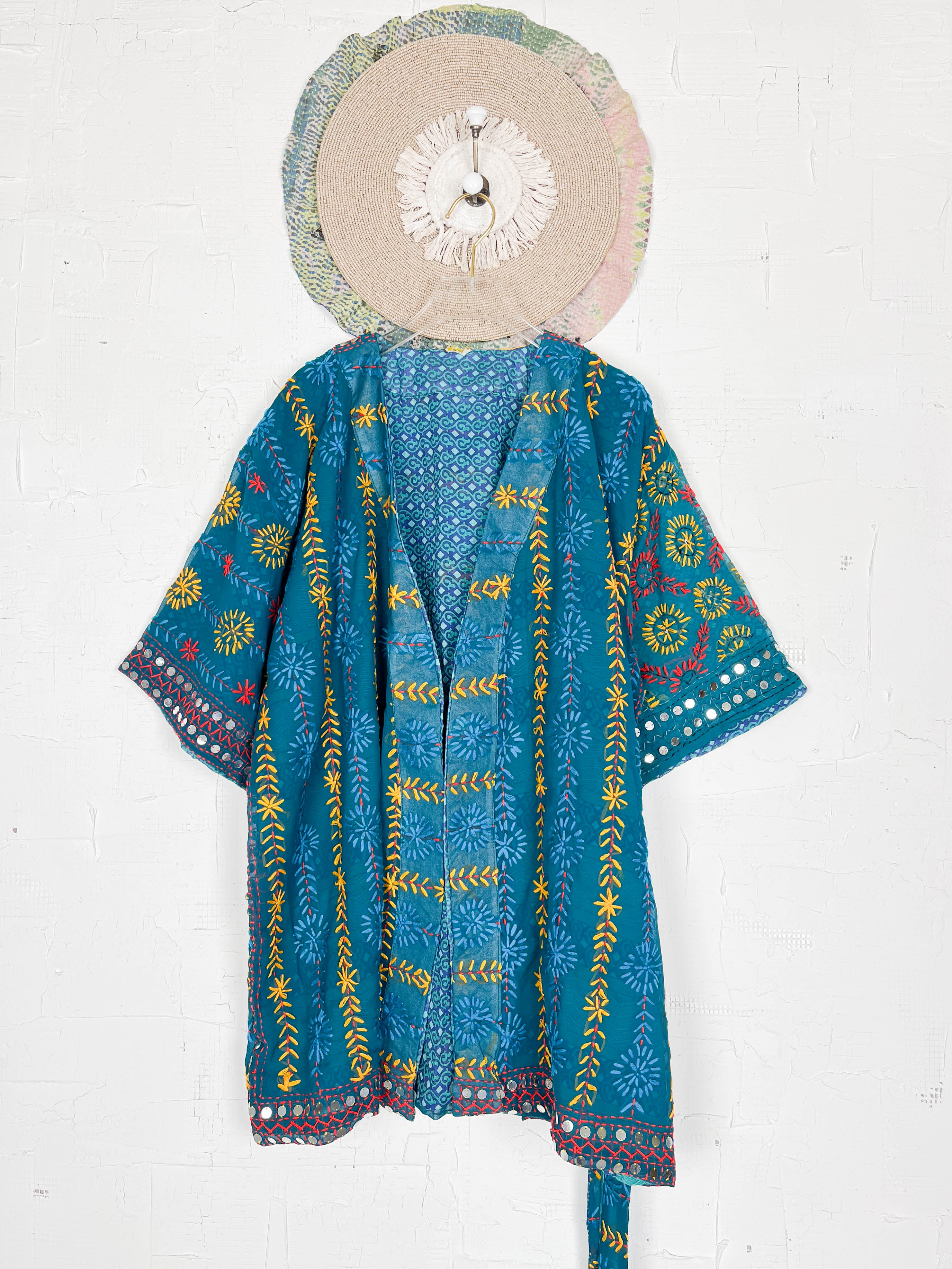 Phulkari Short Kimono Robe Turquoise and Yellow