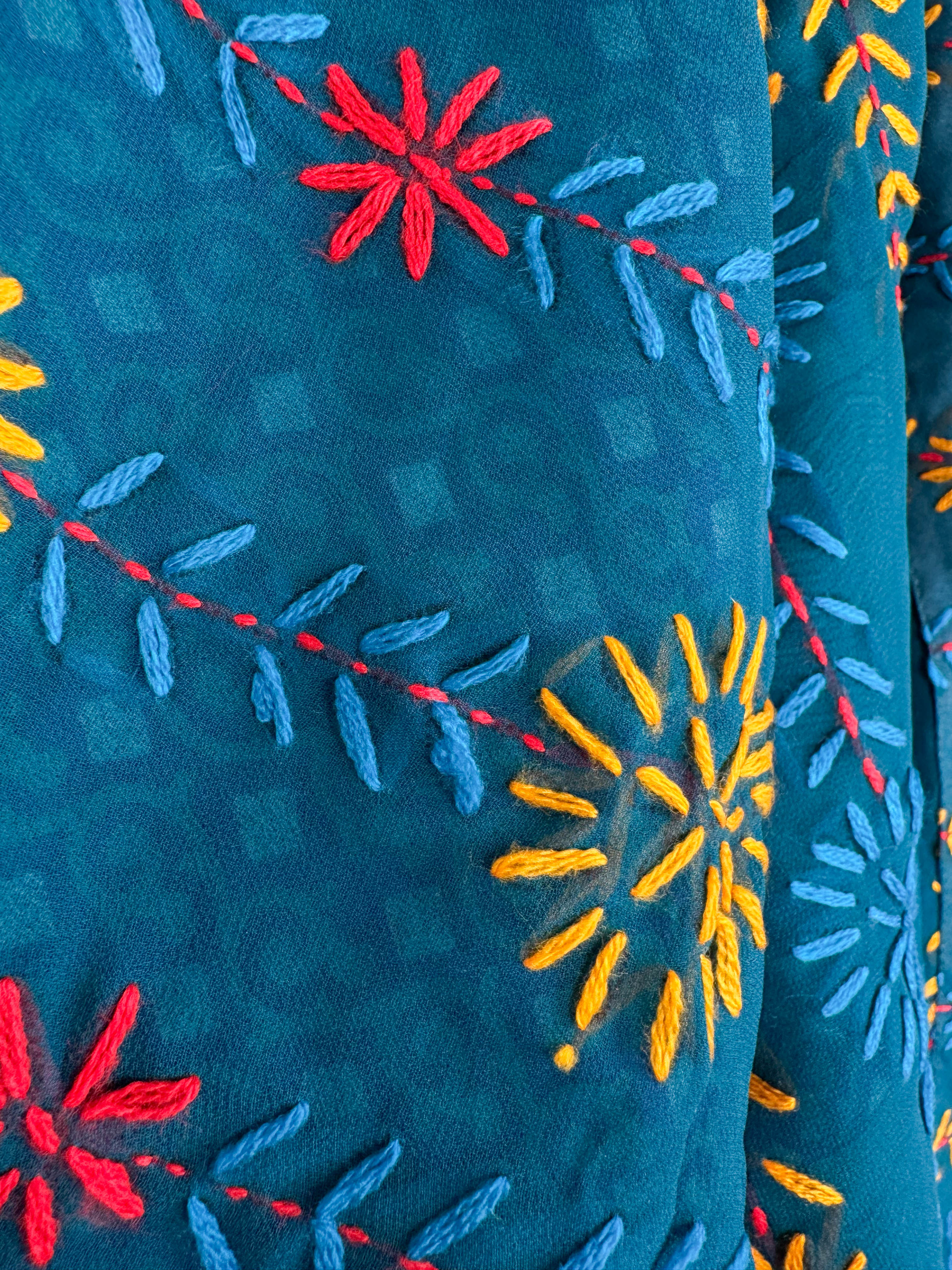Imagine draping yourself in this exquisite Floral hand-embroidered Short Phulkari Robe, a wearable whisper of nature's artistry. Each delicate motif, lovingly stitched by hand, draws inspiration from the vibrant tapestry of Mother Earth – a tangible connection you can feel with your fingertips. For your playful feminine essence, this thoughtful combination lends the robe a unique flow and captivating texture. Lined with soft, vintage cotton inside. A subtle glimpse of folded sleeves gives it uniqueness. Created to cascade beautifully on all body shapes and sizes, this robe promises an ethereal flow with every movement.