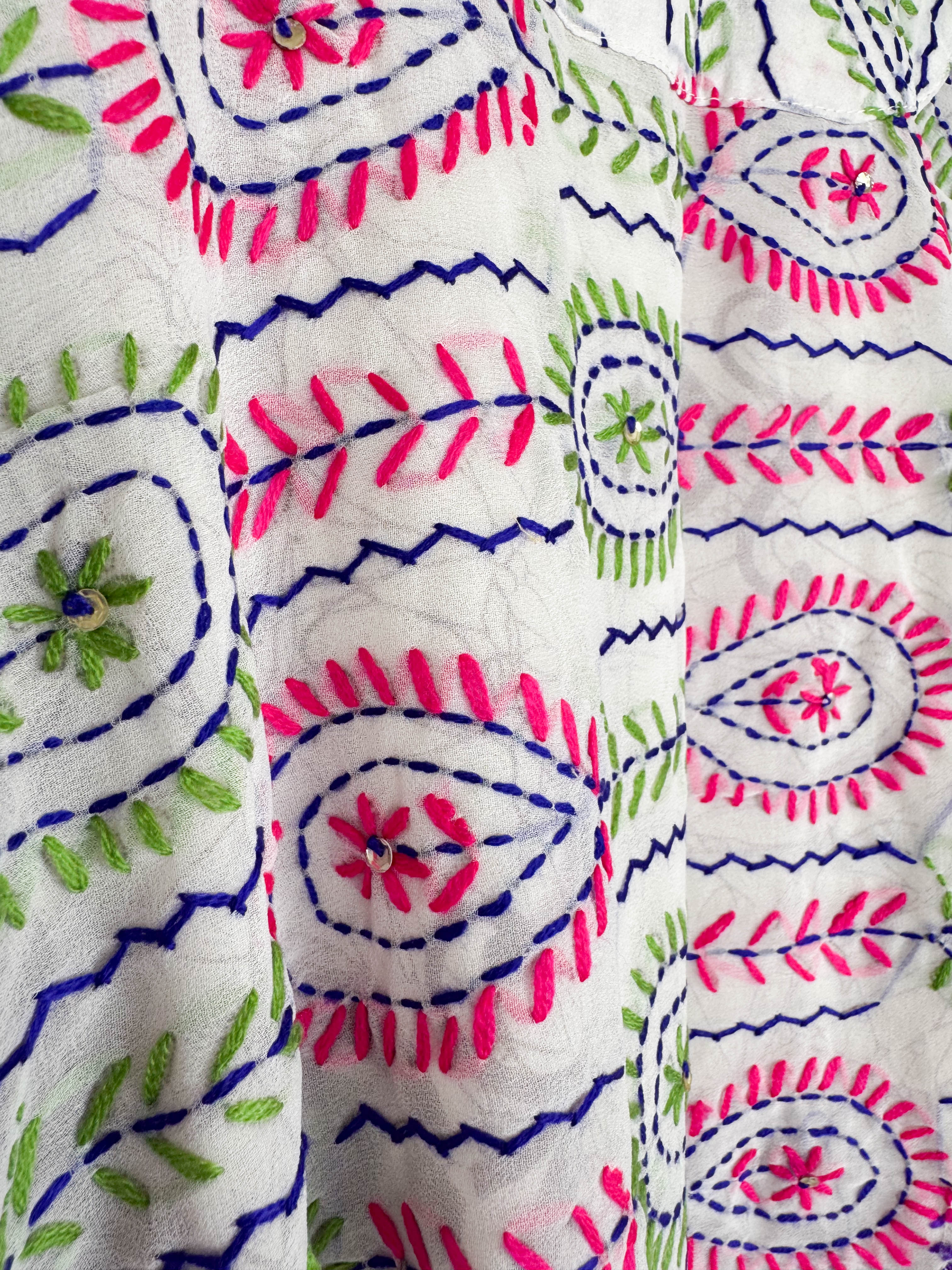 Imagine draping yourself in this exquisite Floral hand-embroidered Short Phulkari Robe, a wearable whisper of nature's artistry. Each delicate motif, lovingly stitched by hand, draws inspiration from the vibrant tapestry of Mother Earth – a tangible connection you can feel with your fingertips. For your playful feminine essence, this thoughtful combination lends the robe a unique flow and captivating texture. Lined with soft, vintage cotton inside. A subtle glimpse of folded sleeves gives it uniqueness. Created to cascade beautifully on all body shapes and sizes, this robe promises an ethereal flow with every movement.