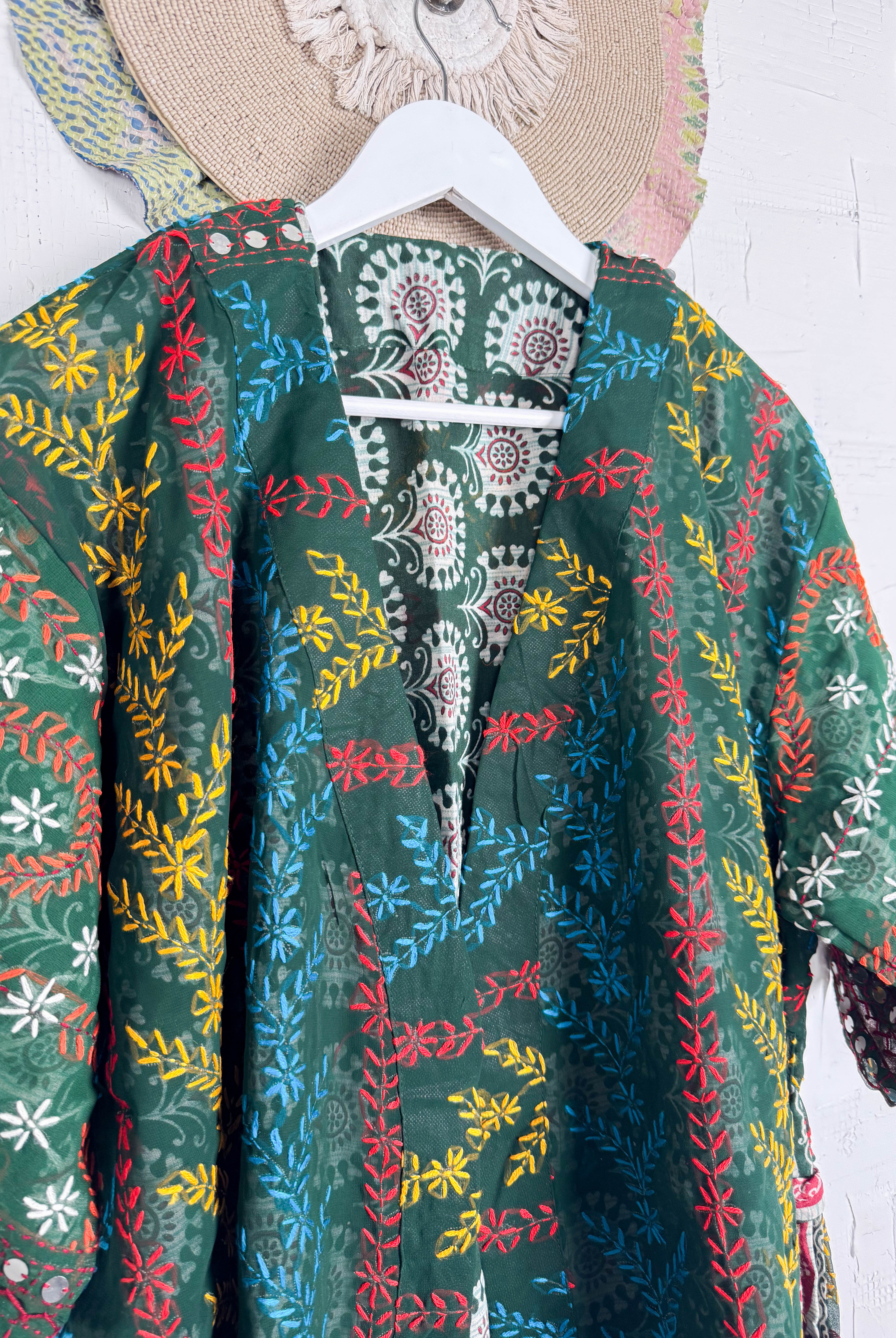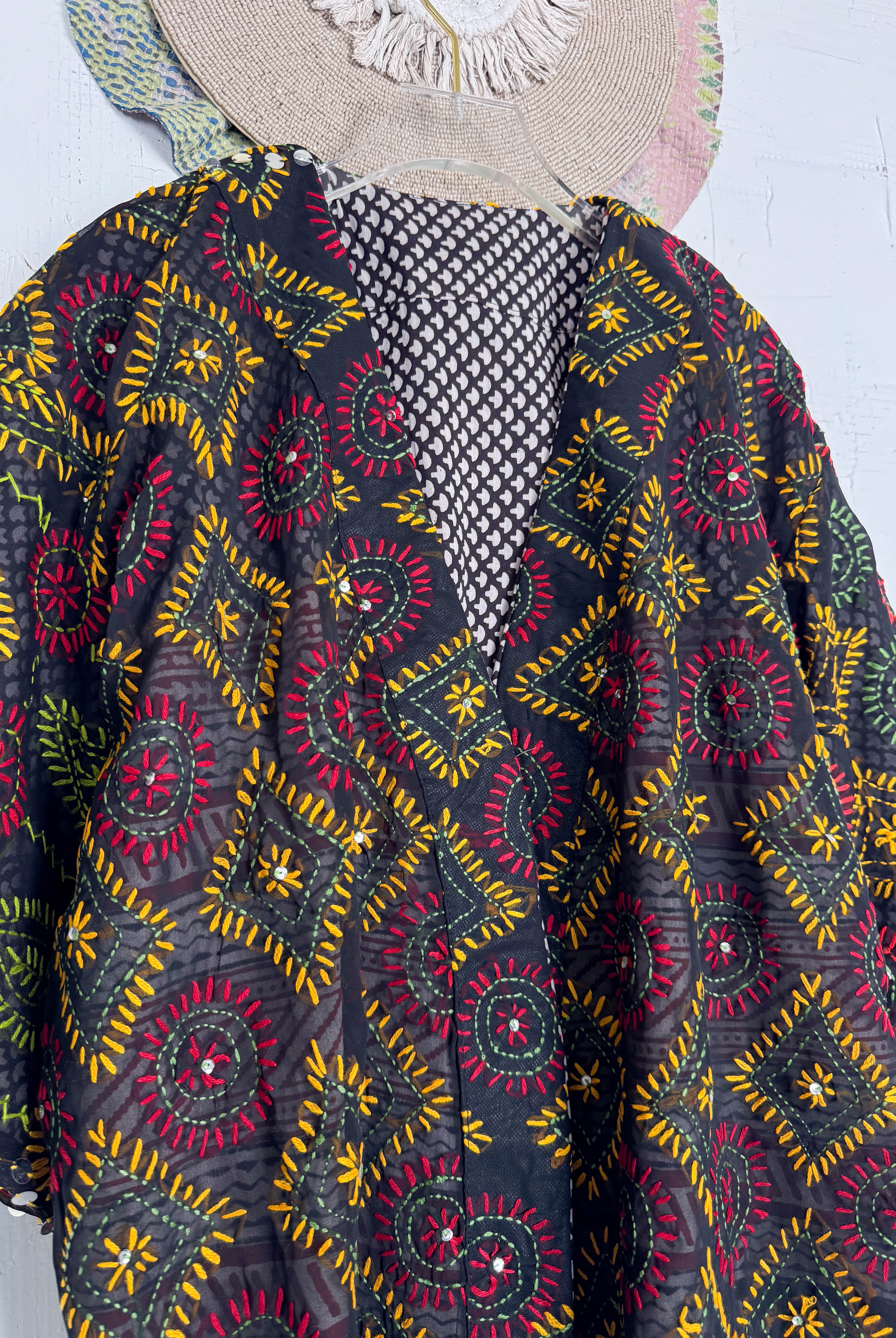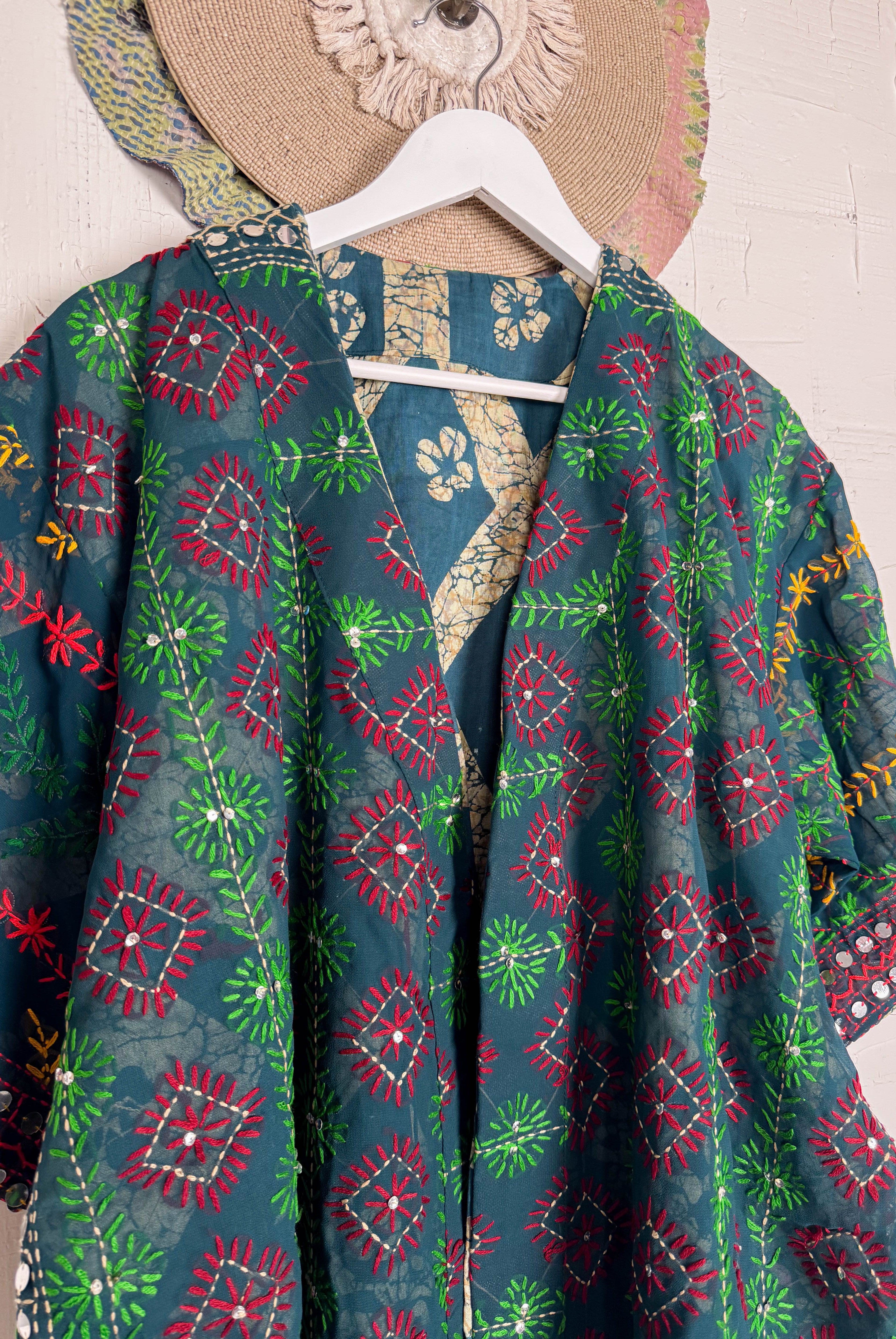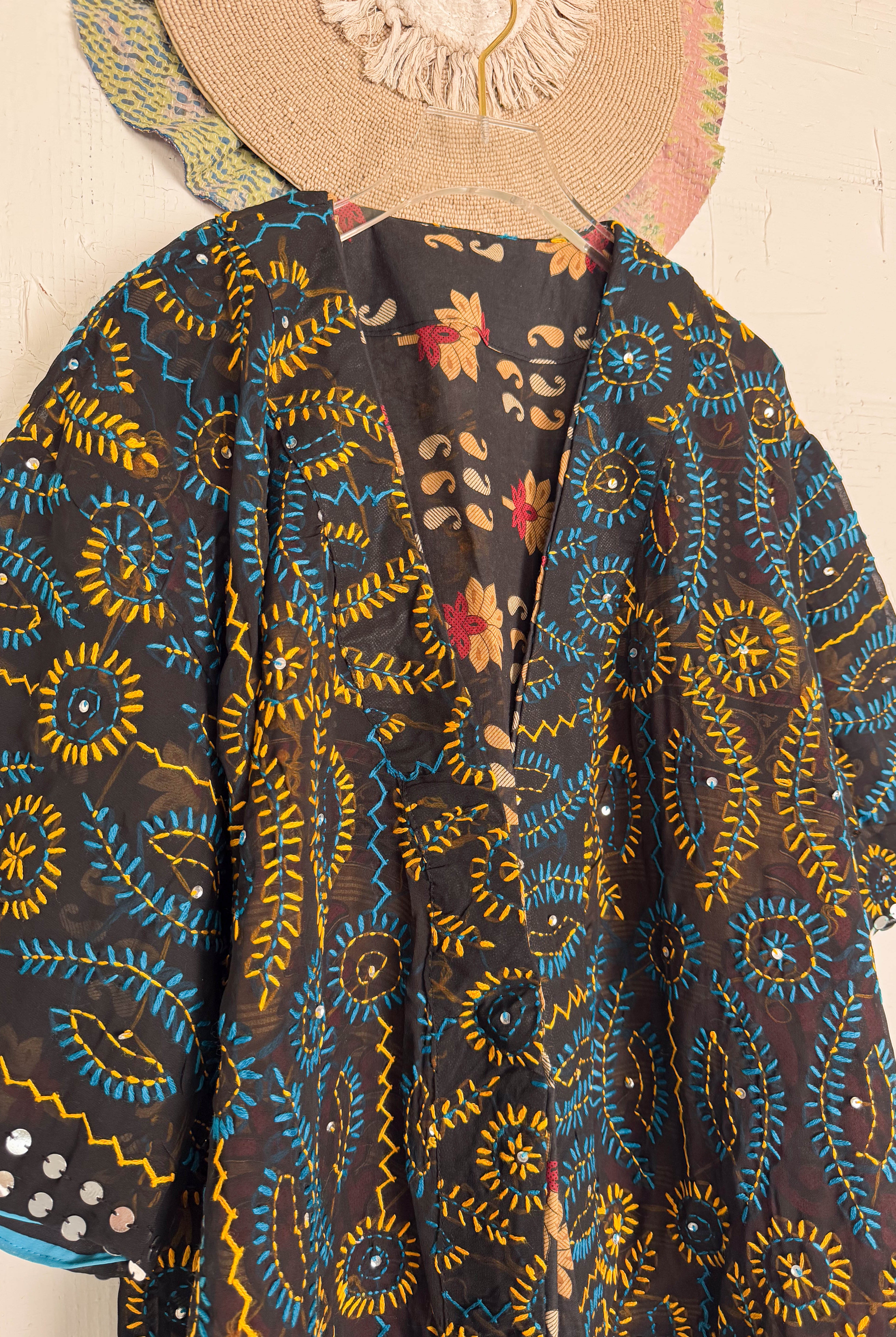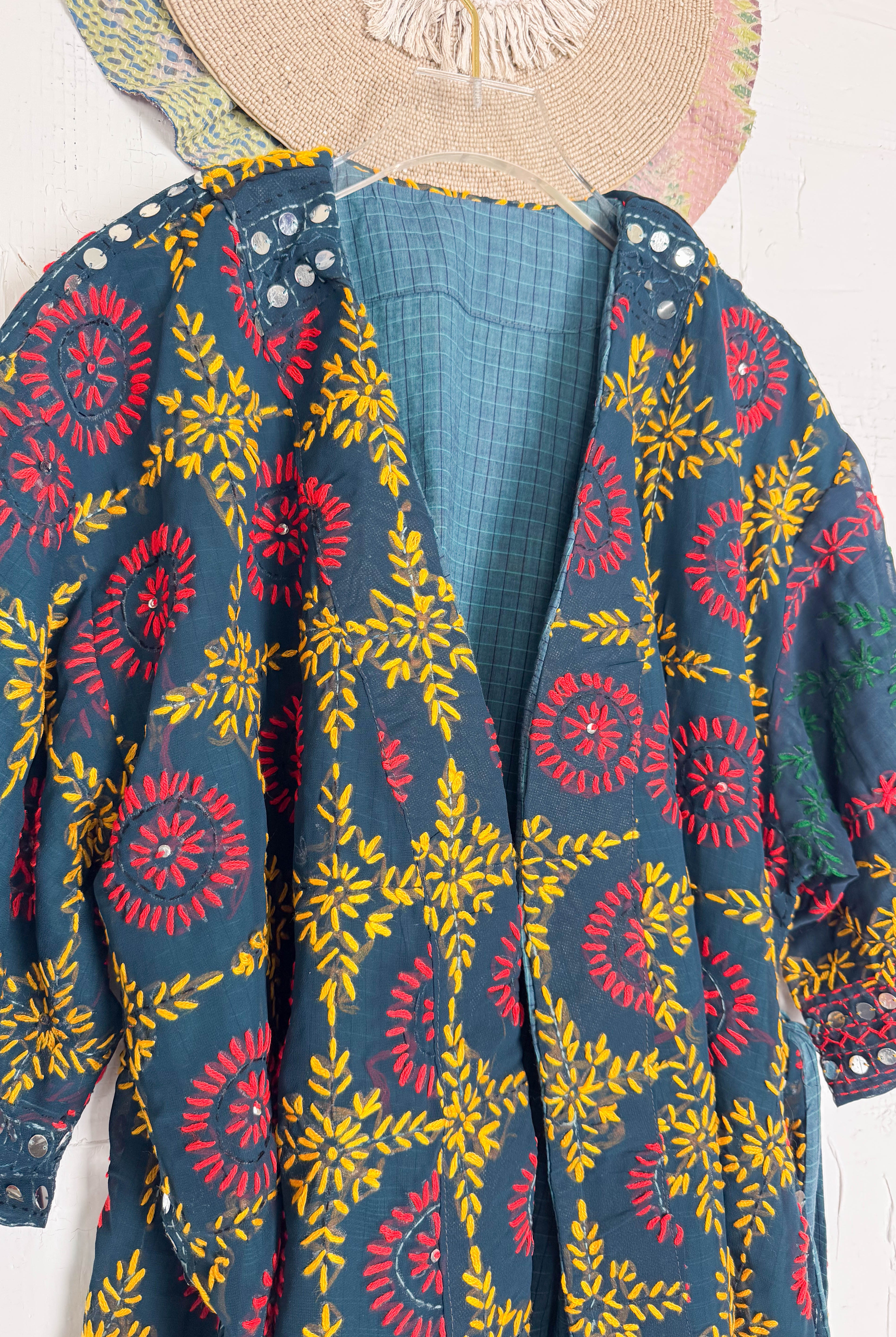 This handcrafted short Phulkari robe is a unique piece of wearable art, designed for daily elegance. Each hand-stitched floral motif, inspired by nature, creates a captivating texture and flow that flatters all body shapes and sizes. Lined with soft, vintage cotton, it offers a harmonious blend of traditional artistry and natural elements.