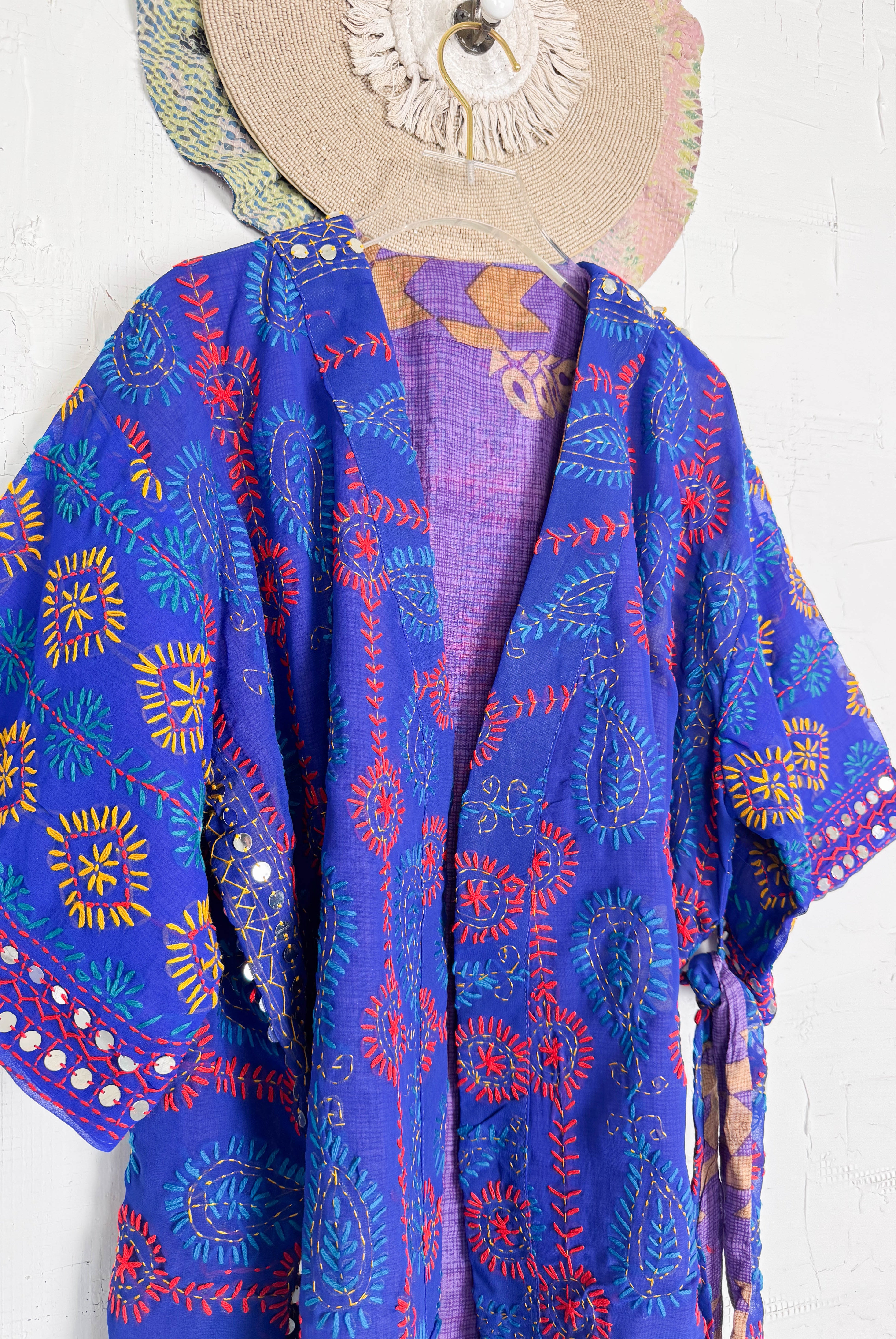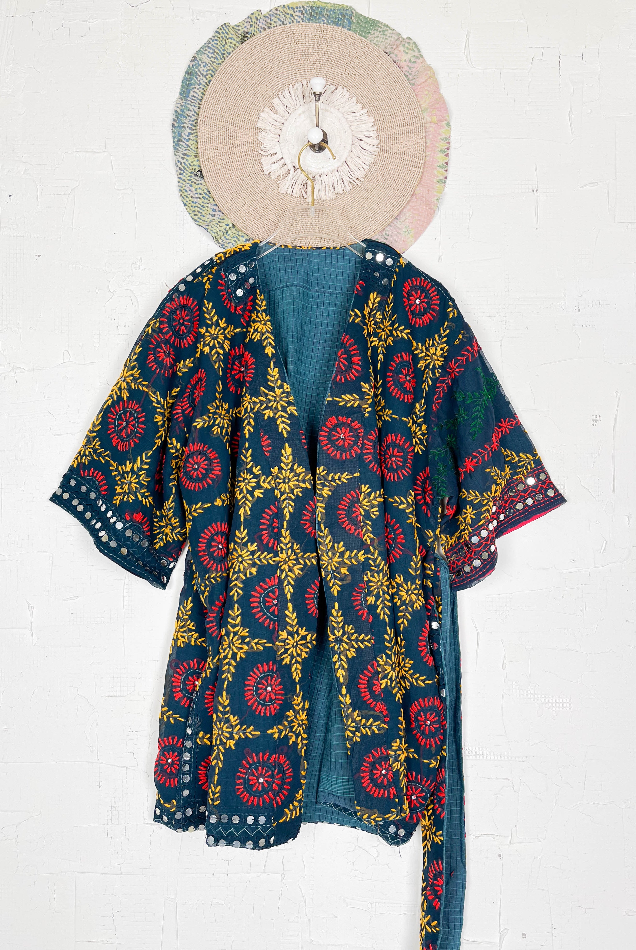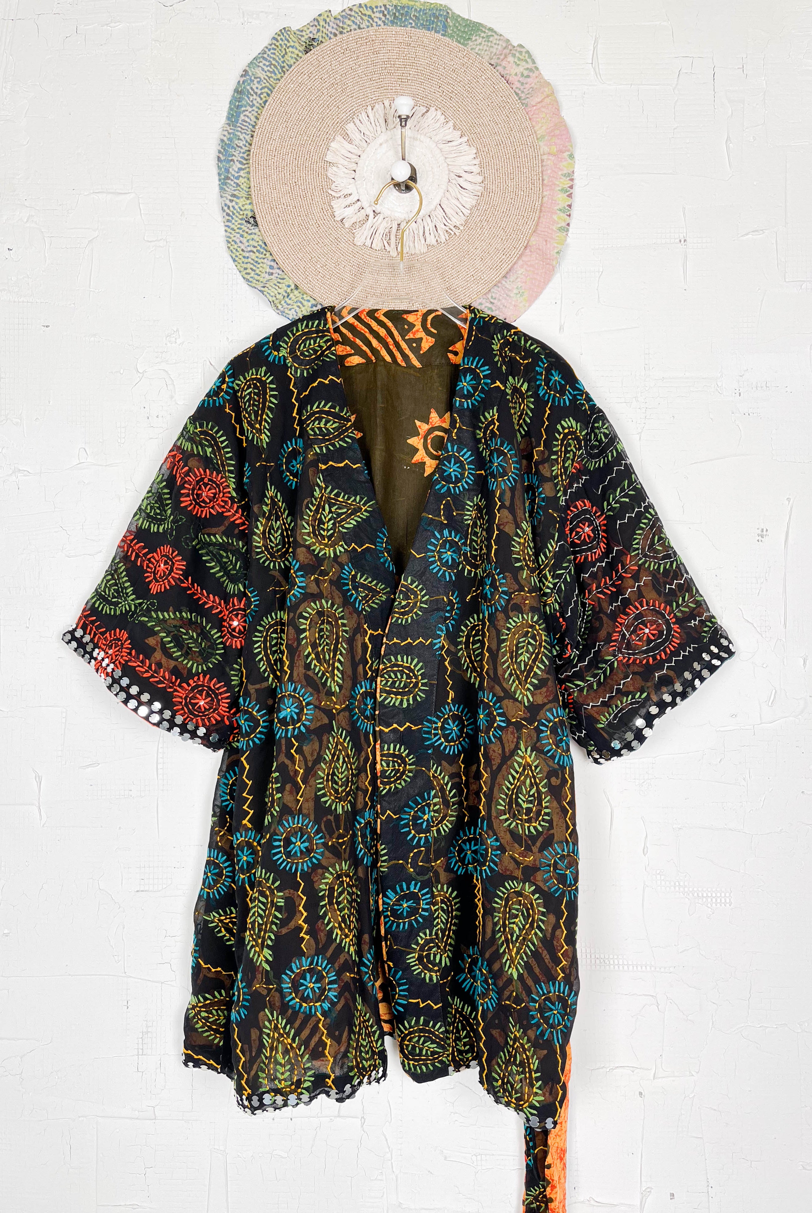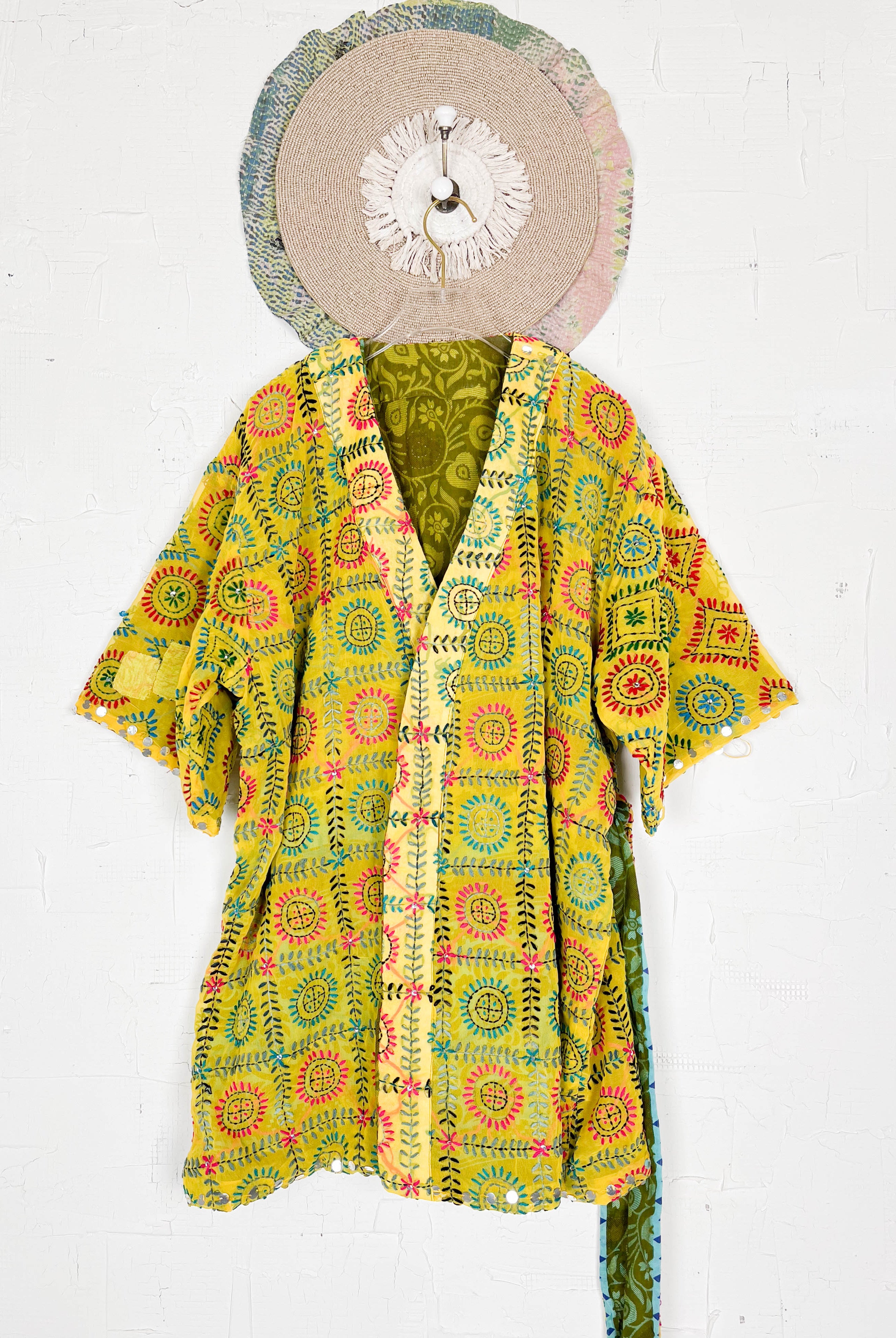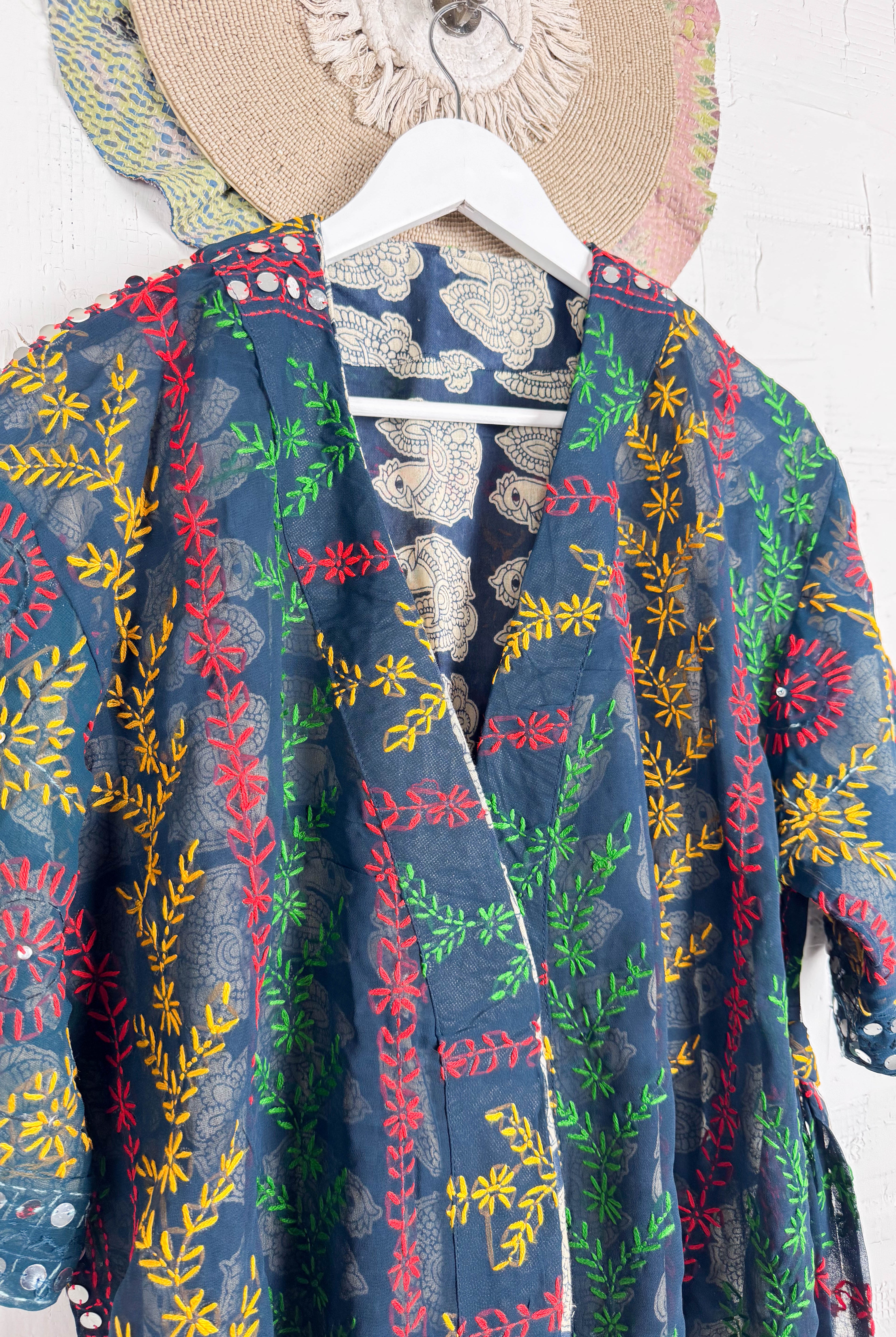 This handcrafted short Phulkari robe is a unique piece of wearable art, designed for daily elegance. Each hand-stitched floral motif, inspired by nature, creates a captivating texture and flow that flatters all body shapes and sizes. Lined with soft, vintage cotton, it offers a harmonious blend of traditional artistry and natural elements.