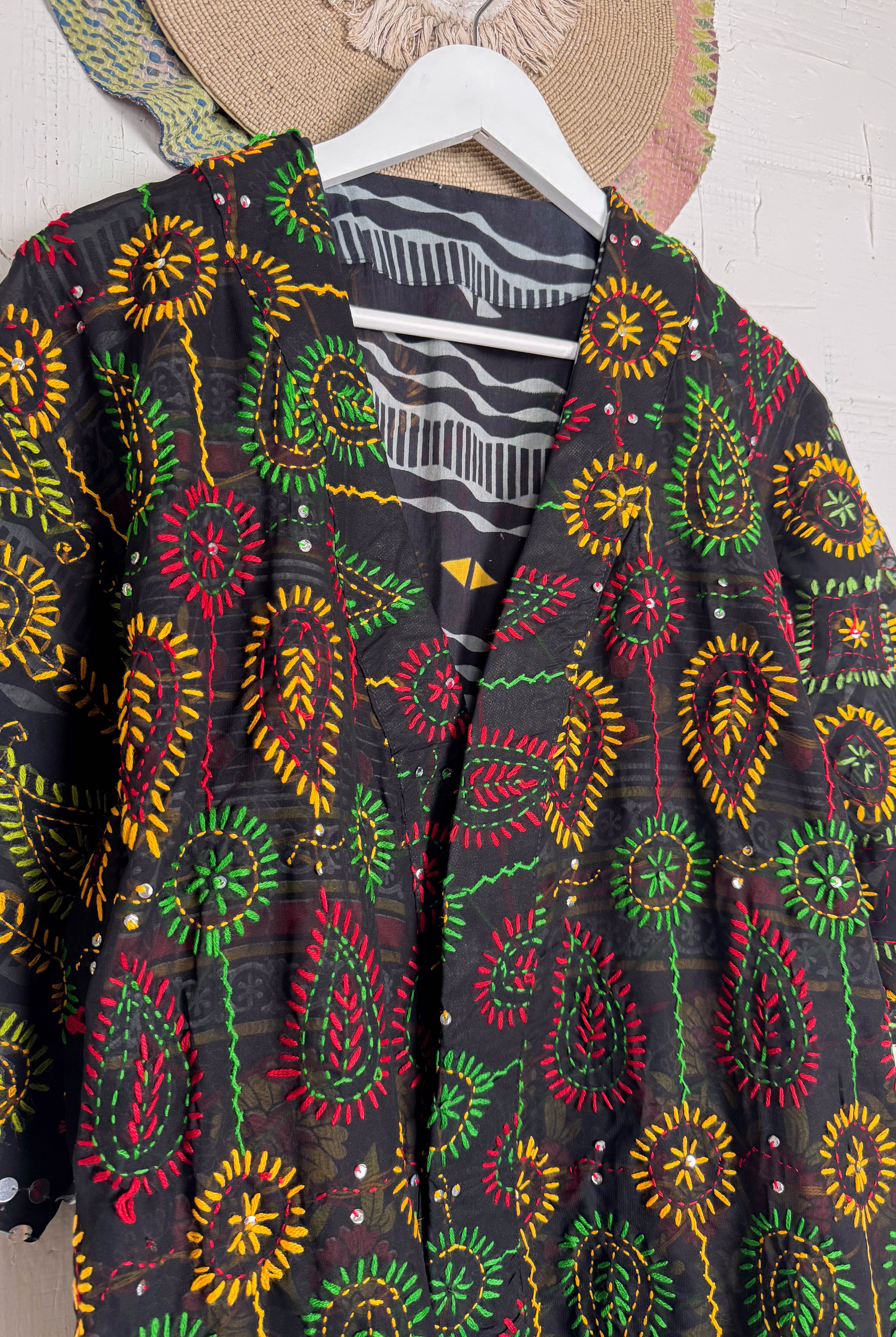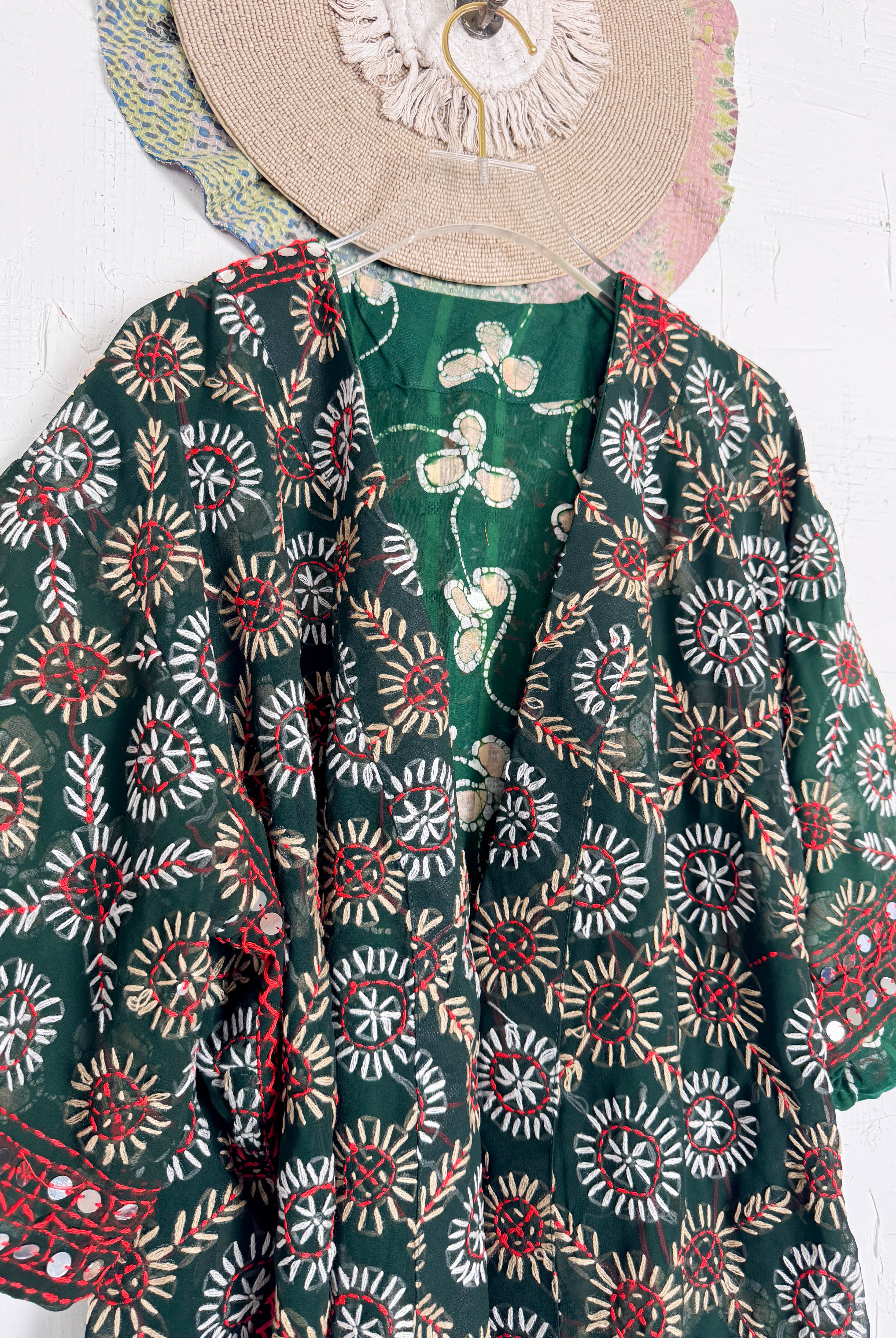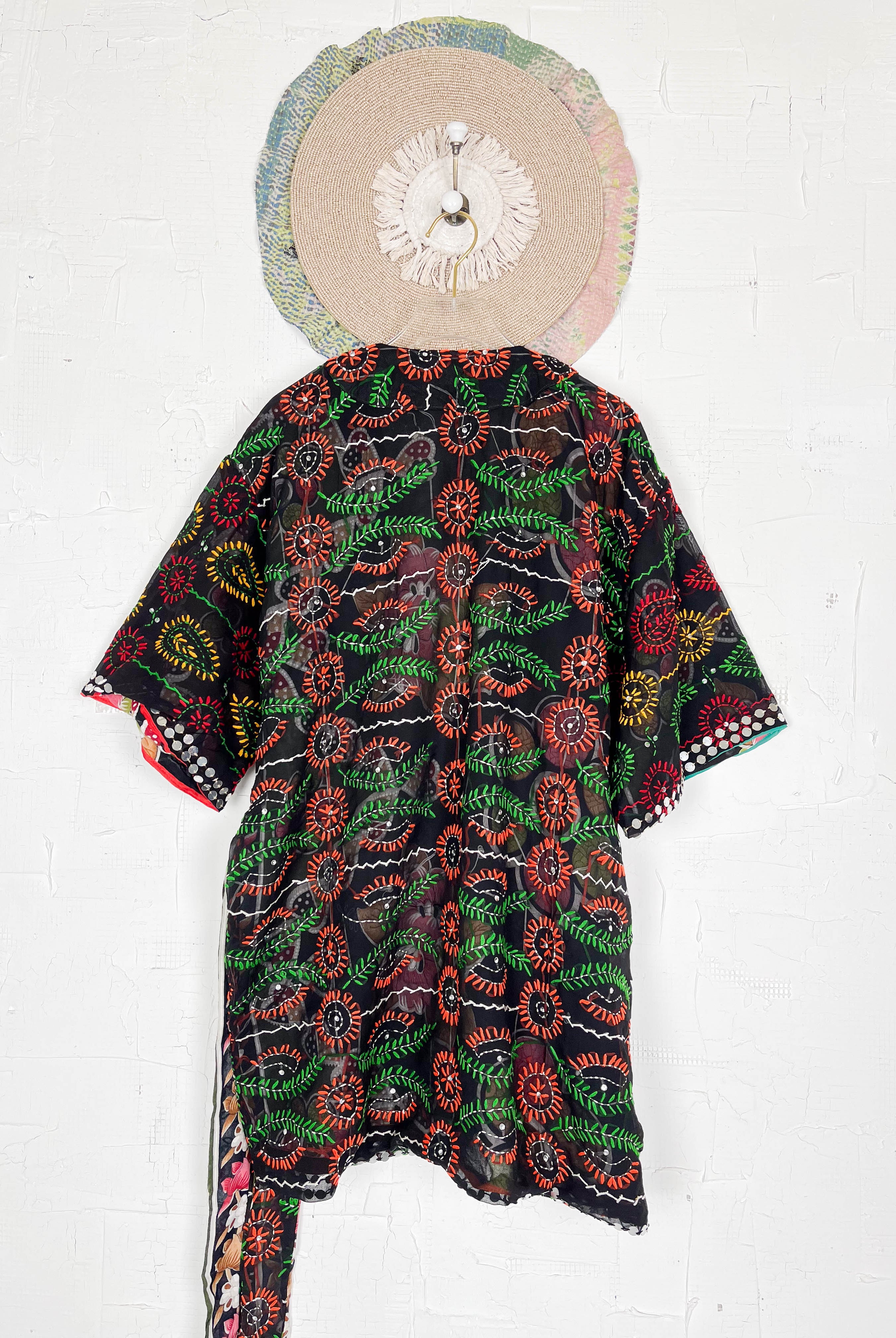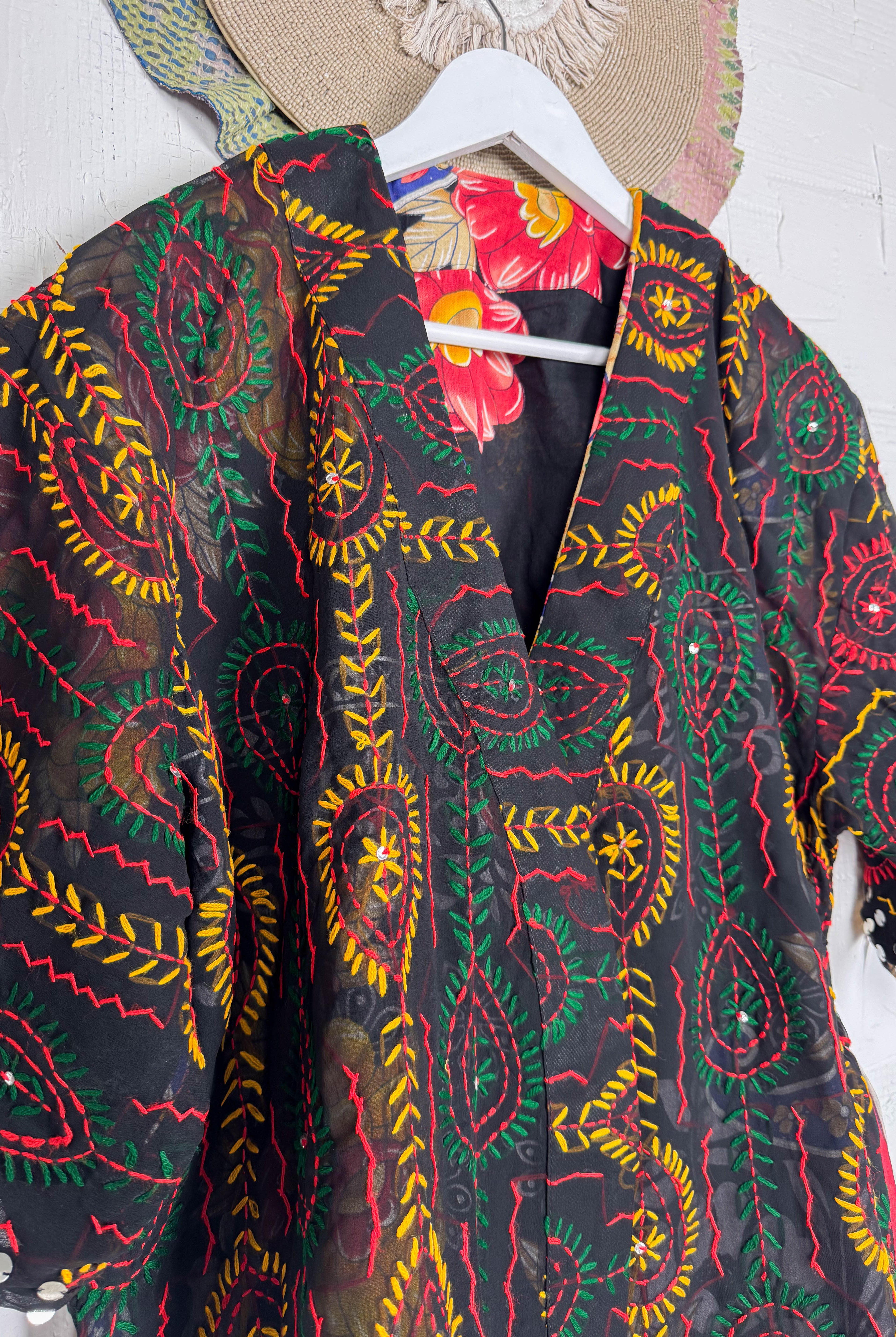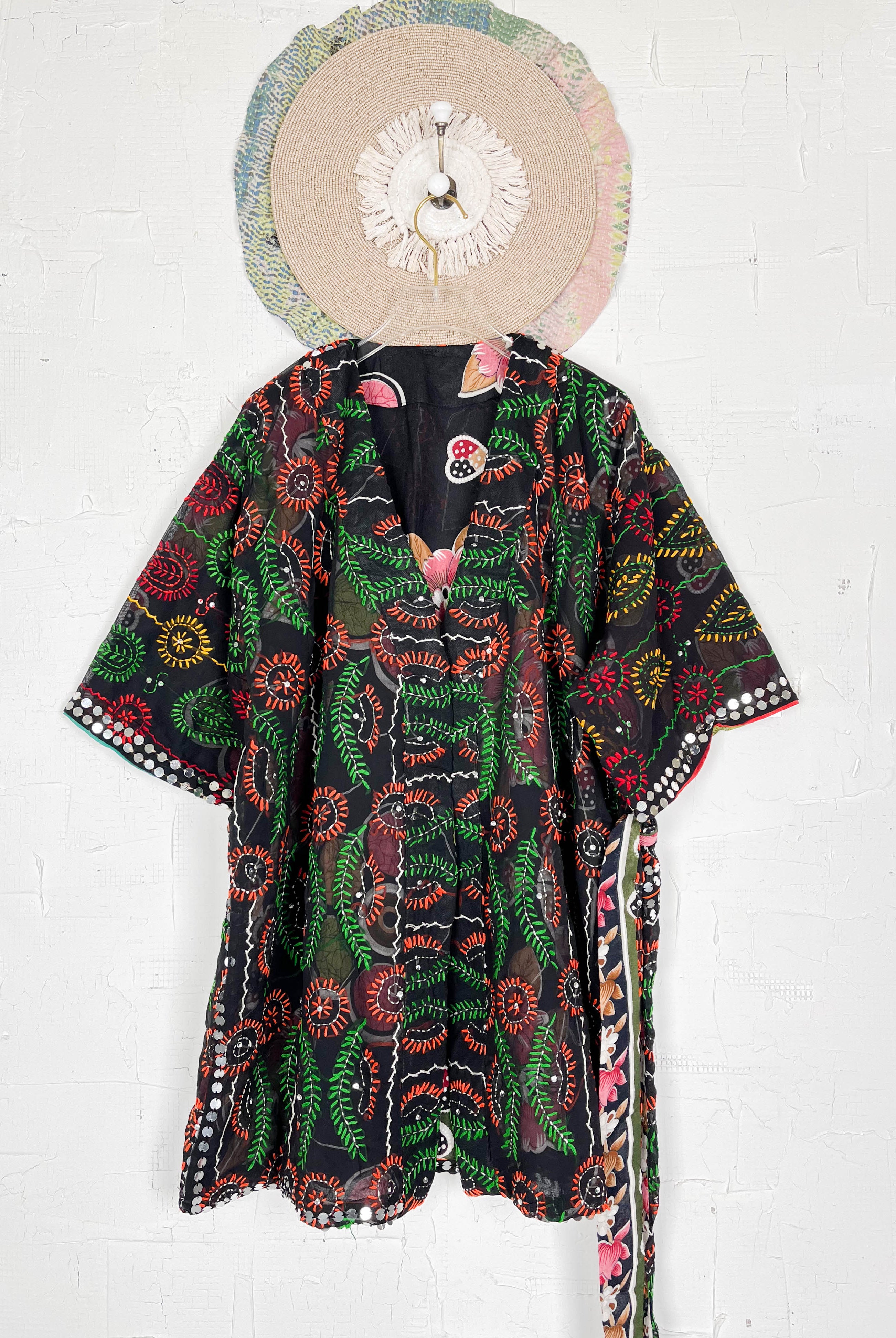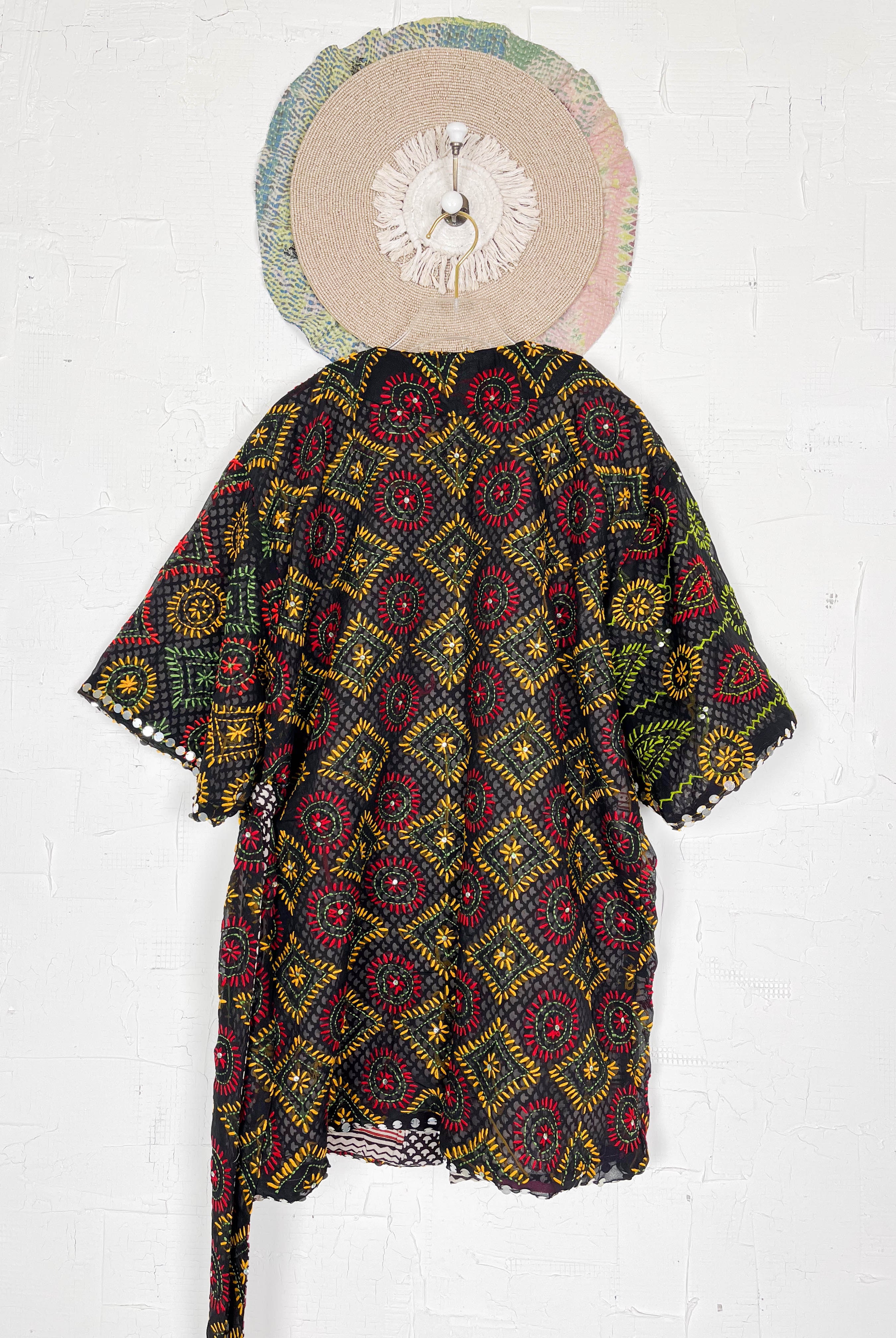 This handcrafted short Phulkari robe is a unique piece of wearable art, designed for daily elegance. Each hand-stitched floral motif, inspired by nature, creates a captivating texture and flow that flatters all body shapes and sizes. Lined with soft, vintage cotton, it offers a harmonious blend of traditional artistry and natural elements.