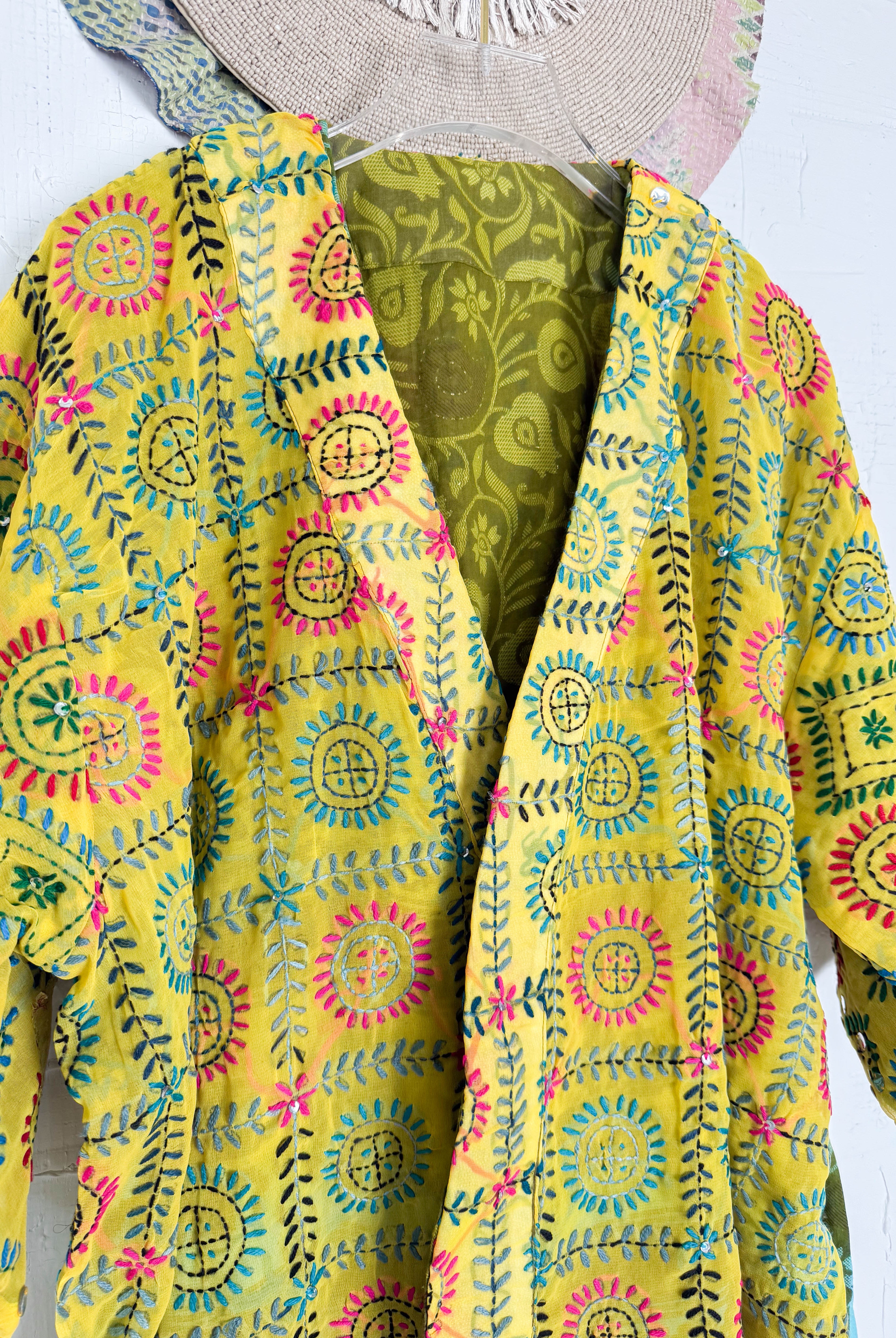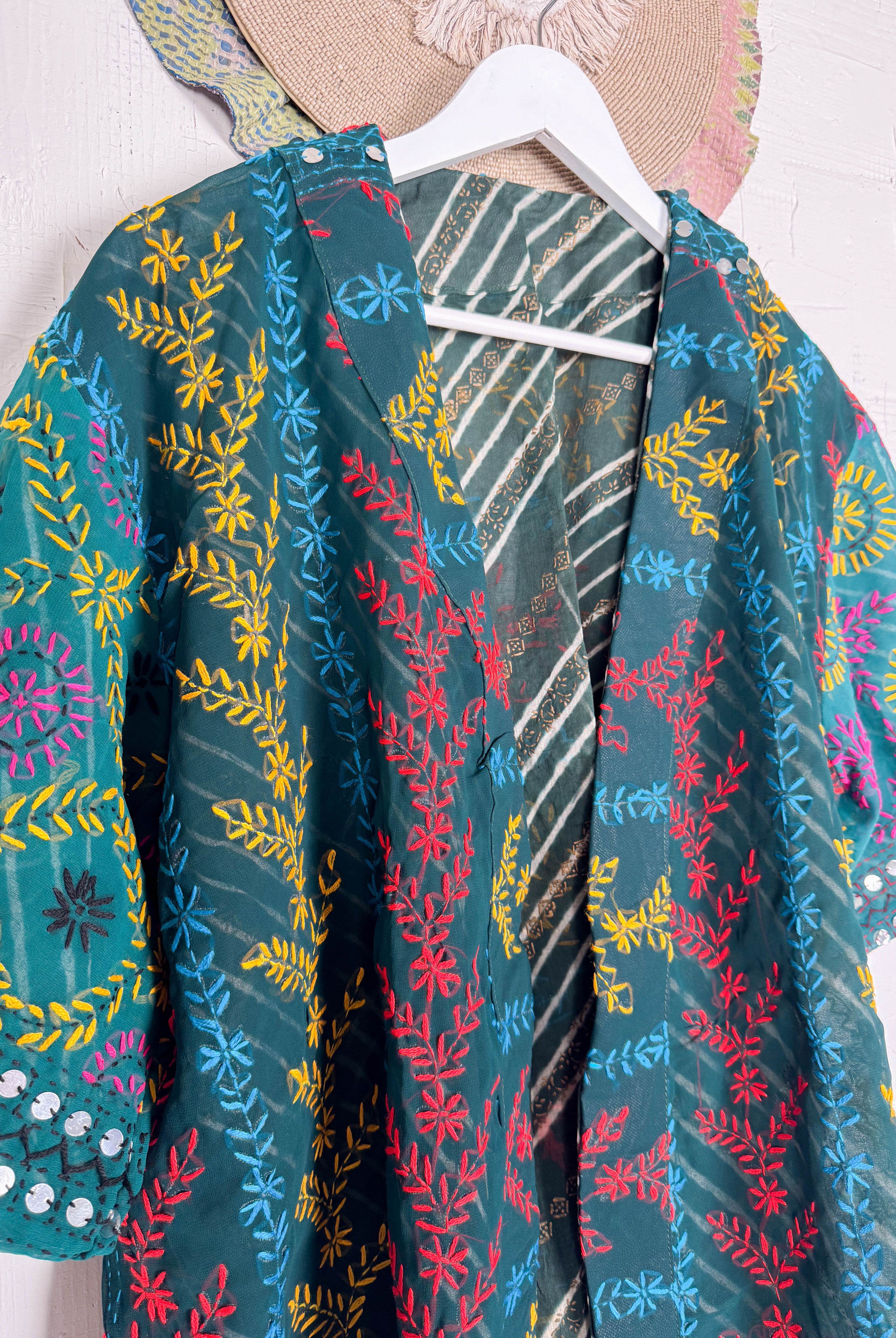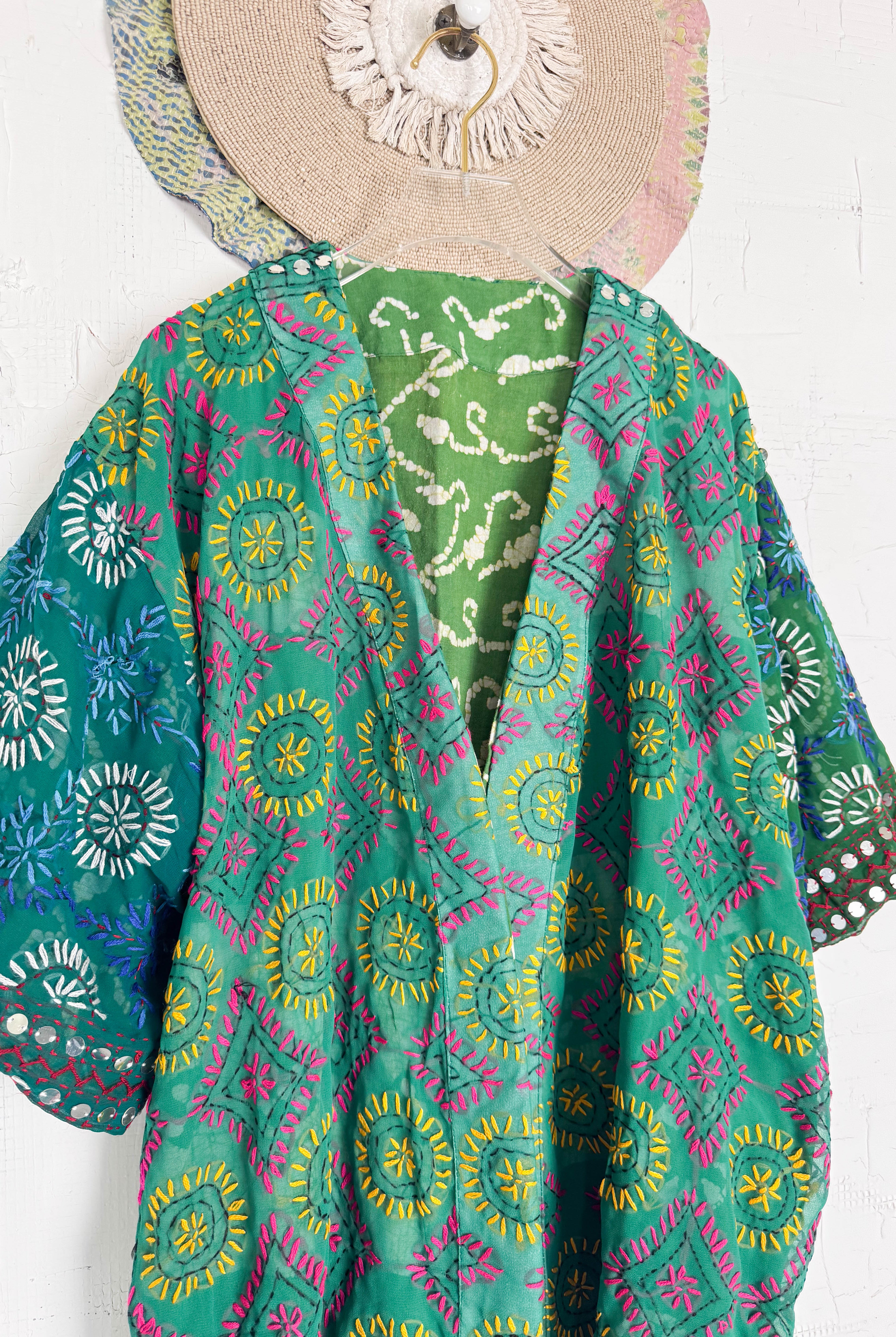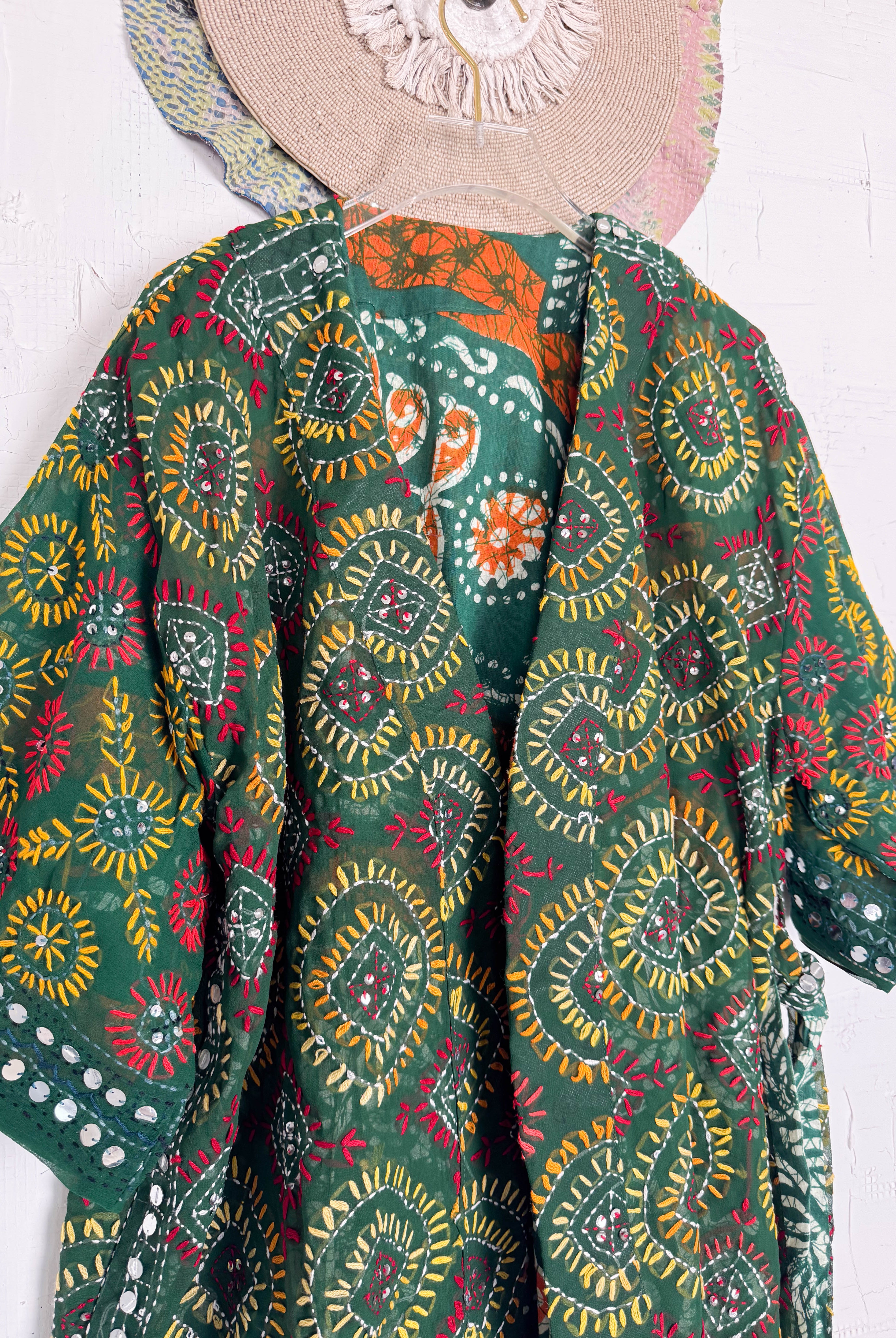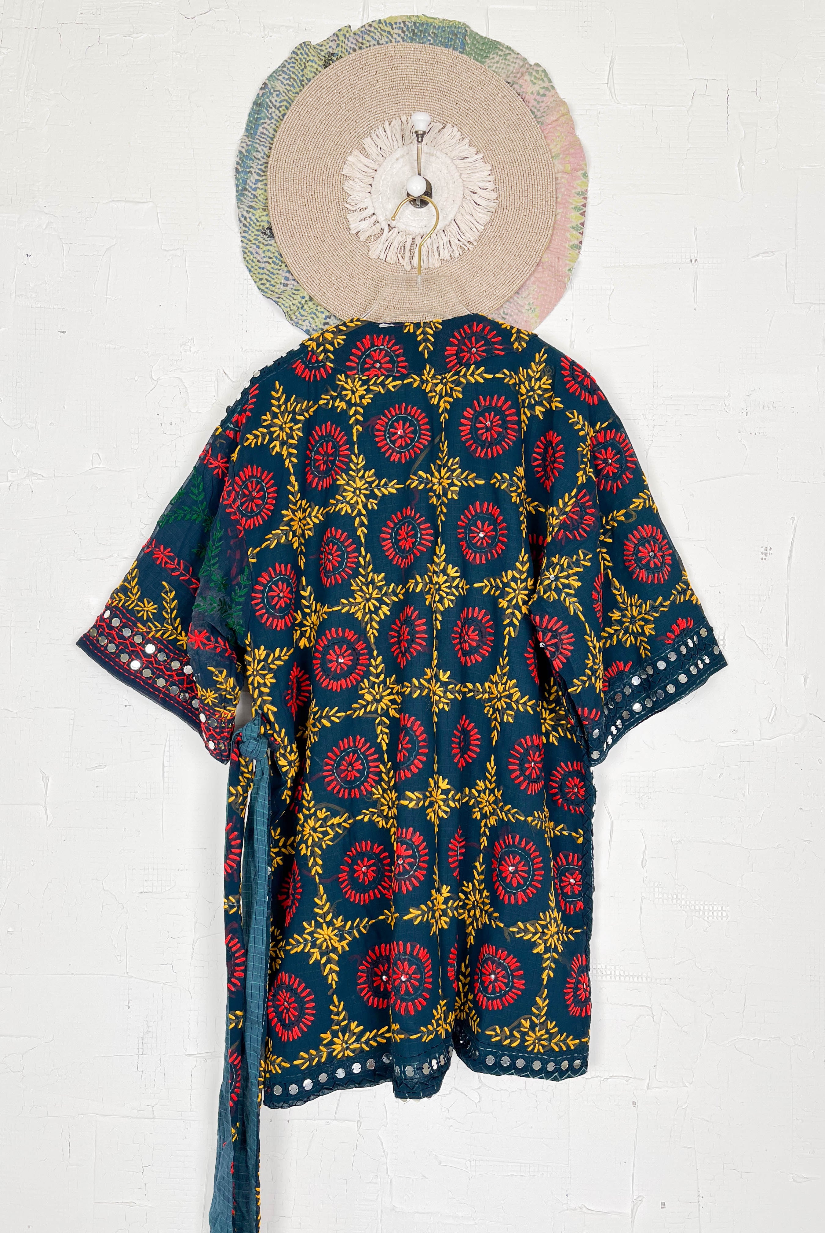This handcrafted short Phulkari robe is a unique piece of wearable art, designed for daily elegance. Each hand-stitched floral motif, inspired by nature, creates a captivating texture and flow that flatters all body shapes and sizes. Lined with soft, vintage cotton, it offers a harmonious blend of traditional artistry and natural elements.