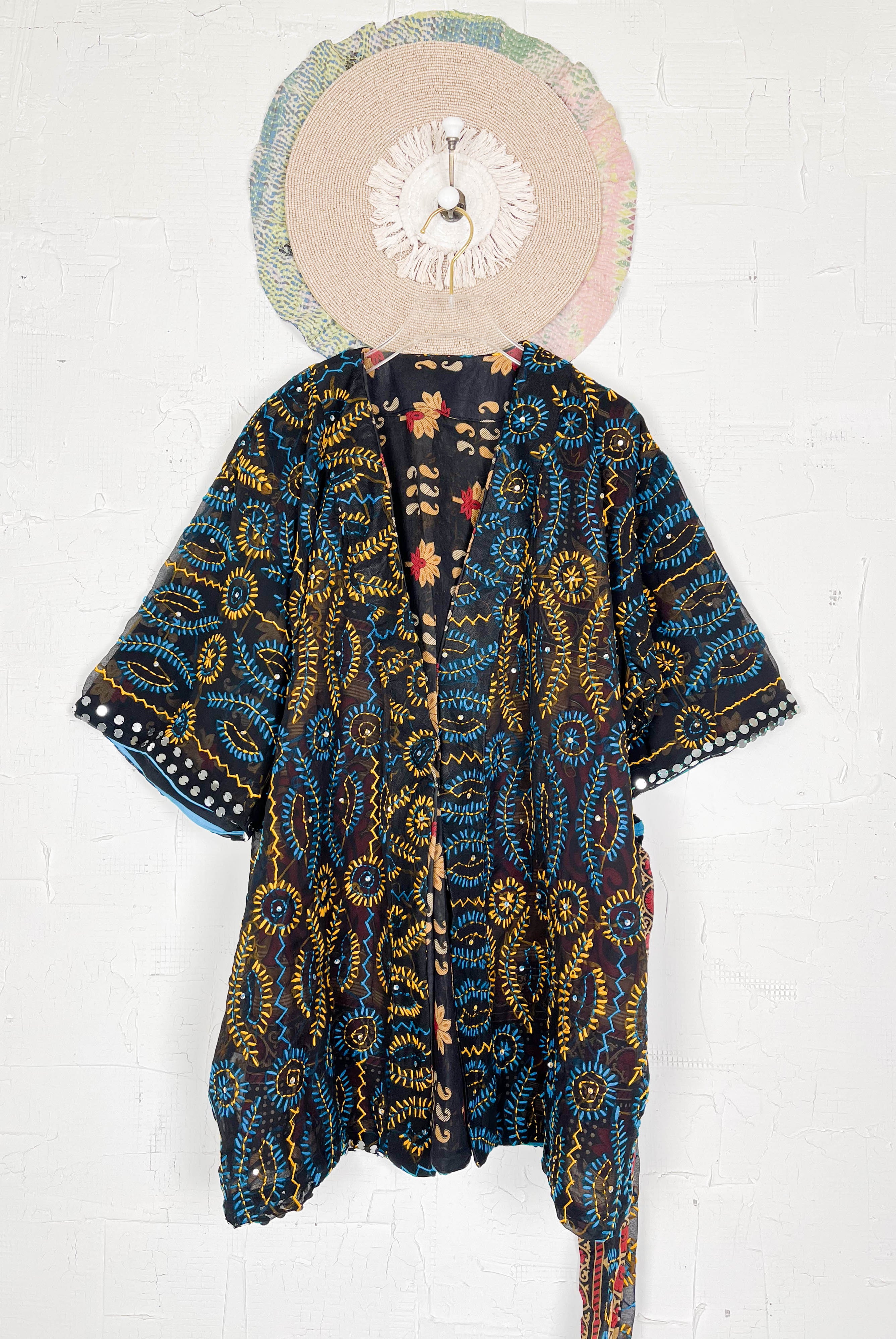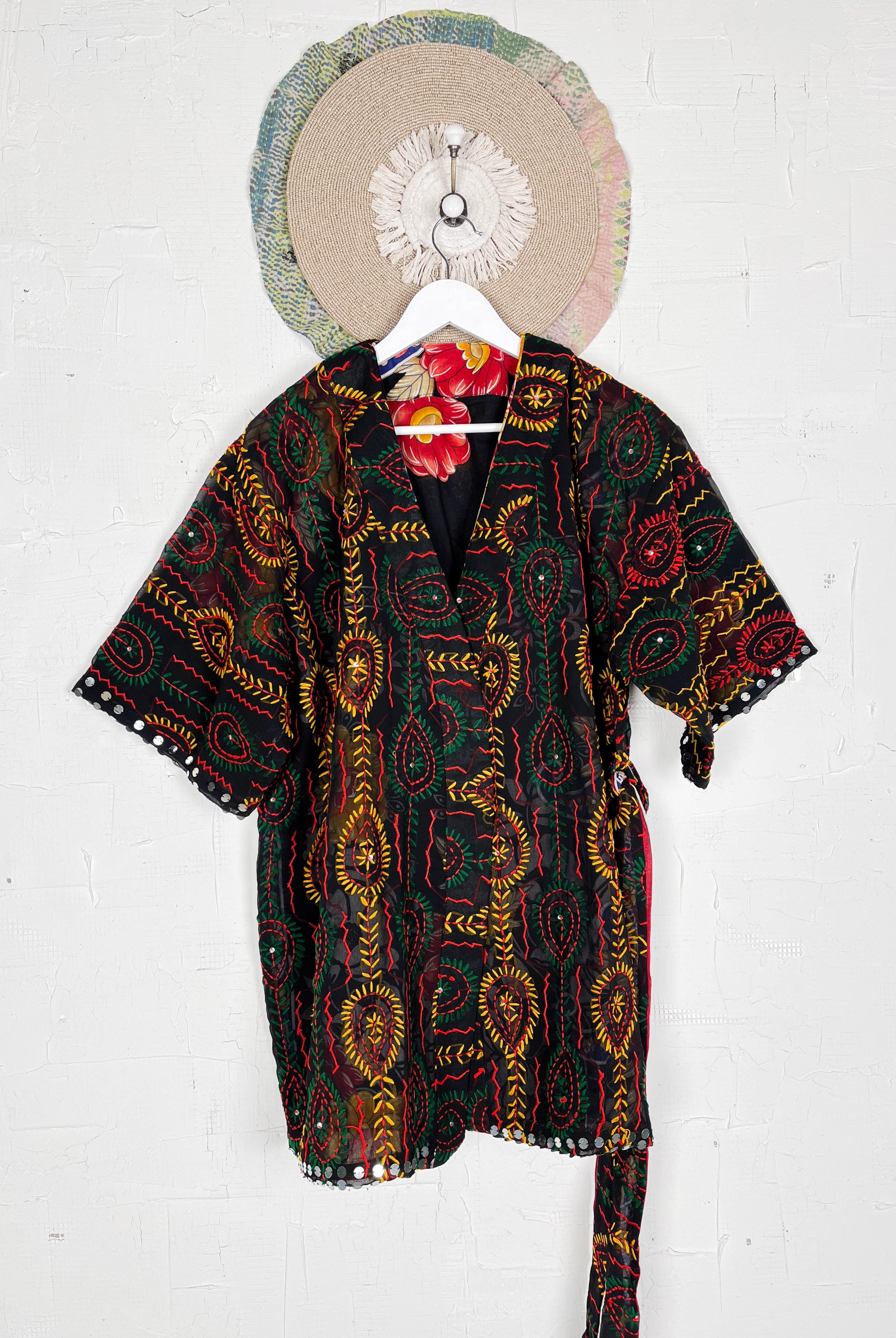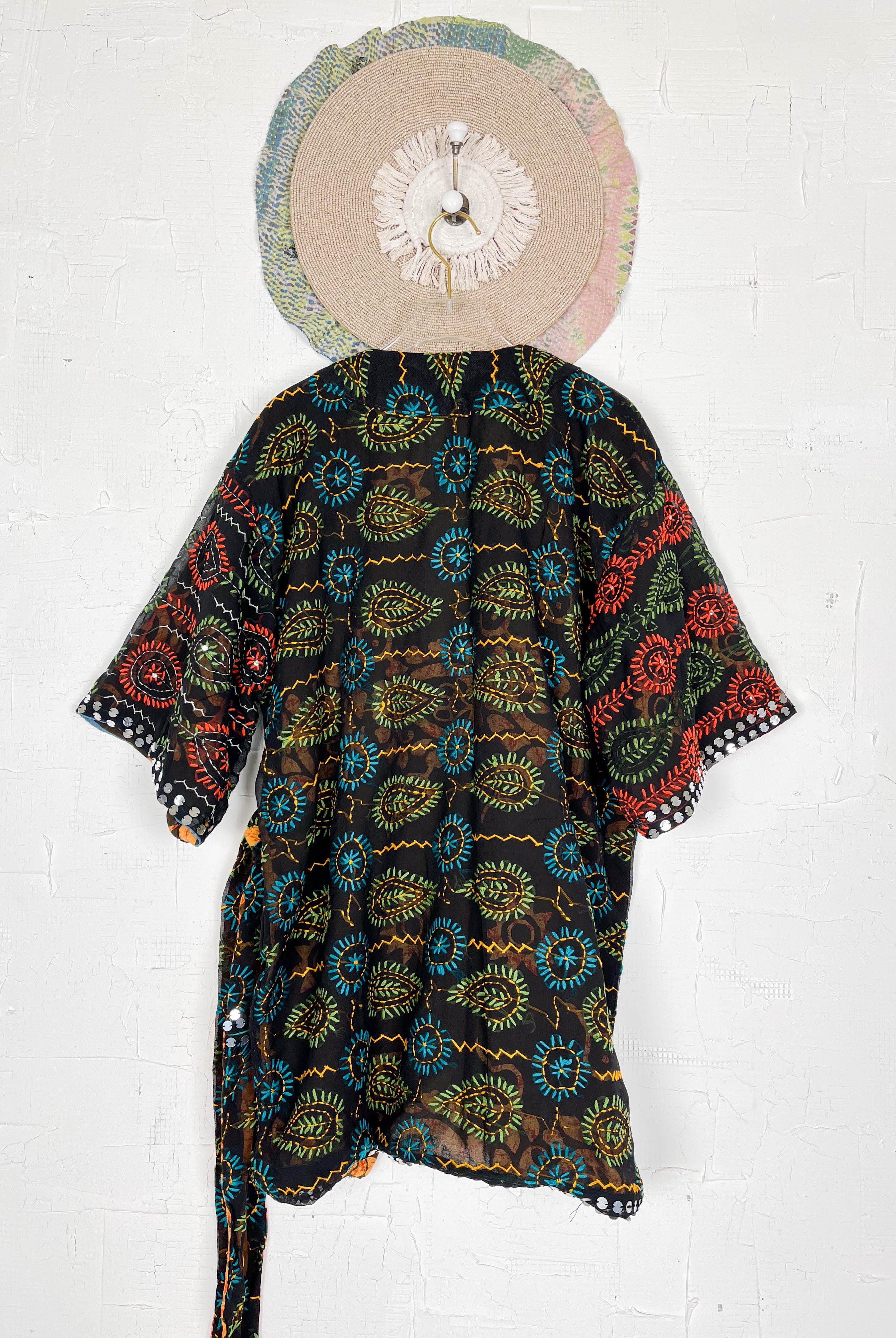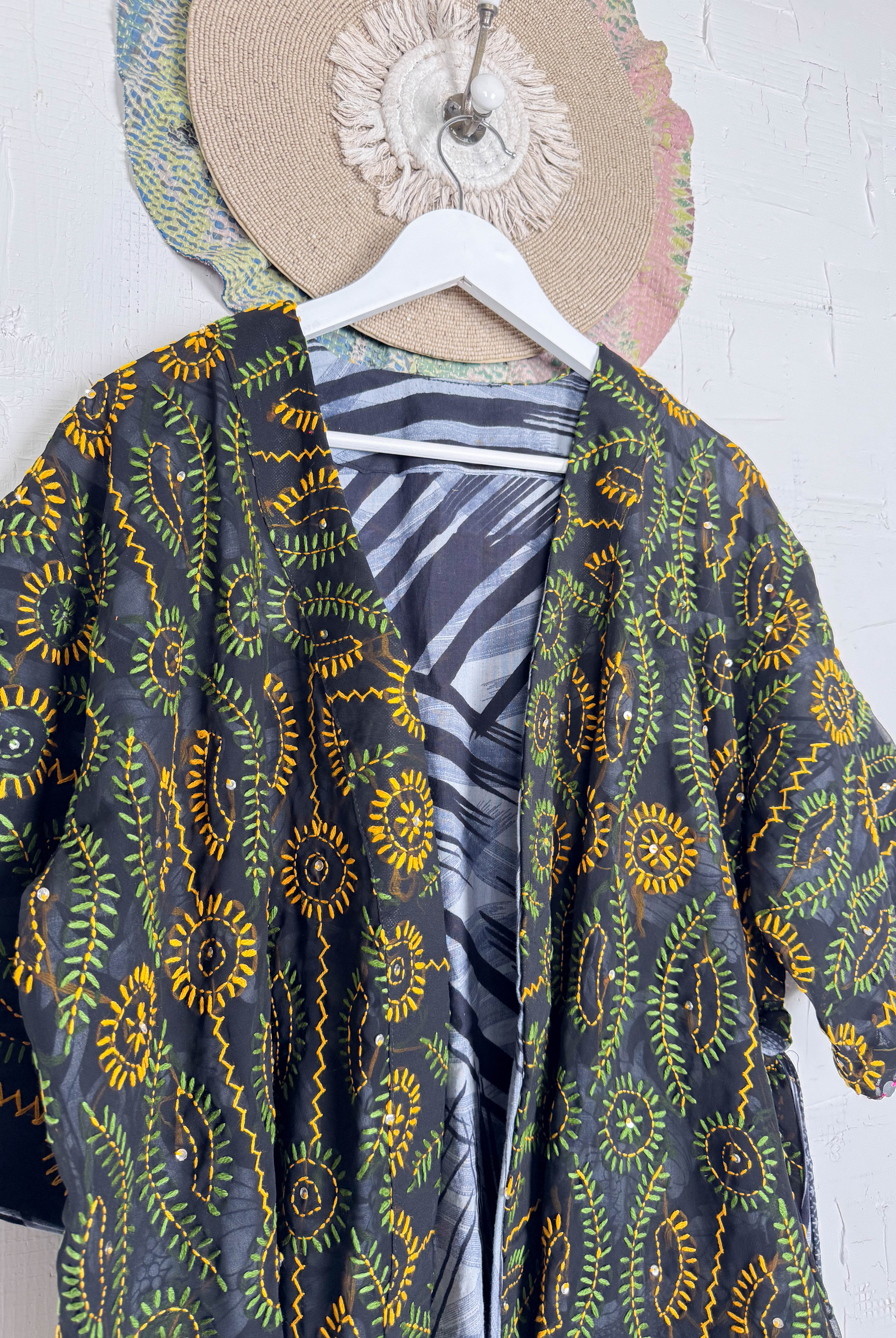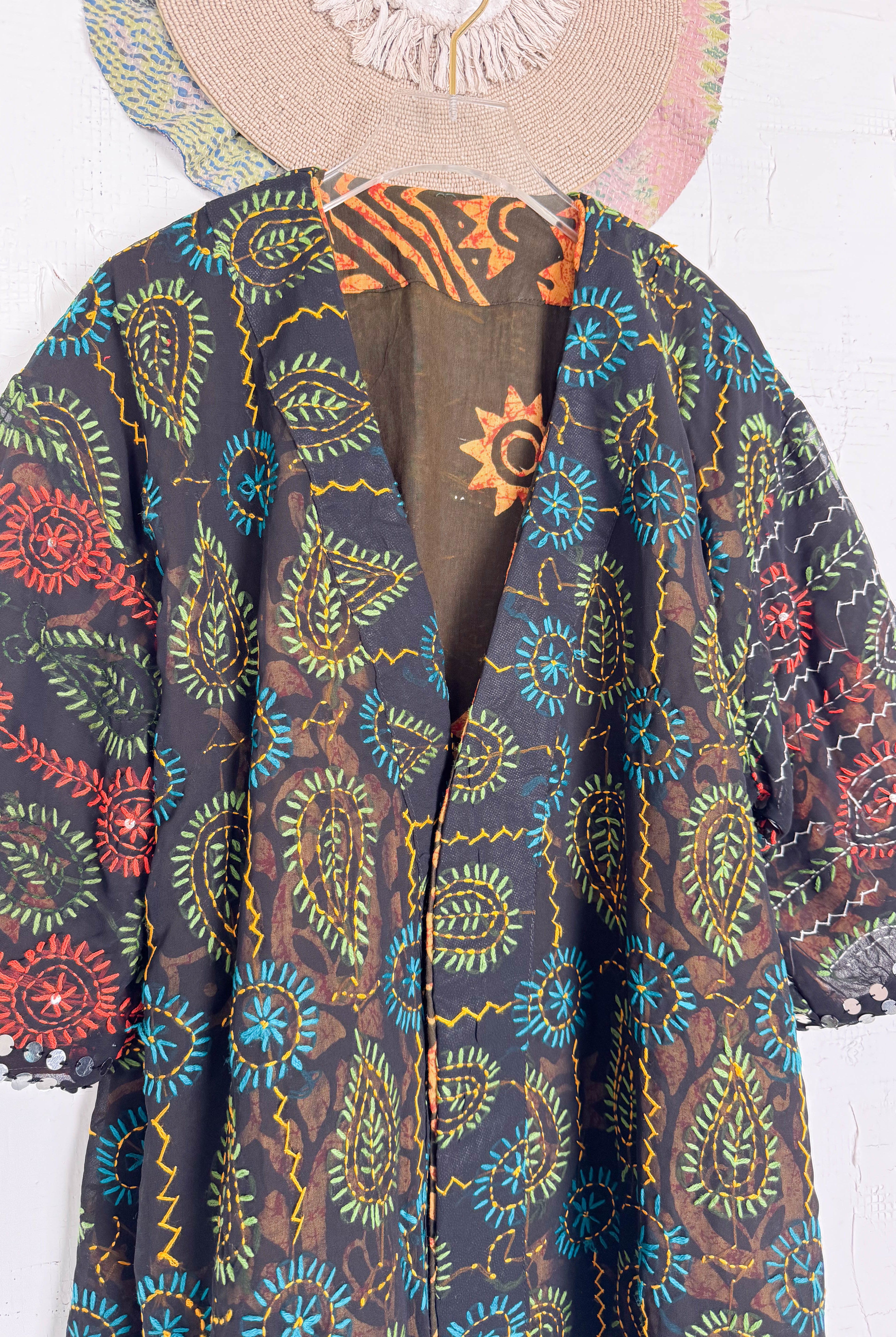 This handcrafted short Phulkari robe is a unique piece of wearable art, designed for daily elegance. Each hand-stitched floral motif, inspired by nature, creates a captivating texture and flow that flatters all body shapes and sizes. Lined with soft, vintage cotton, it offers a harmonious blend of traditional artistry and natural elements.