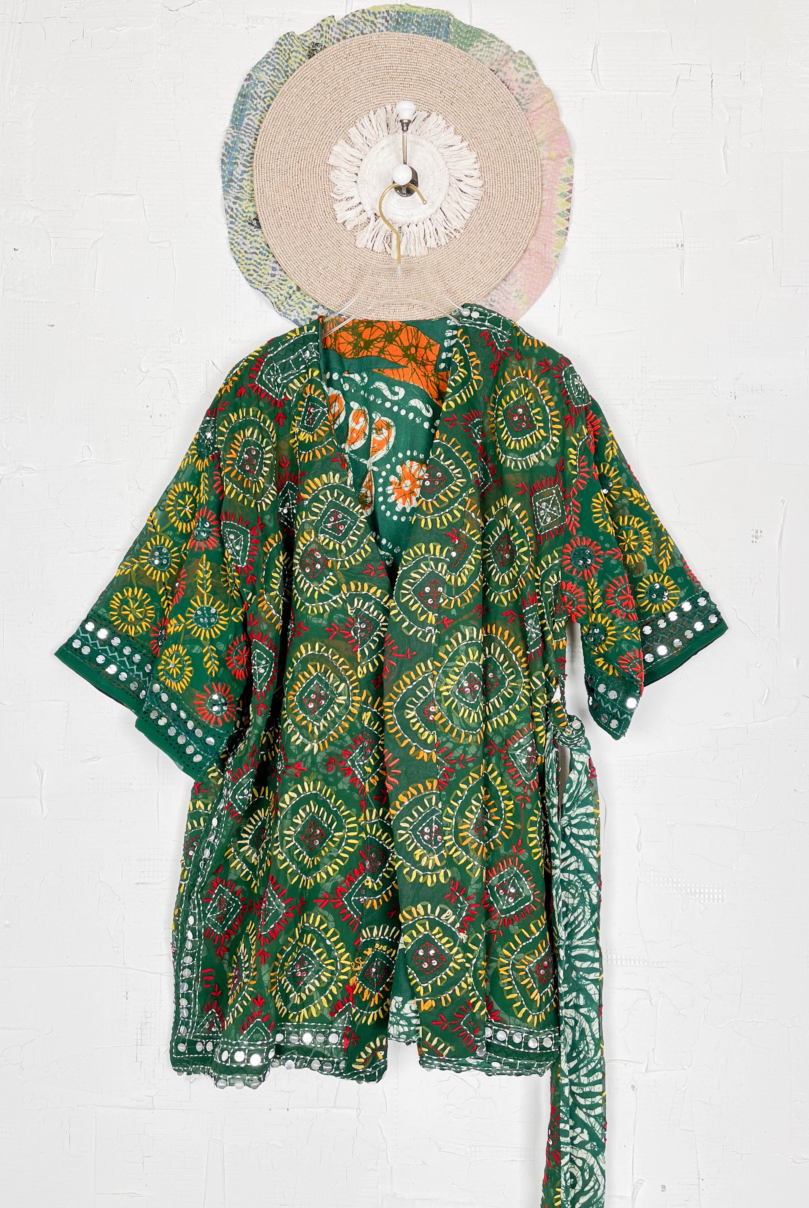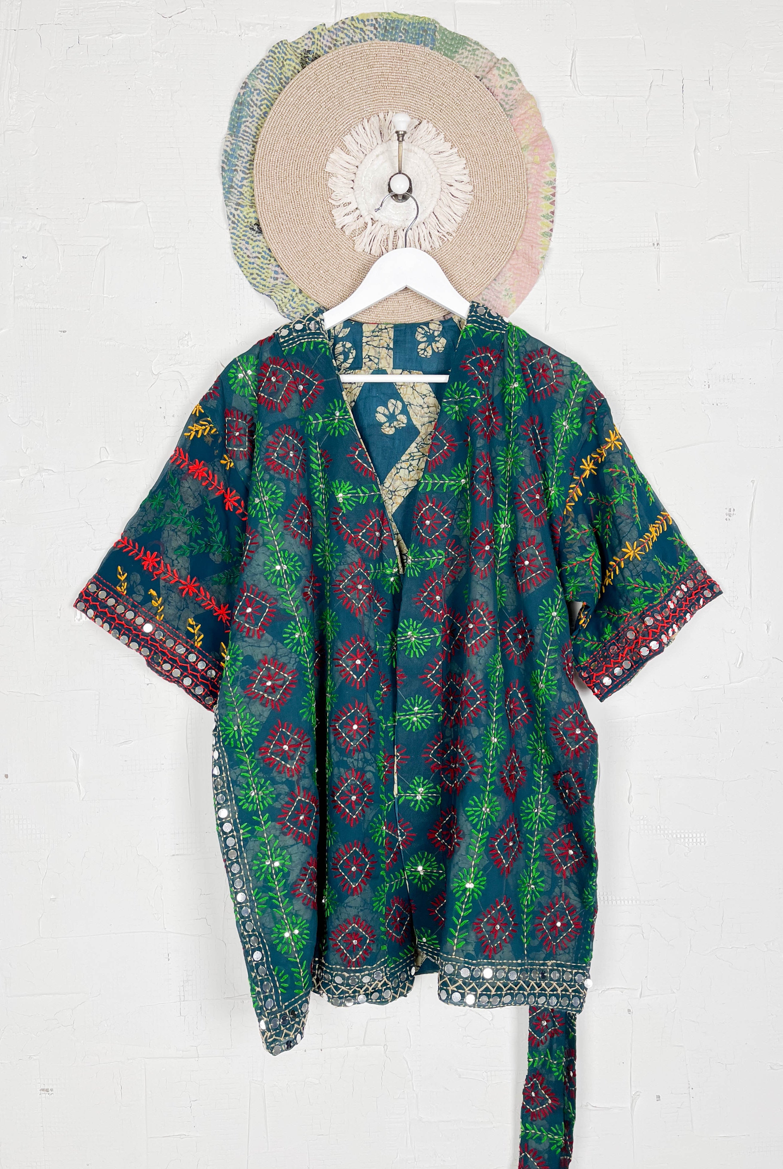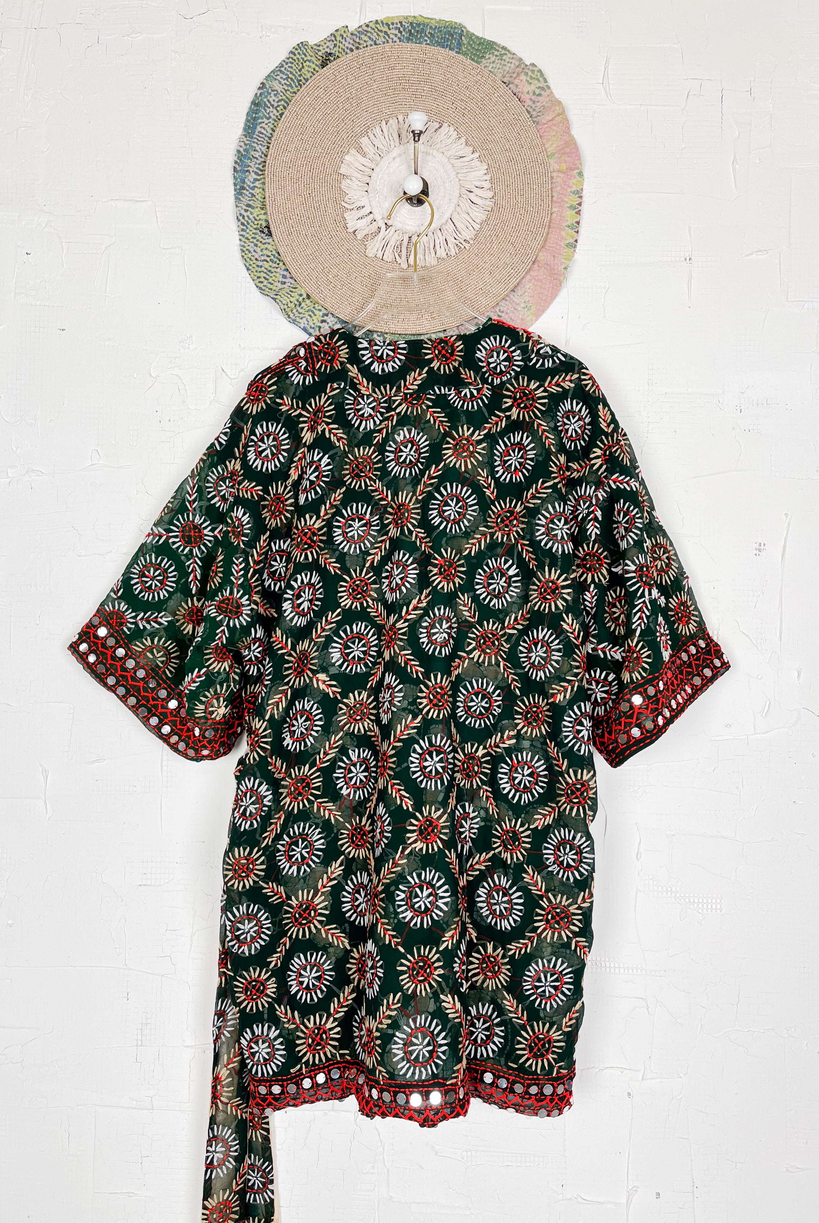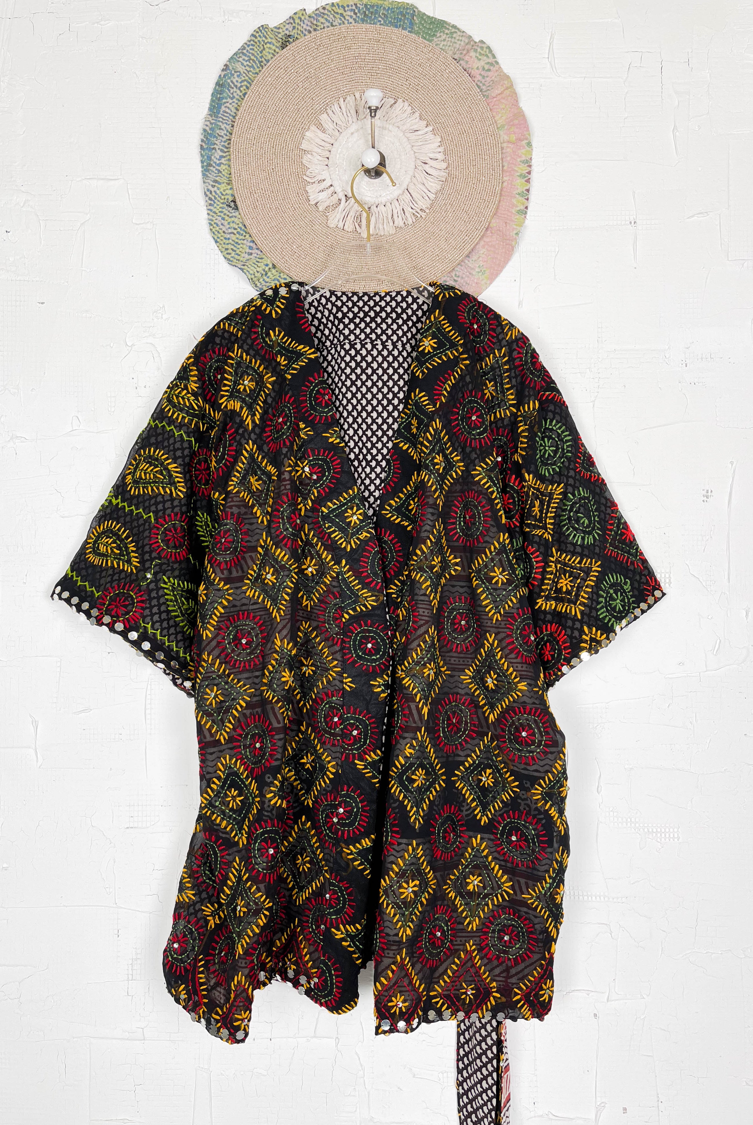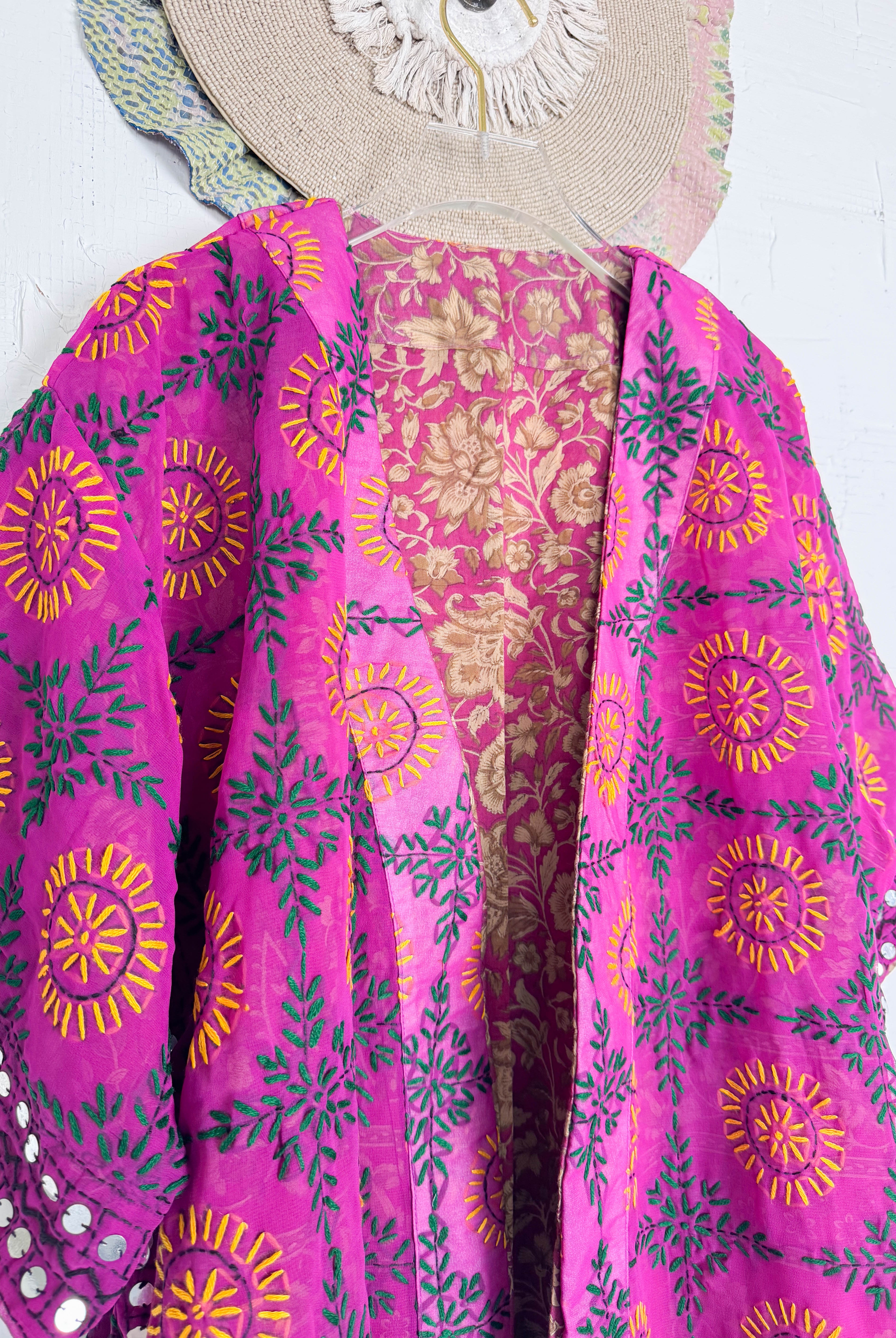 This handcrafted short Phulkari robe is a unique piece of wearable art, designed for daily elegance. Each hand-stitched floral motif, inspired by nature, creates a captivating texture and flow that flatters all body shapes and sizes. Lined with soft, vintage cotton, it offers a harmonious blend of traditional artistry and natural elements.