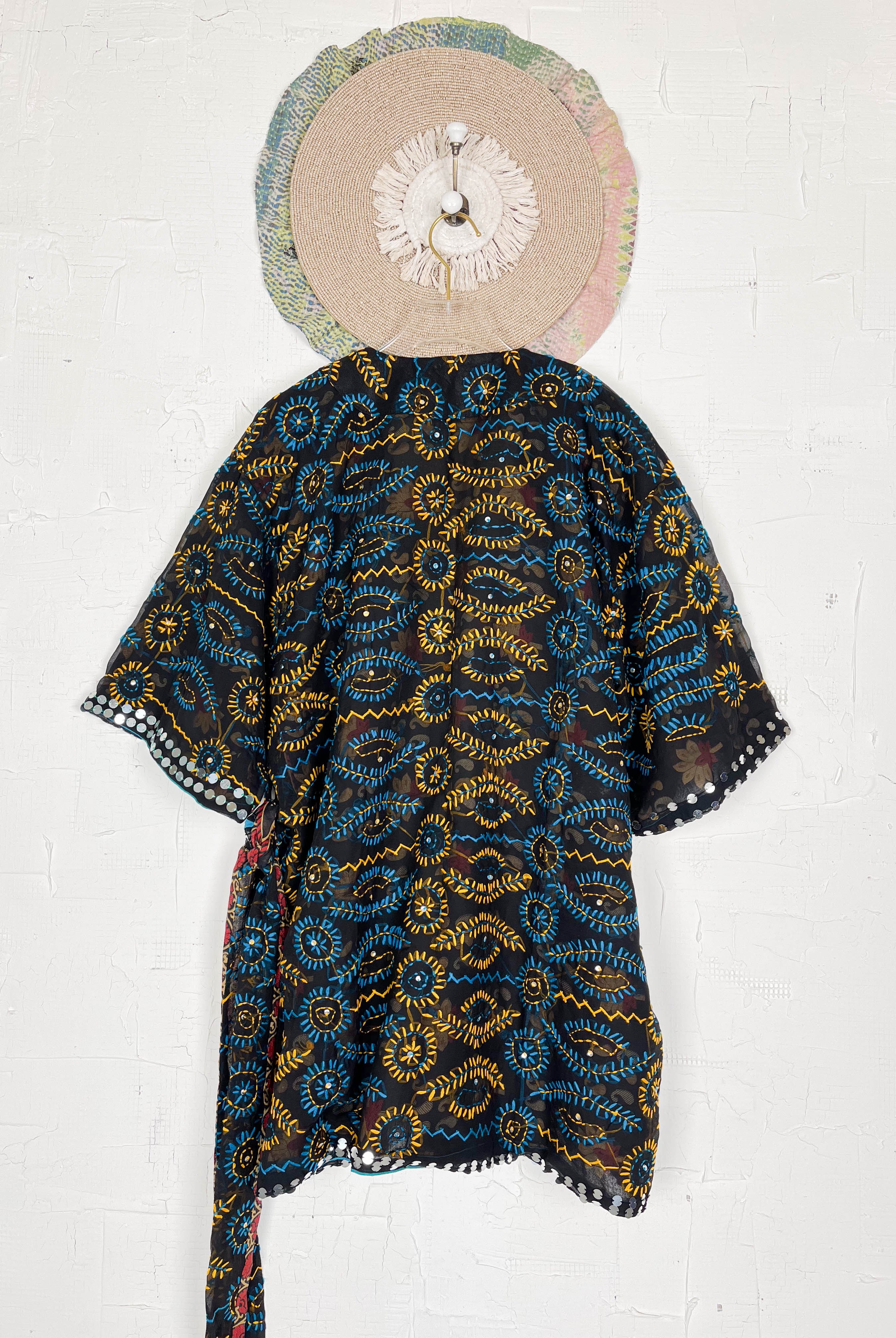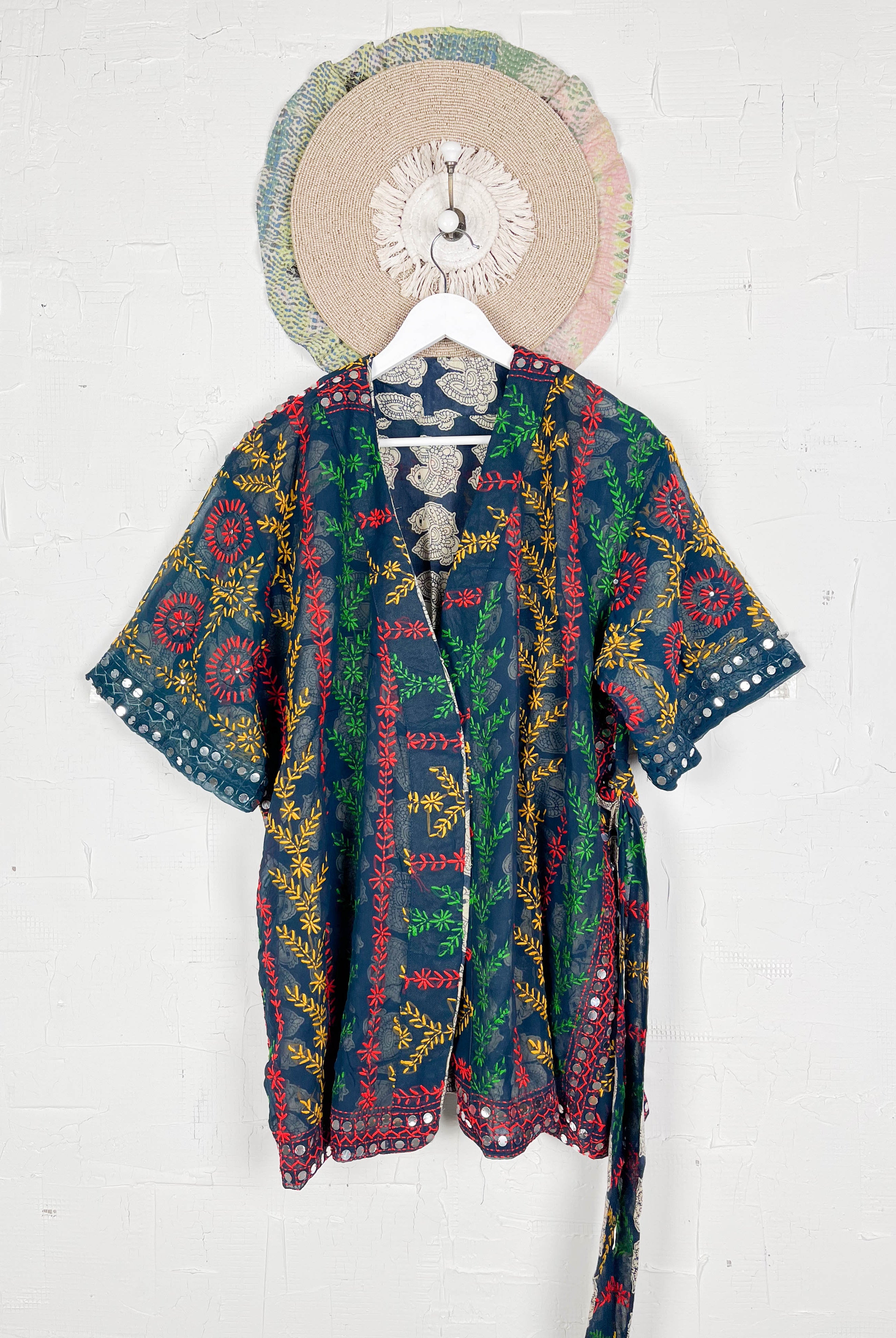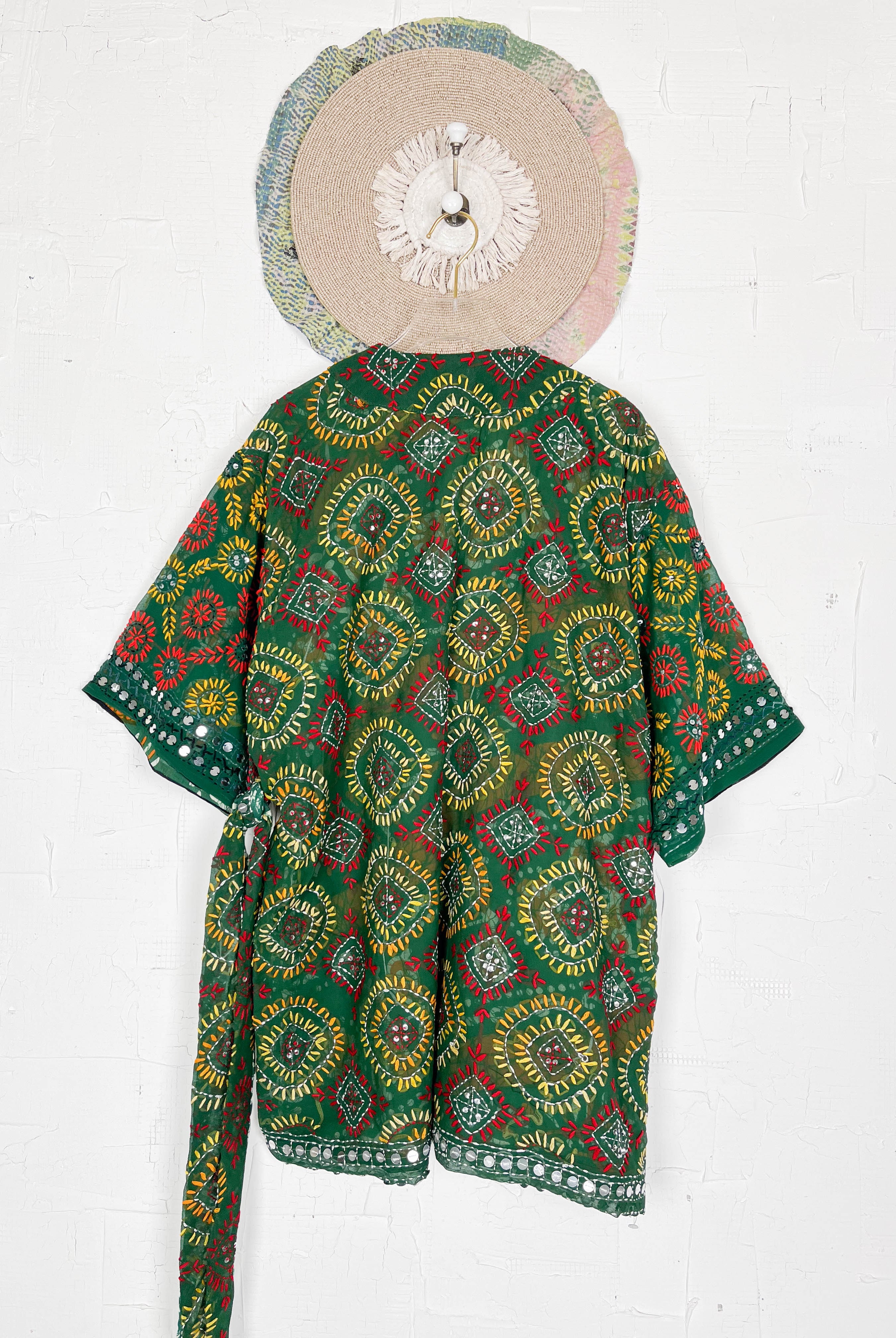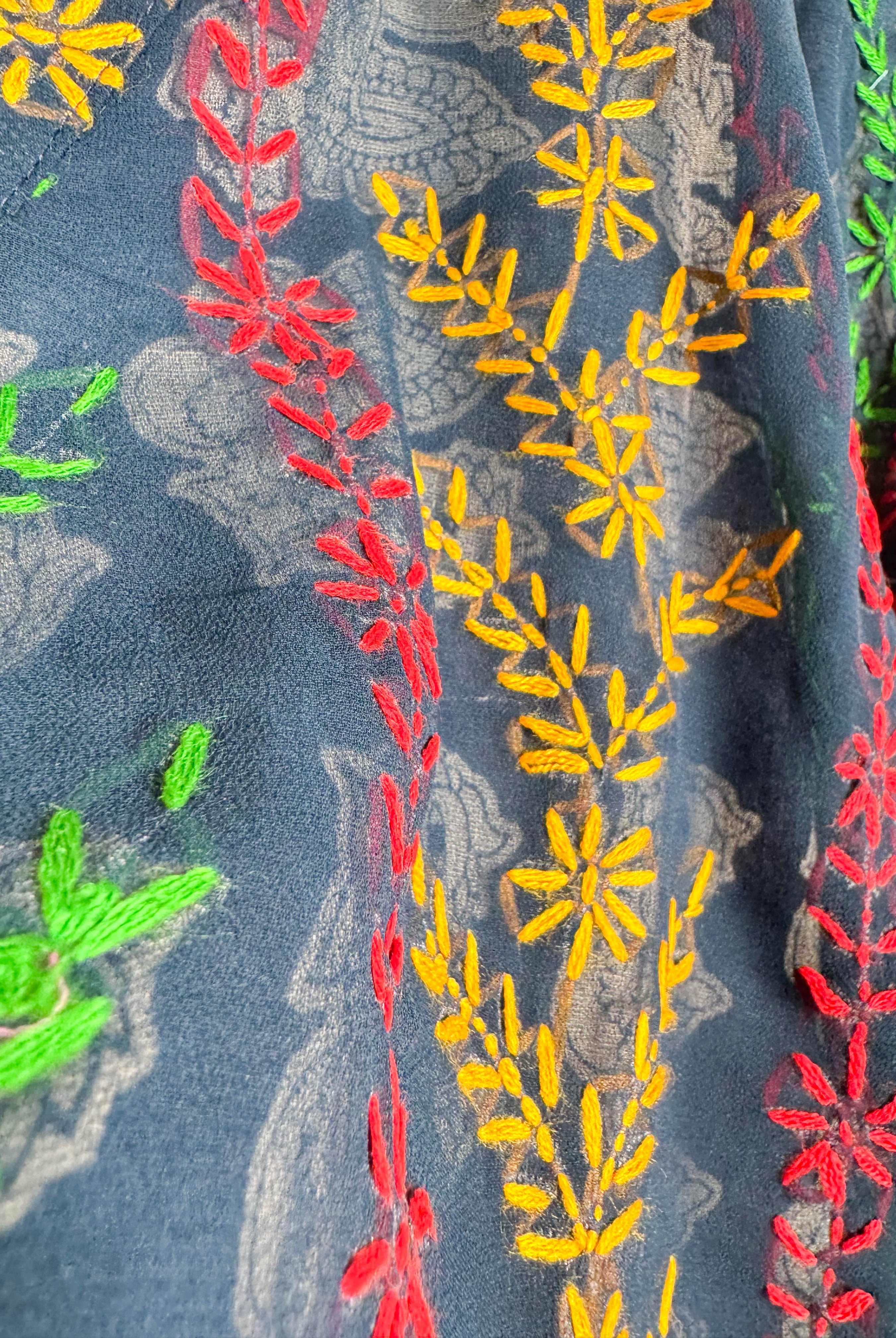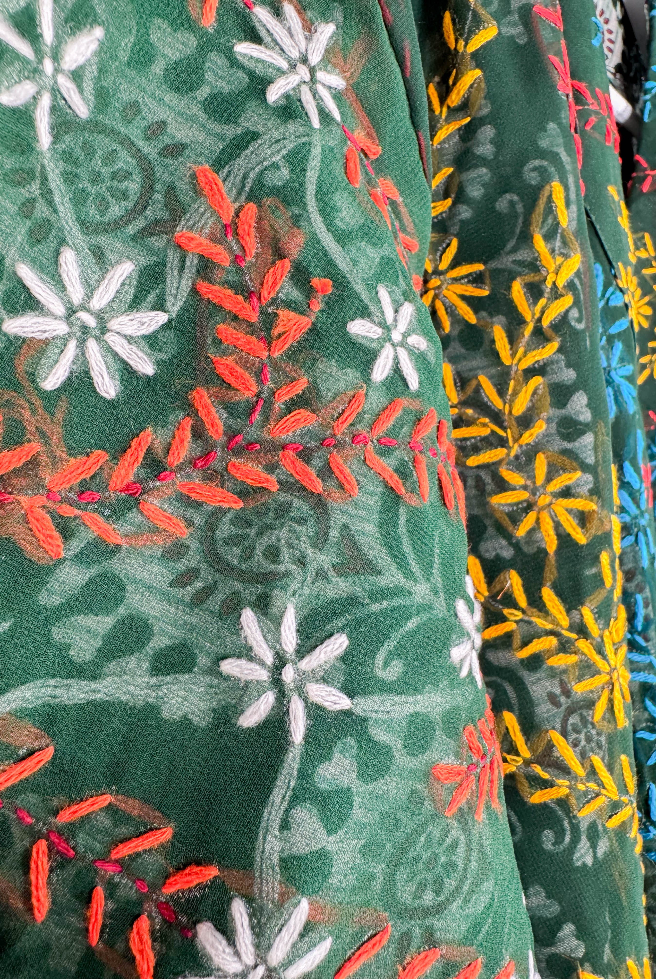 This handcrafted short Phulkari robe is a unique piece of wearable art, designed for daily elegance. Each hand-stitched floral motif, inspired by nature, creates a captivating texture and flow that flatters all body shapes and sizes. Lined with soft, vintage cotton, it offers a harmonious blend of traditional artistry and natural elements.