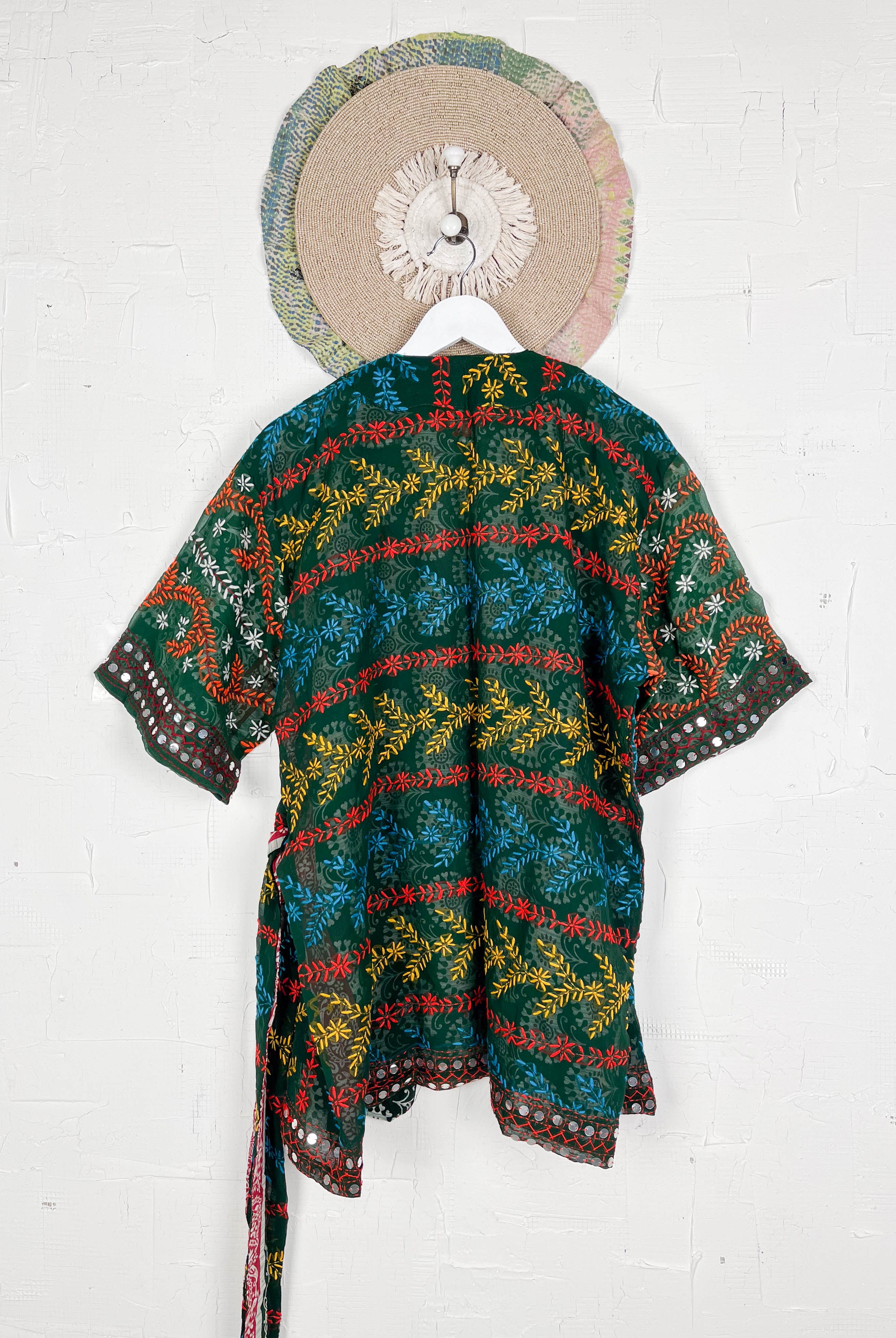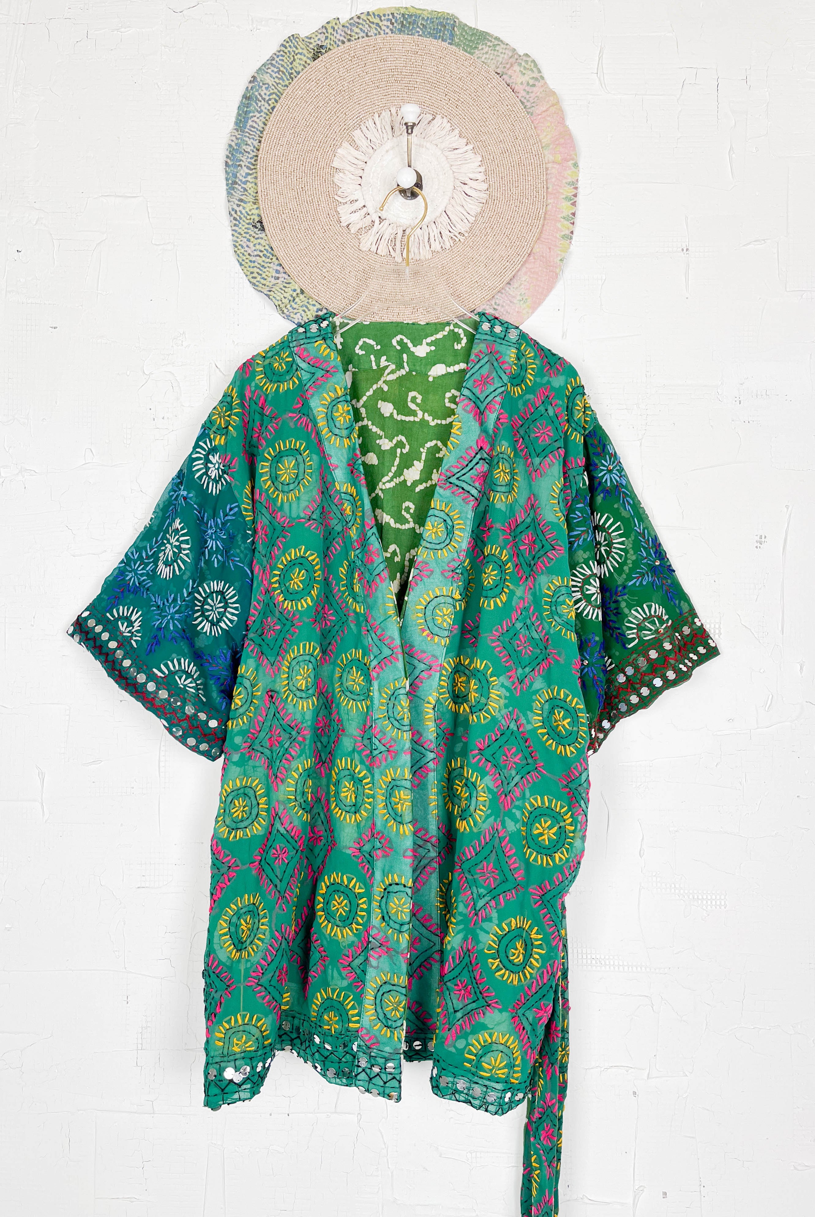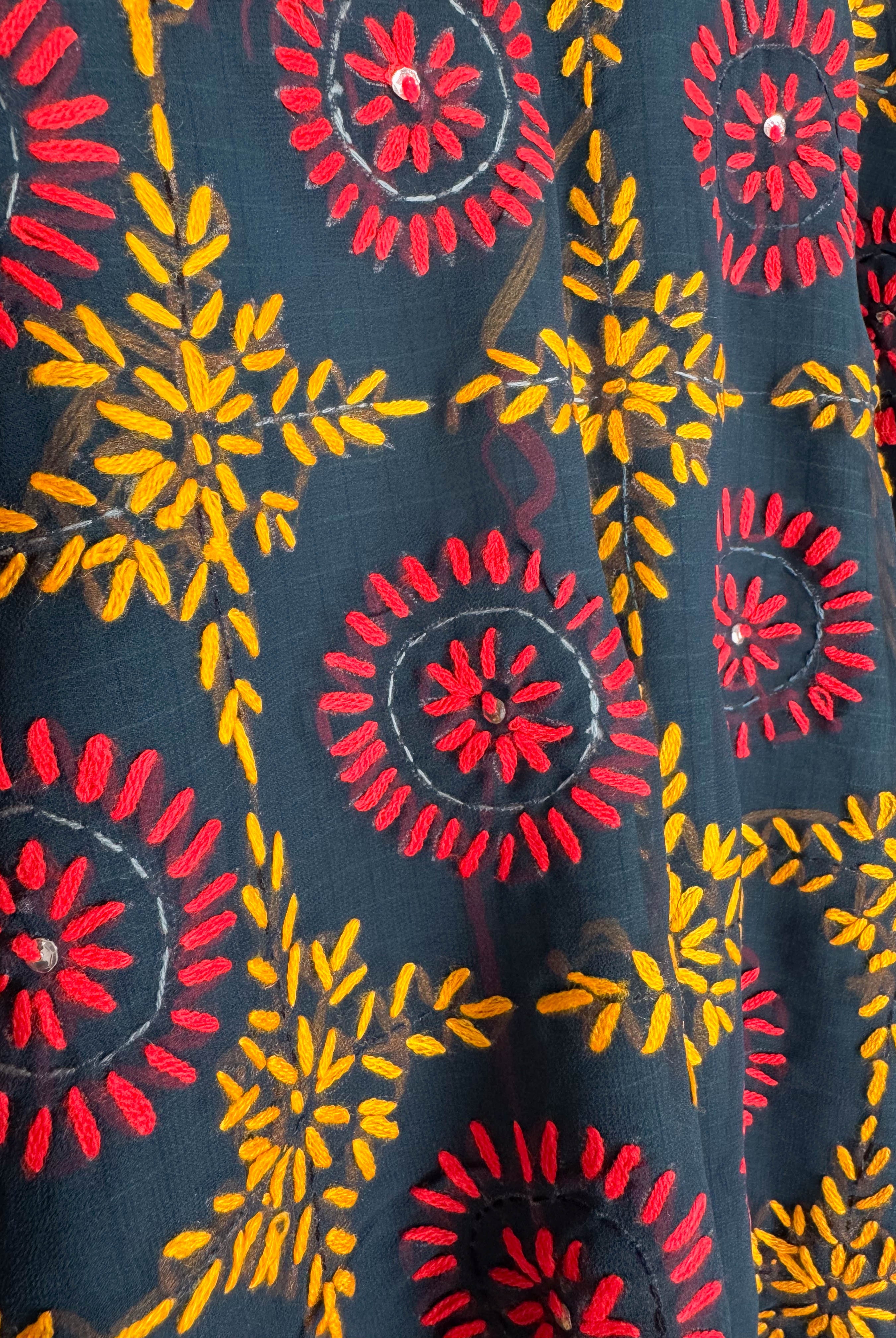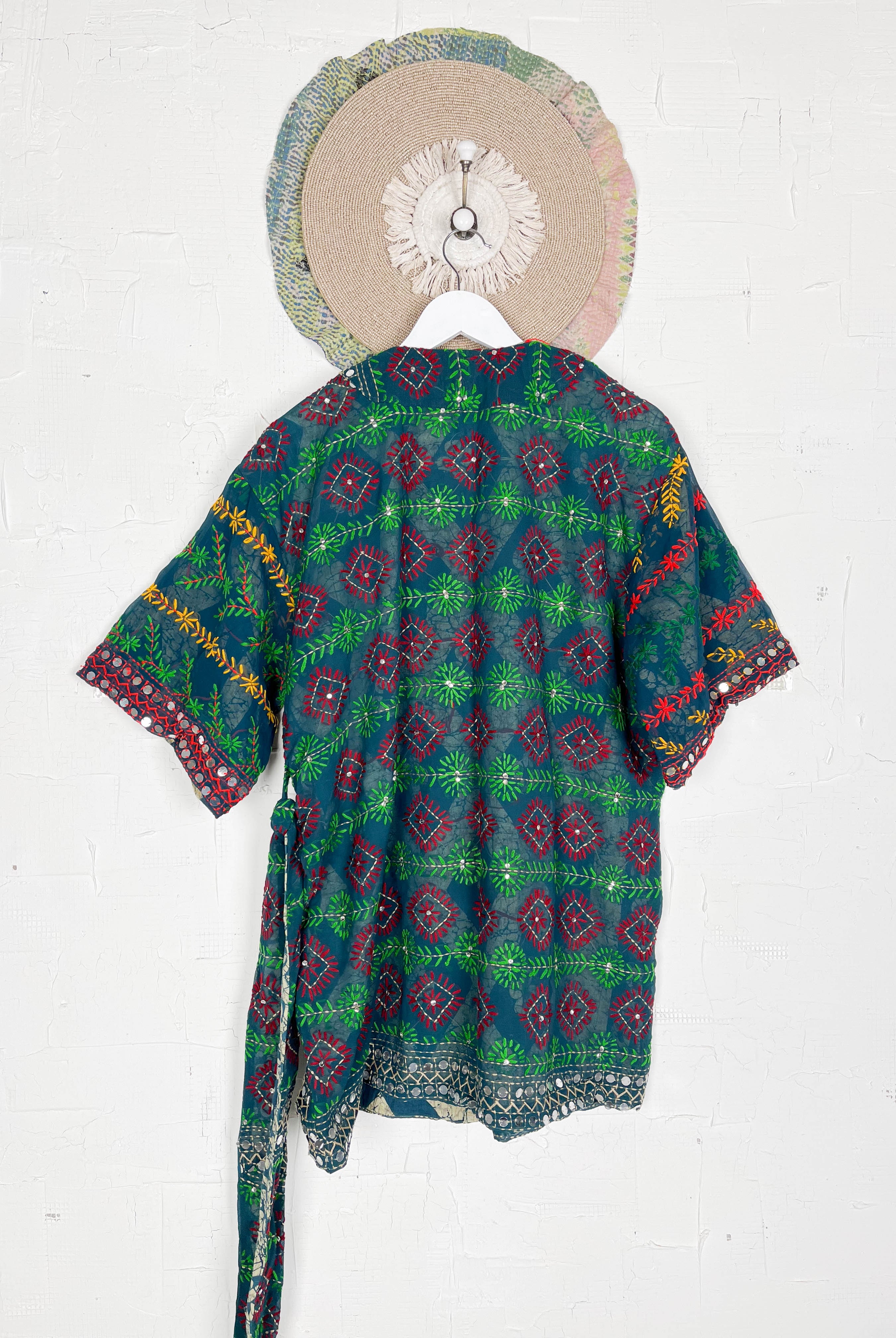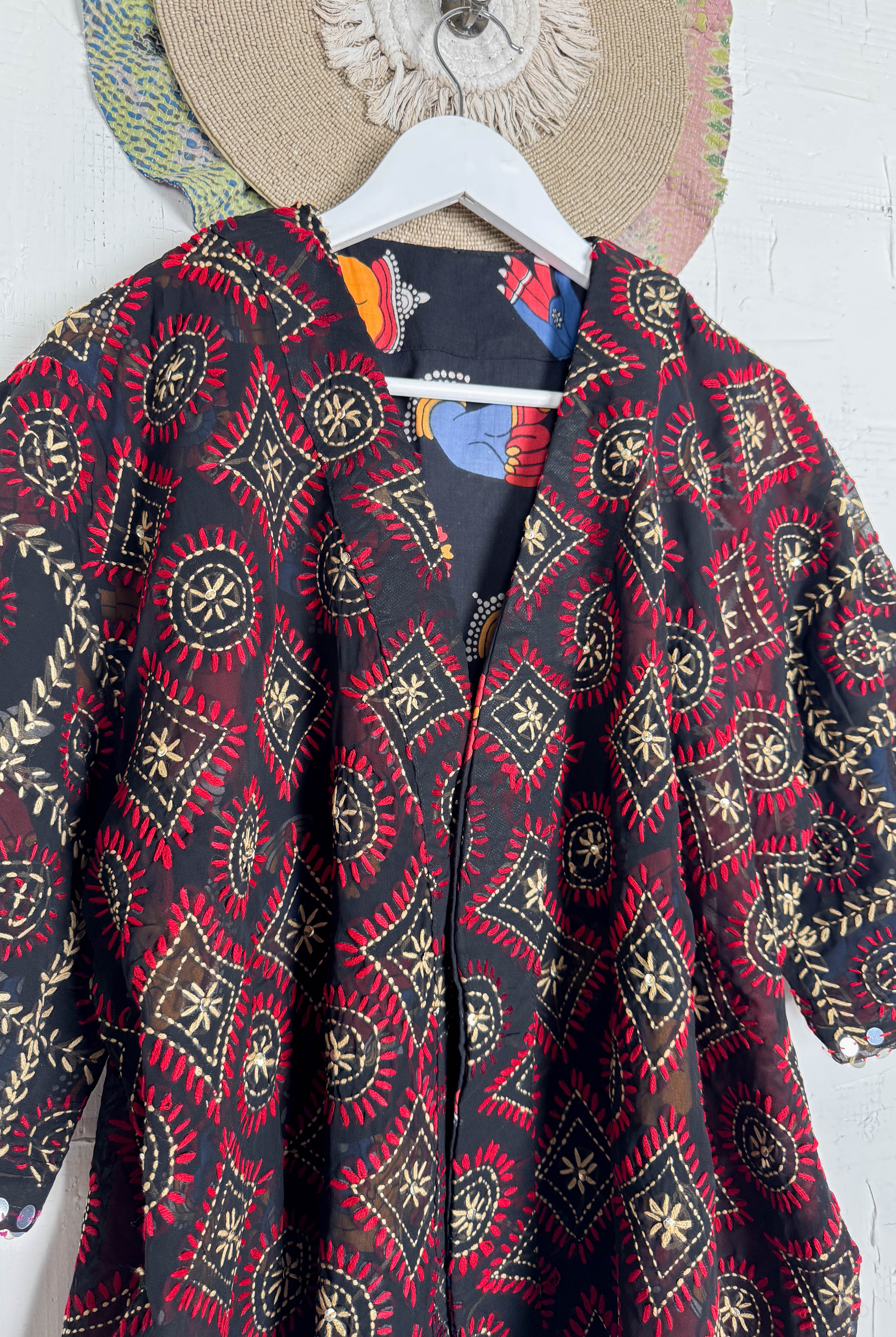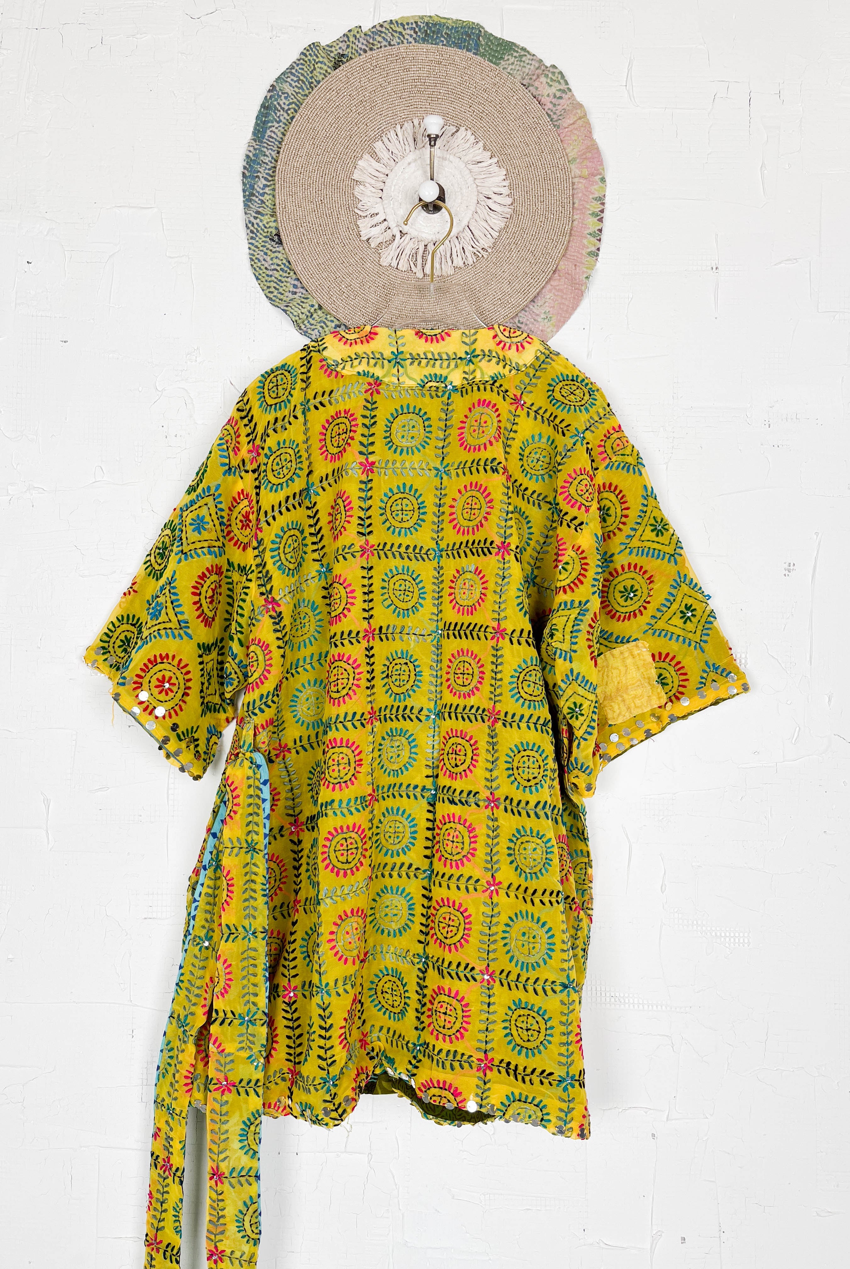 This handcrafted short Phulkari robe is a unique piece of wearable art, designed for daily elegance. Each hand-stitched floral motif, inspired by nature, creates a captivating texture and flow that flatters all body shapes and sizes. Lined with soft, vintage cotton, it offers a harmonious blend of traditional artistry and natural elements.